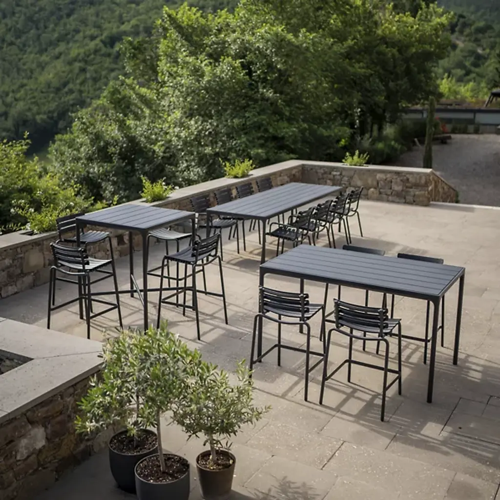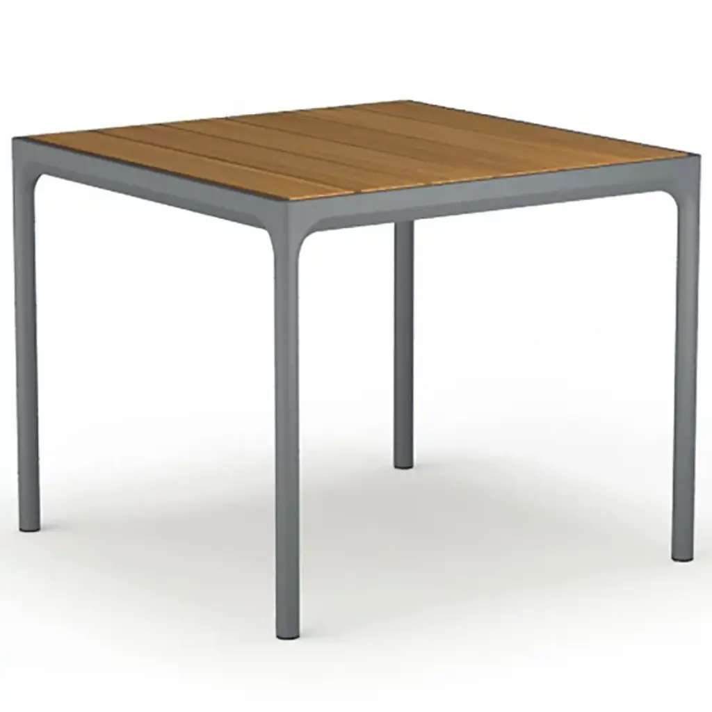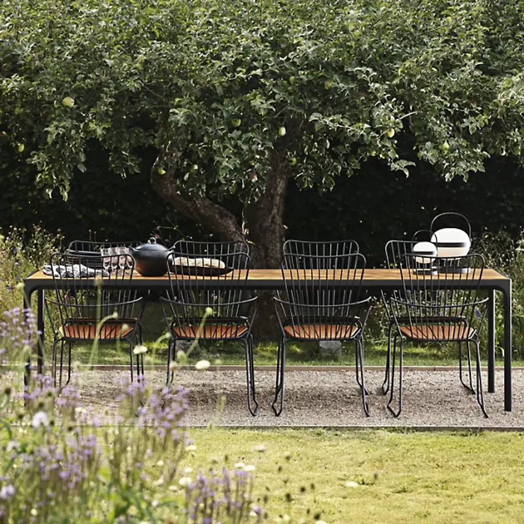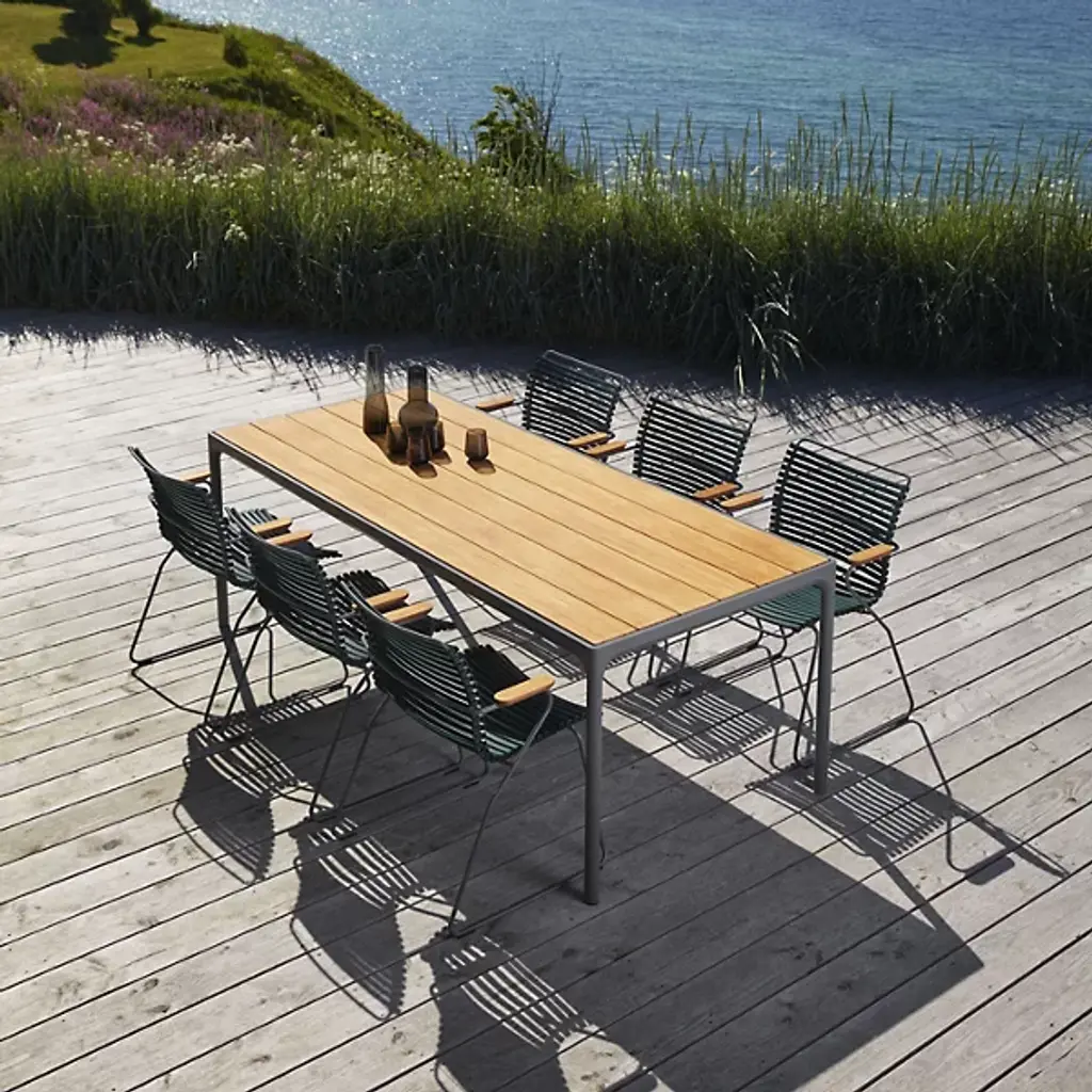 The Four Outdoor Dining Table Table from Houe is straightforward in name, comfort, and durability. Four legs stand with a slim profile to maximize room for one’s lower body. These legs transition into a rectilinear frame with extruded accents for a sophisticated look. The overall base shares a metal construction designed to withstand the elements outdoors. Up above, a slatted tabletop gives a nod to the classic picnic table. While catching the eyes, this slatted pattern filters water through its linear crevices for simple maintenance.