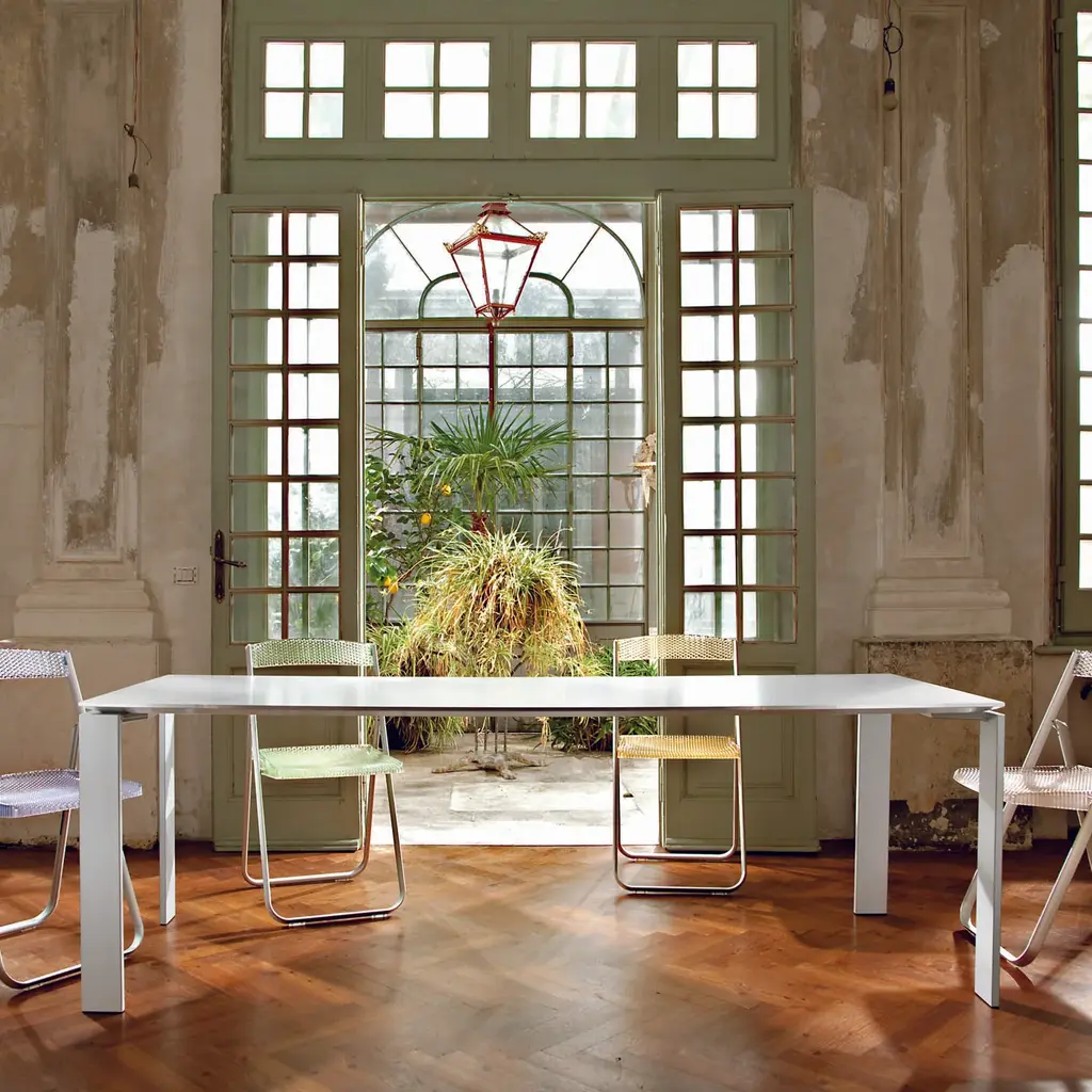 This functional and refined table also has a strict geometric design. Thanks to the elegant design solution, the position of the slim table top allows for the convenient positioning of drawers or storage furnishings for computer hardware. They can be placed side-by-side to form office workstations. Features