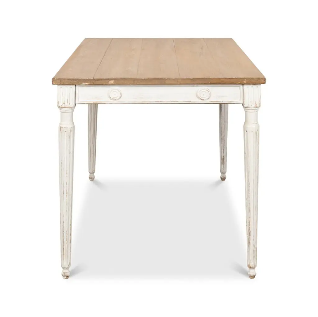 French Country rustic style dining table with pine top. The table apron has medallion accents and sits upon white distressed turned, tapered, and fluted legs. Dimensions: 63" W x 32" D x 31" H Modern reproduction antiqued to look old.