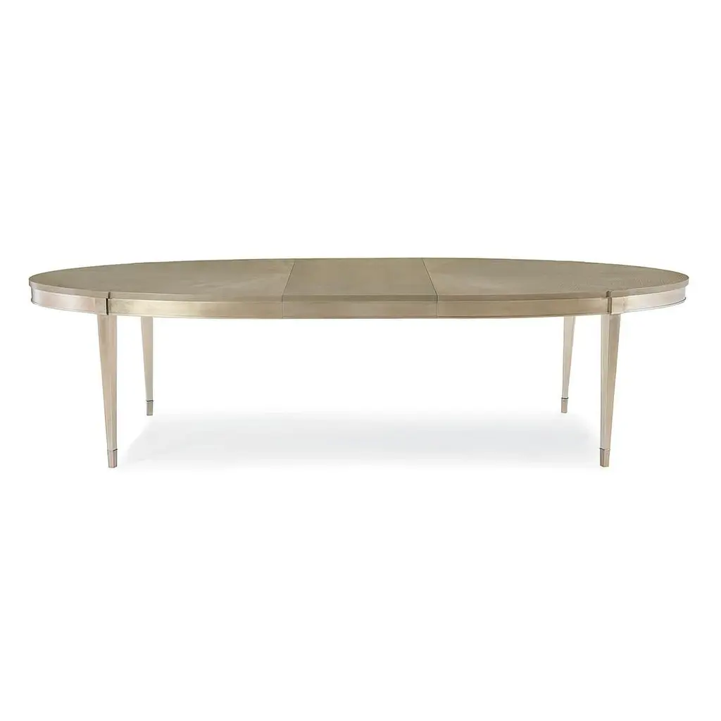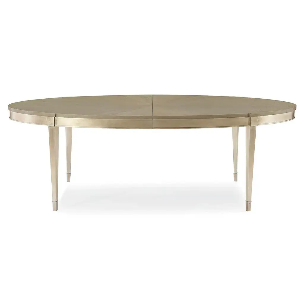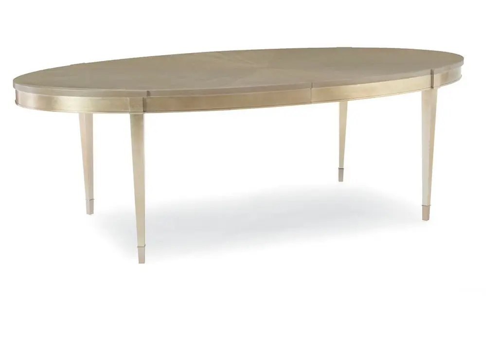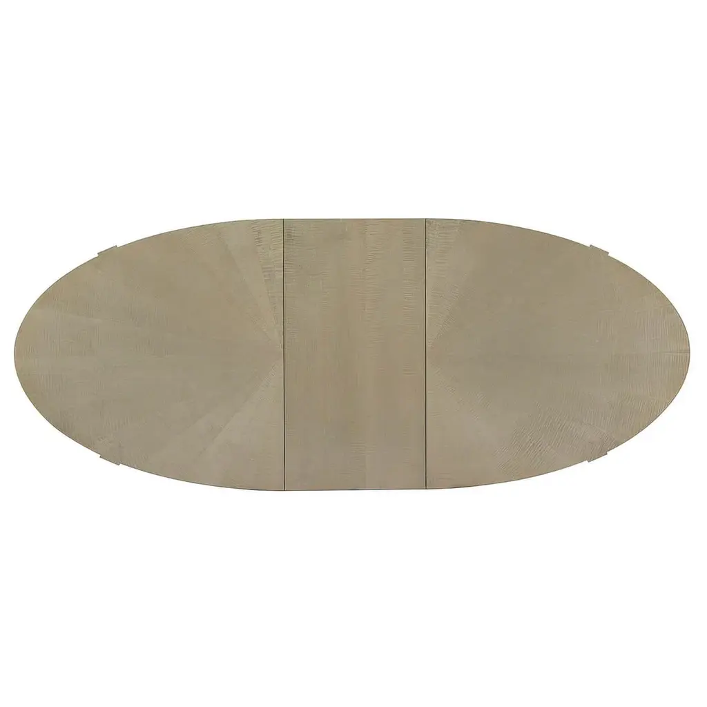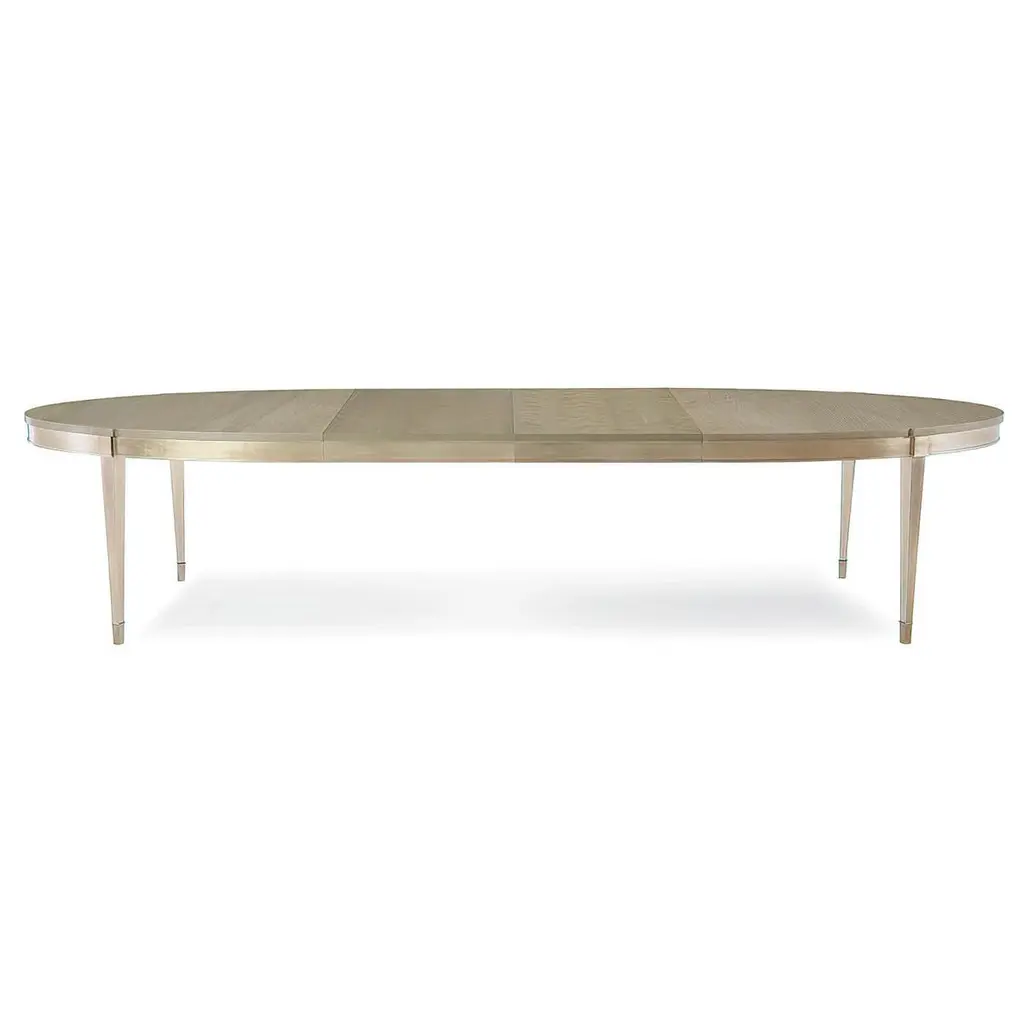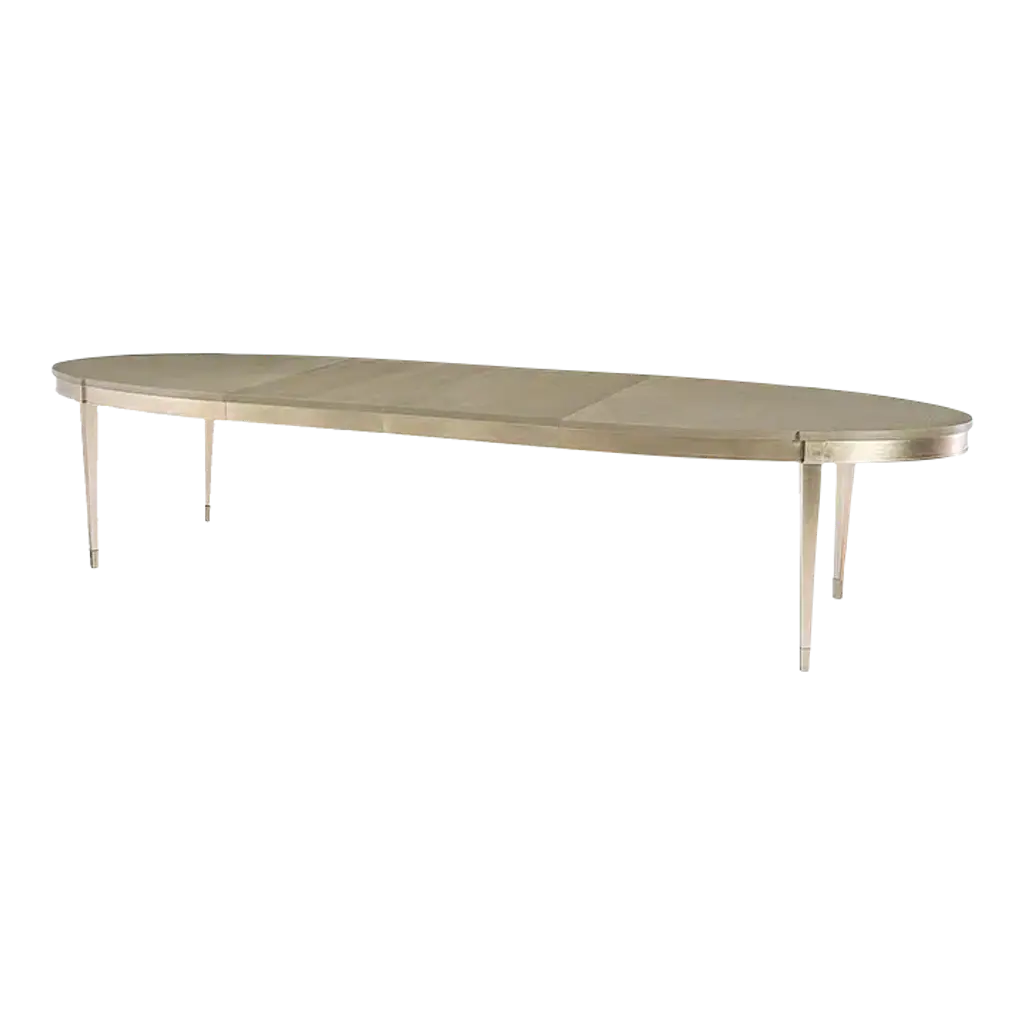 A French neoclassical style oval extending dining table with an exquisite radial-matched Fumed Figured Tiger Maple veneer top finished in Smoke with Taupe Silver Leaf accents. Metal ferrules adorn its legs for a dramatic finishing touch.DimensionsOpen: 138" W x 46" D x 30" HClosed: 90" W x 46" D x 30" HIncludes two 24" leavesLearance under apron: 25.375".