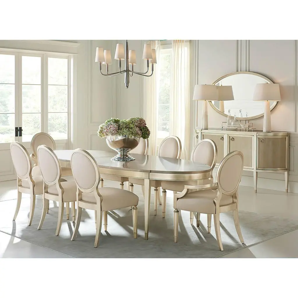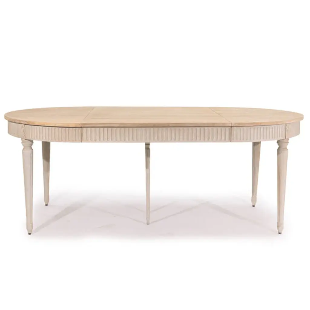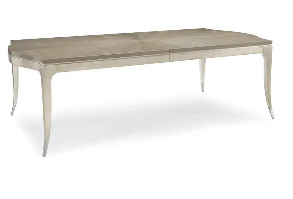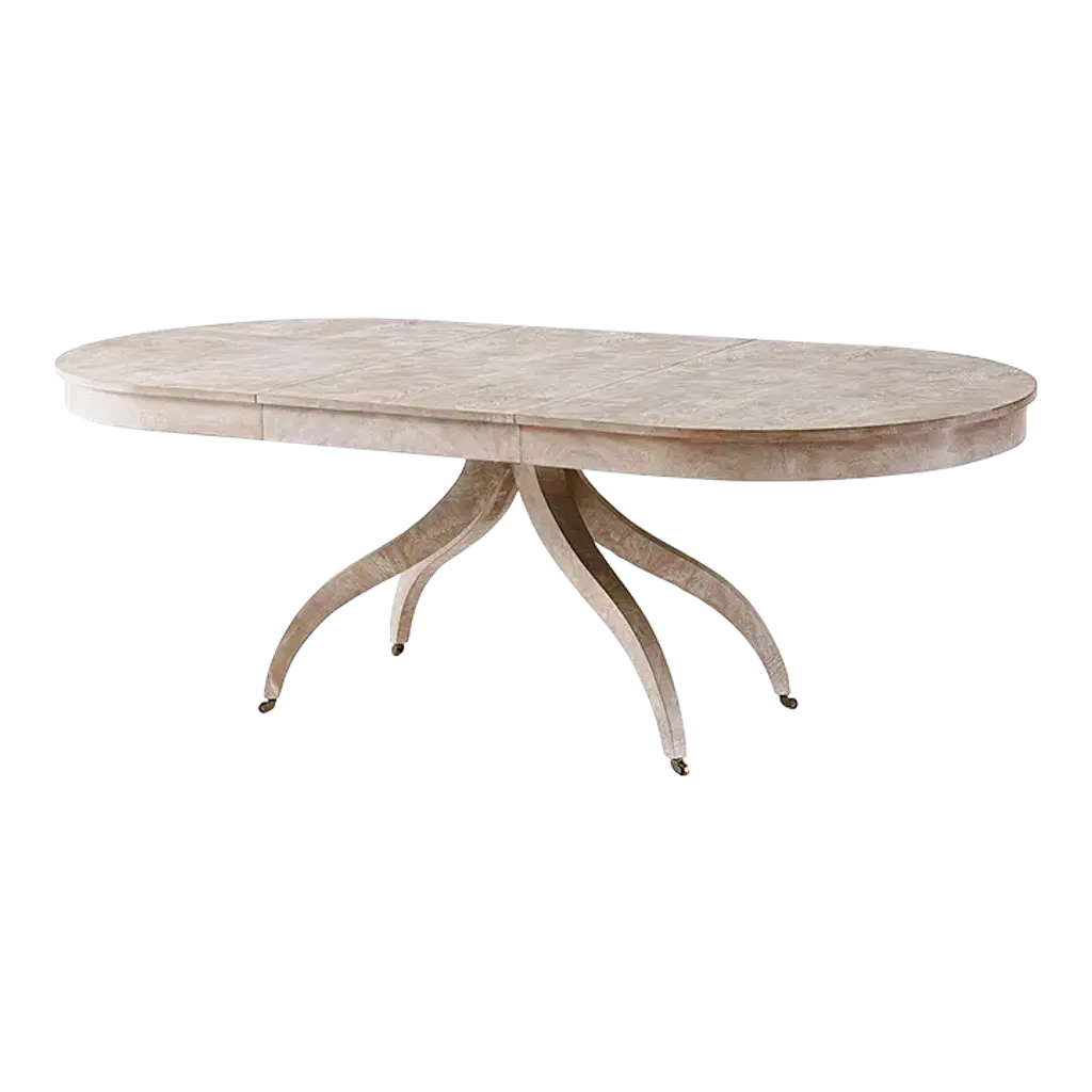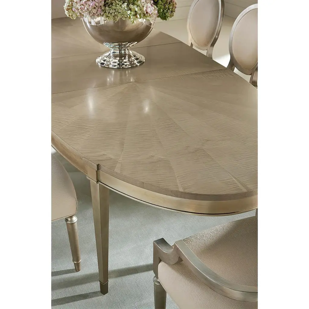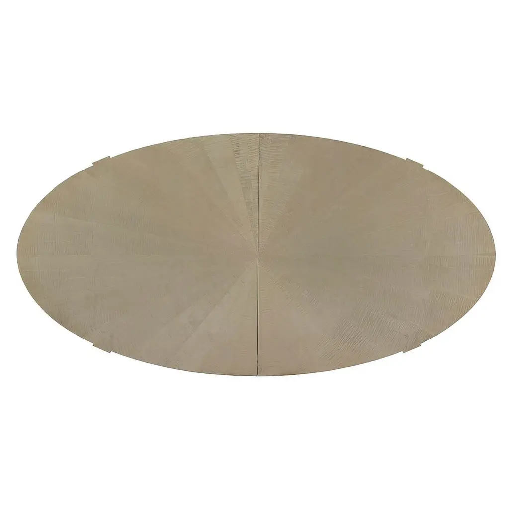 A French neoclassical style oval extending dining table with an exquisite radial-matched Fumed Figured Tiger Maple veneer top finished in Smoke with Taupe Silver Leaf accents. Metal ferrules adorn its legs for a dramatic finishing touch.DimensionsOpen: 138" W x 46" D x 30" HClosed: 90" W x 46" D x 30" HIncludes two 24" leavesLearance under apron: 25.375".