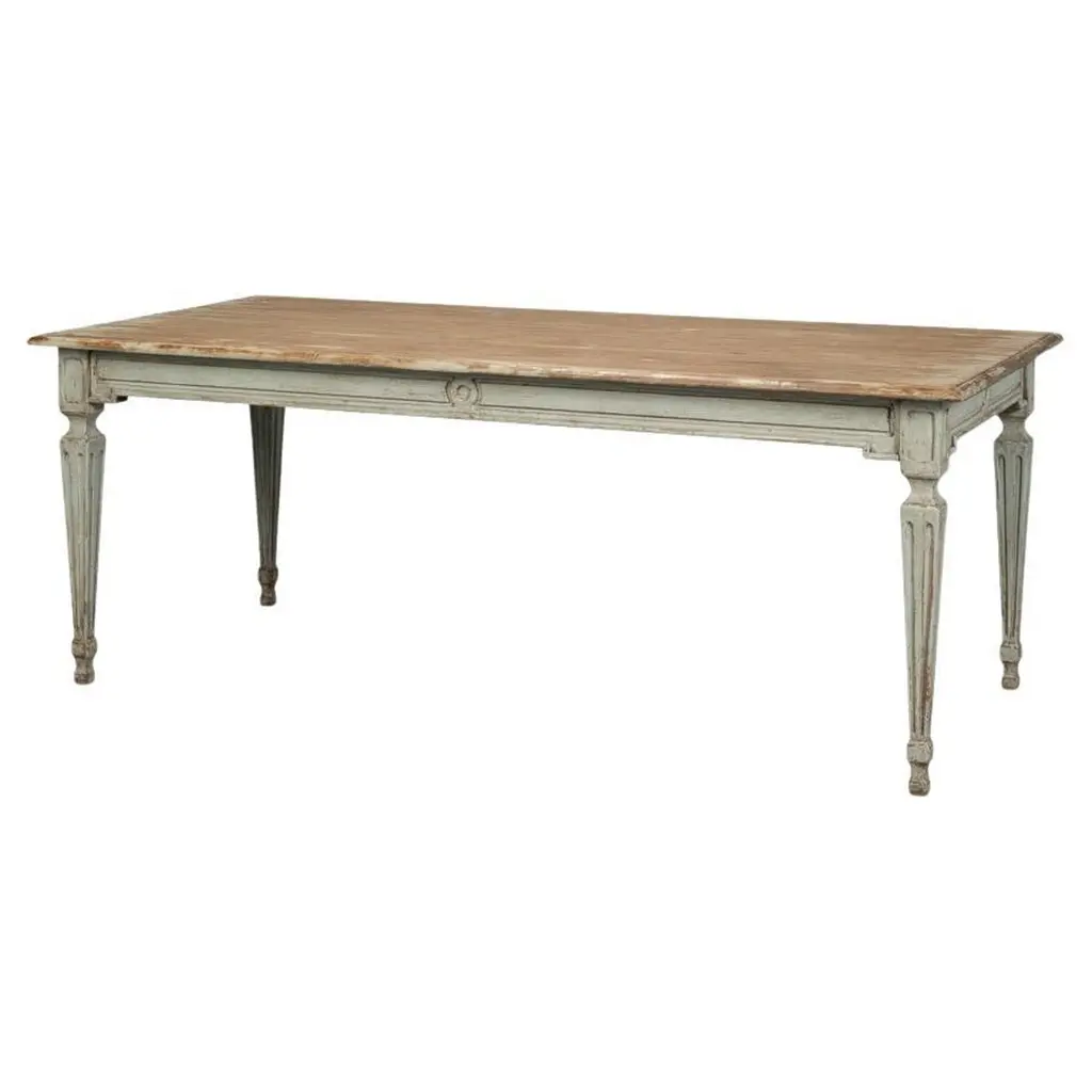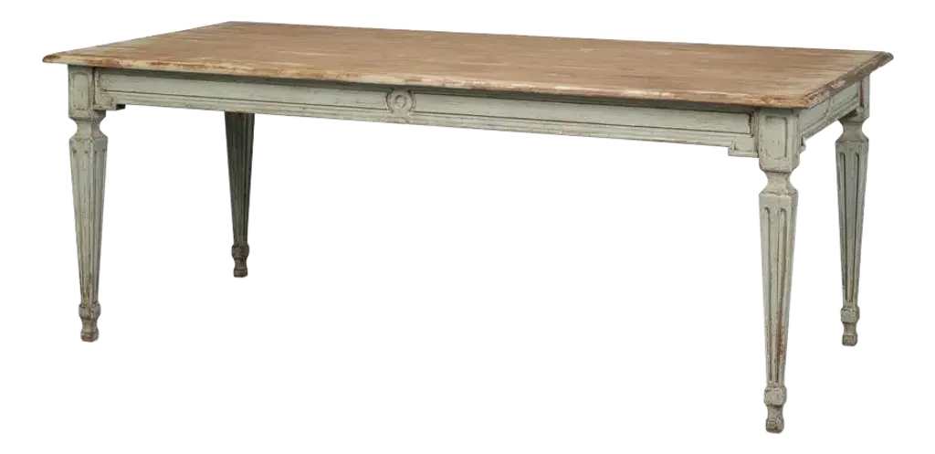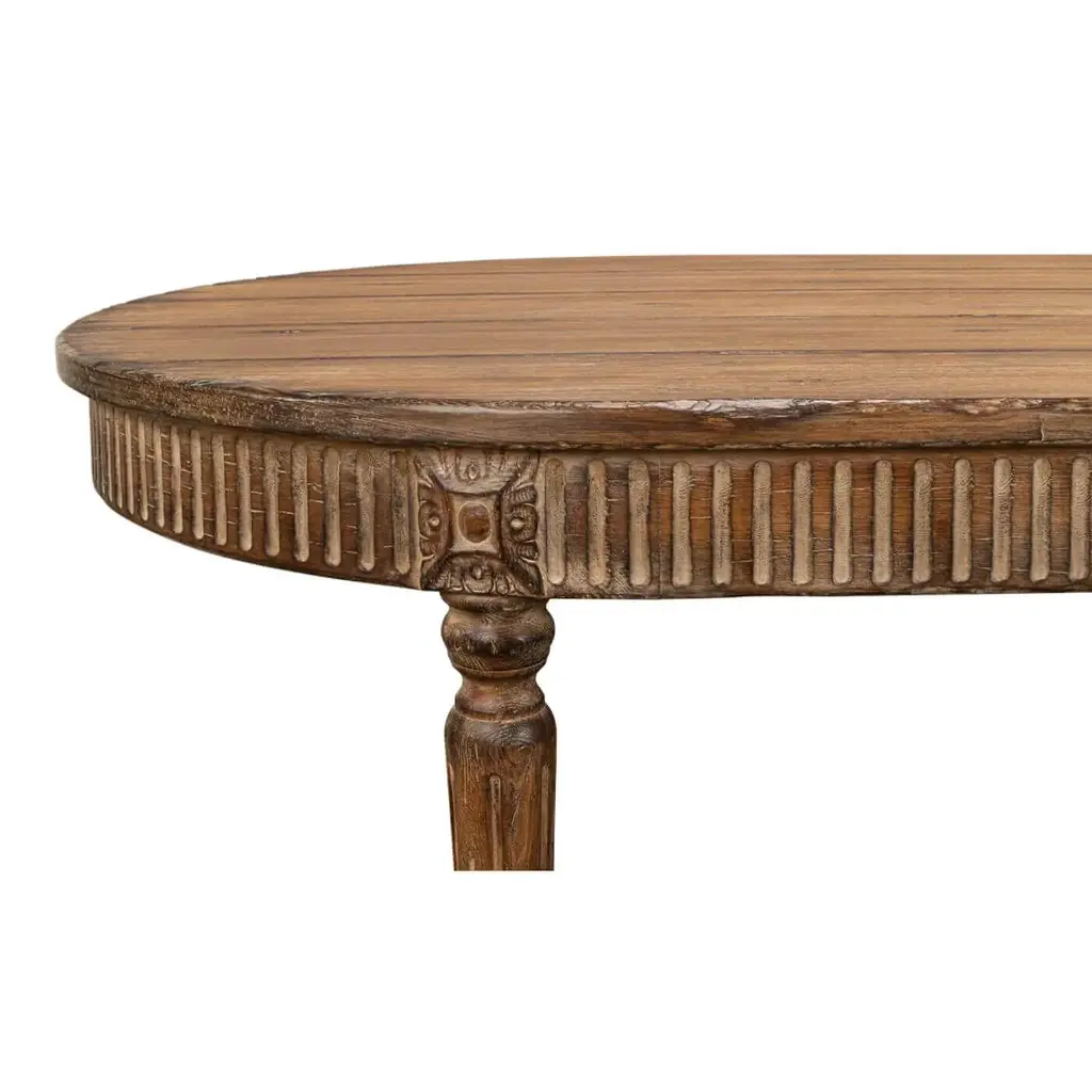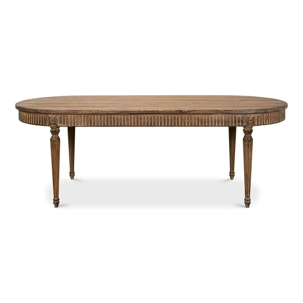Neoclassic style oval dining table with a plank top and carved apron with a time-worn sunburned finish. Dimensions: 89" W x 39" D x 30" H