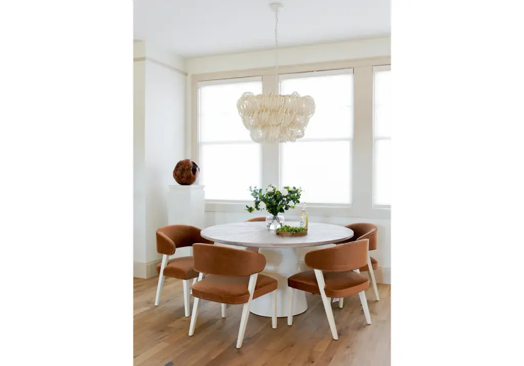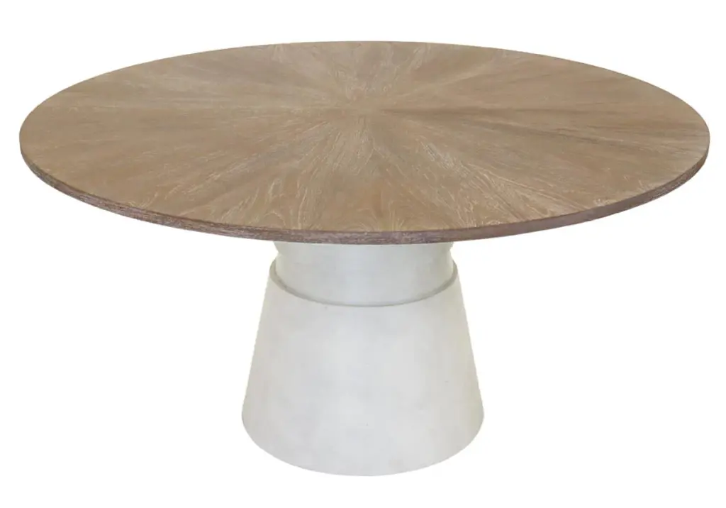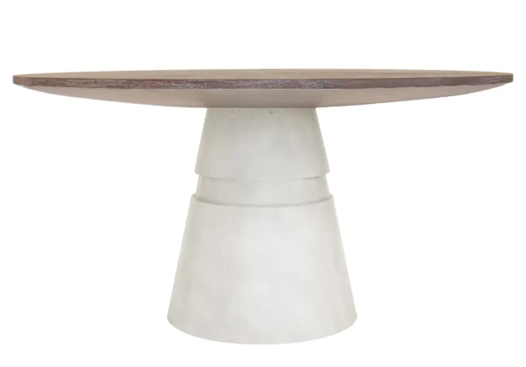 The Frida lends a tasteful look with its cerused Mindi wood top crafted in an eye-catching wedge construction. A conical base finished in white plaster and accentuated by a carved ring accent provides contrast and visual interest. The edge detail slants away, highlighting the tabletop thickness, and completing its tasteful design. This standalone piece effortlessly styles with dining chairs for a sophisticated setting.