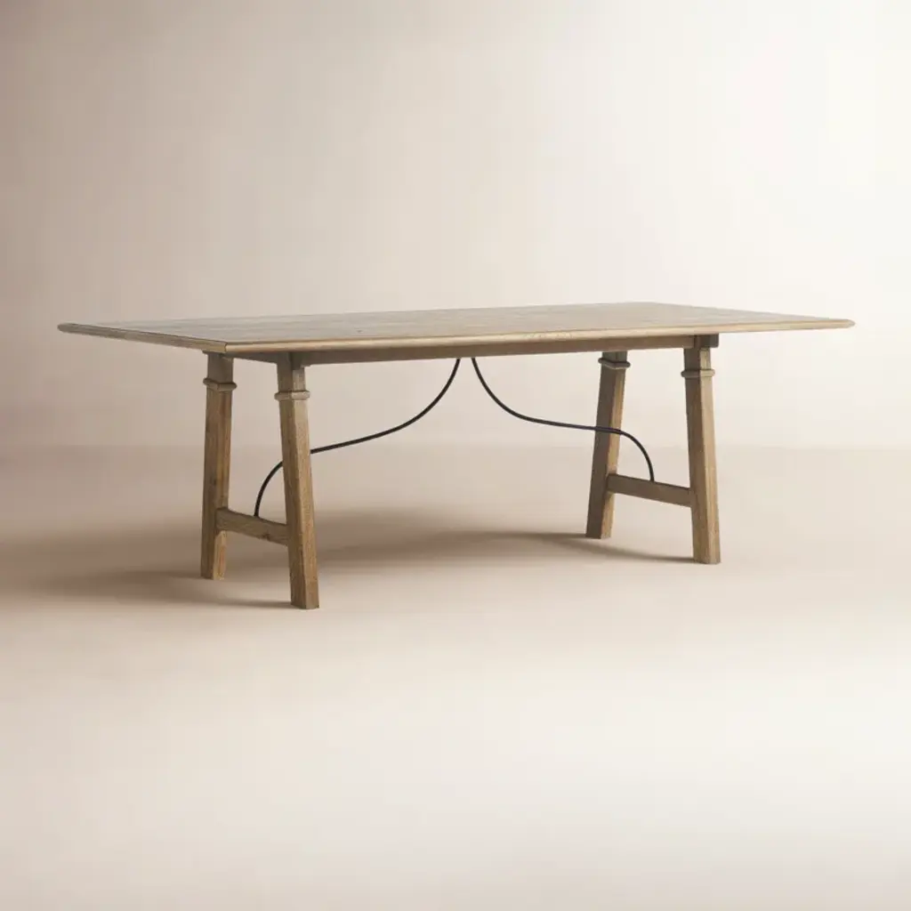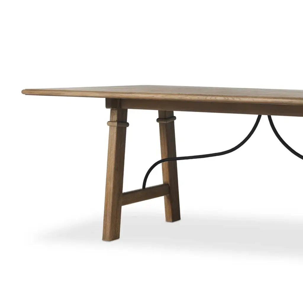 A design collaboration by Amber Lewis and Four Hands. This Spanish-style dining table features a curved hammered iron stretcher for a touch of contrast against the drifted oak frame. The thin wood profile brings a subtle update to a traditional look.