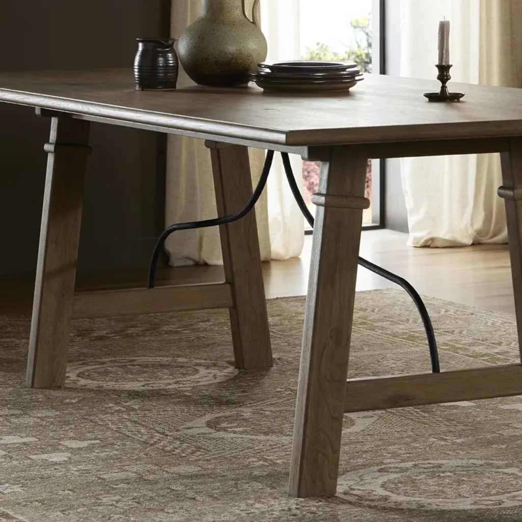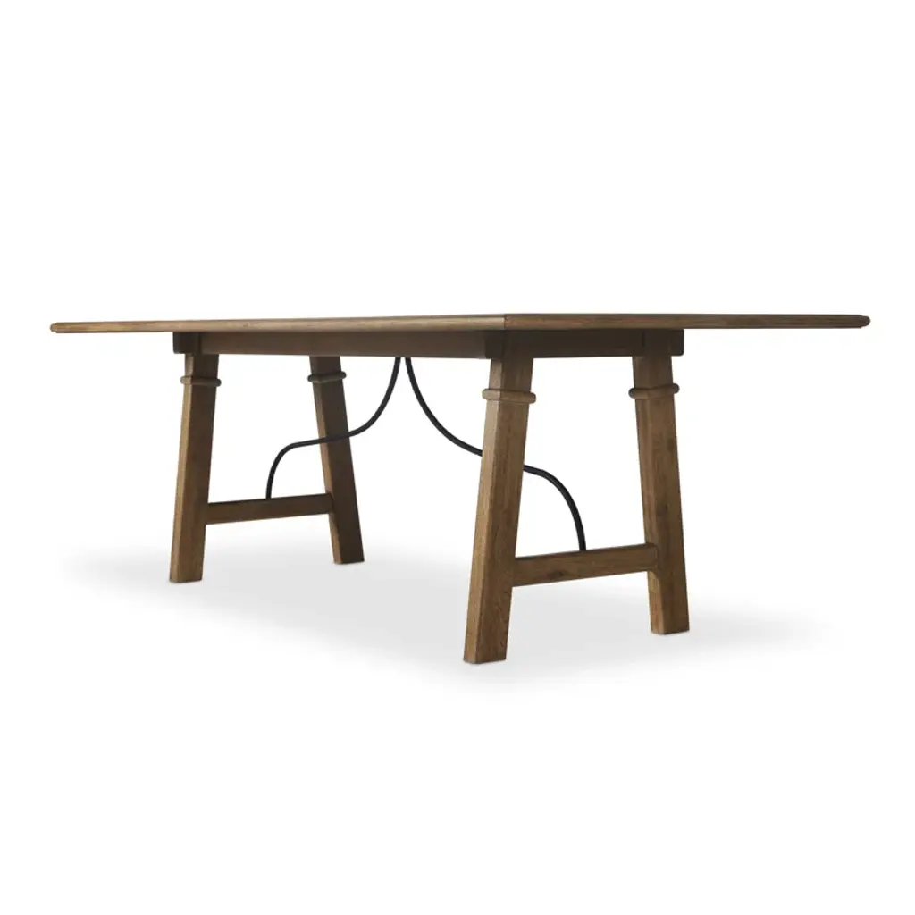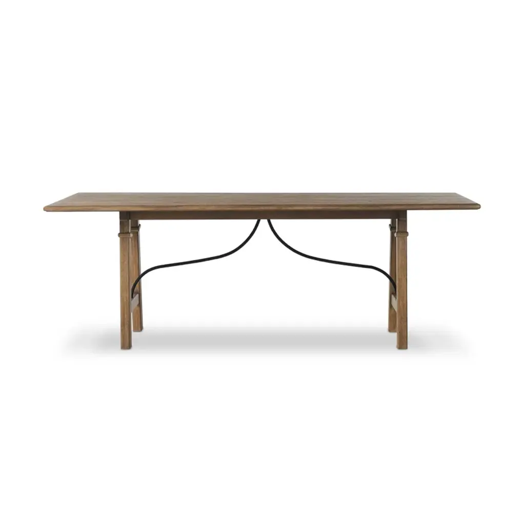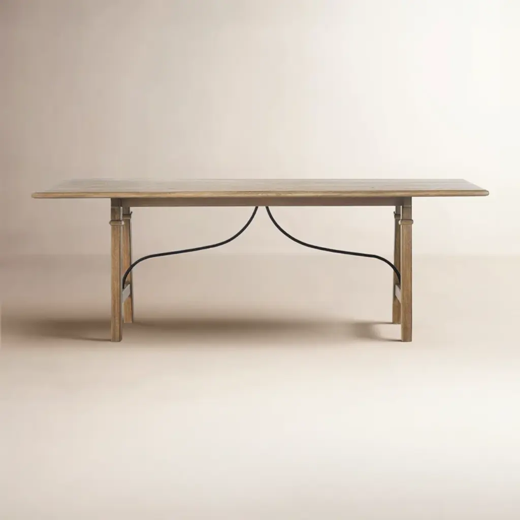 A design collaboration by Amber Lewis and Four Hands. This Spanish-style dining table features a curved hammered iron stretcher for a touch of contrast against the drifted oak frame. The thin wood profile brings a subtle update to a traditional look.
