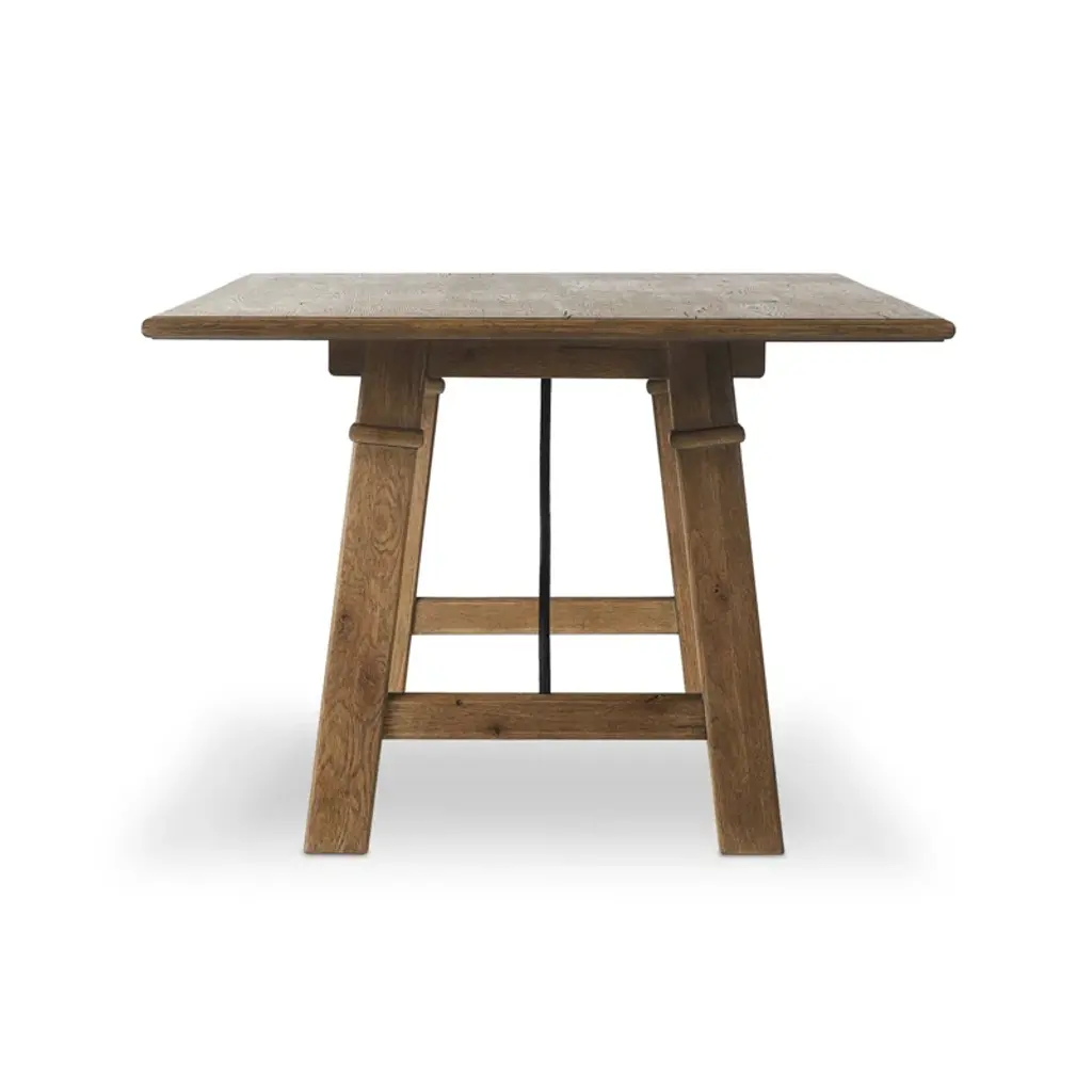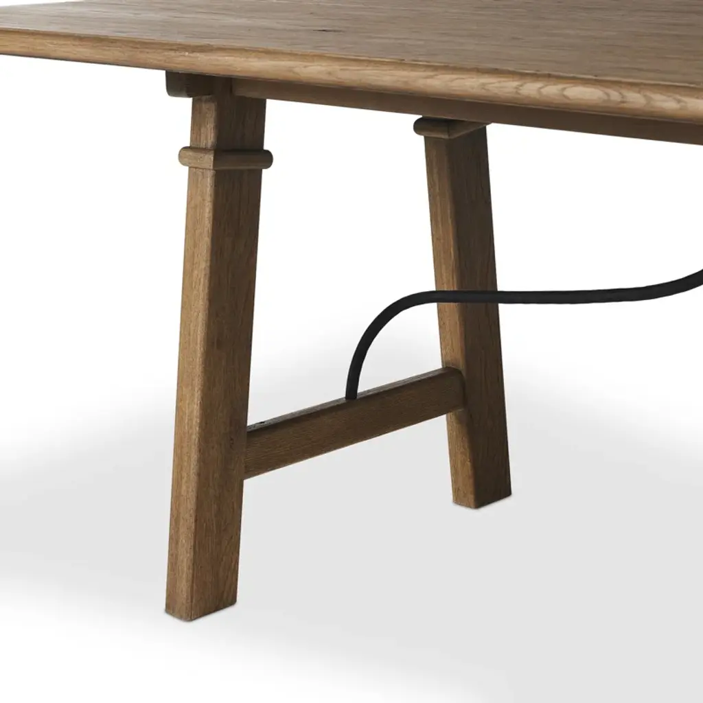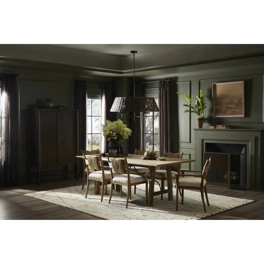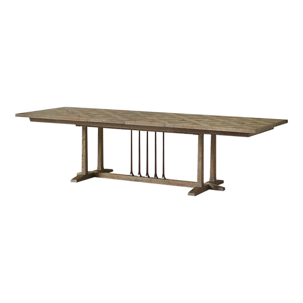 A design collaboration by Amber Lewis and Four Hands. This Spanish-style dining table features a curved hammered iron stretcher for a touch of contrast against the drifted oak frame. The thin wood profile brings a subtle update to a traditional look.