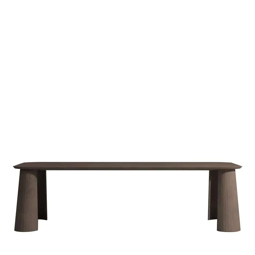 A sublime combination of classic and contemporary styles, this stunning dining table is capable of bringing a room to life on its own. Marked by a unique powder, it is entirely made of sandblasted and hand-treated ultra-high-performance concrete, lending it a high-edge and sturdy quality. Inspired by classical architecture, the long and rectangular top rests on four column-shaped concave legs marked by a grooved texture. Available in eight different shades upon request to the Concierge.