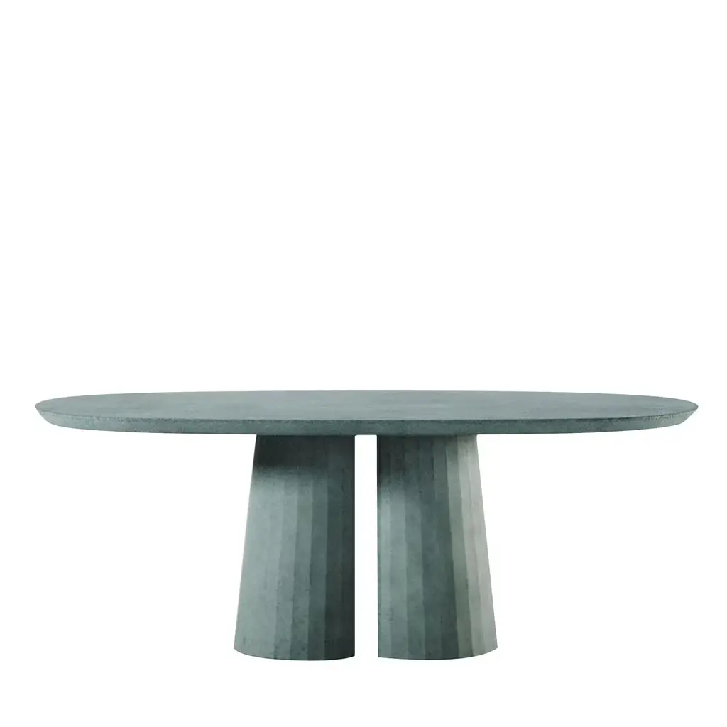 An eye-catching interplay of lines and volumes, this dining table is a unique piece of design entirely fashioned of sandblasted and hand-treated ultra-high-performance concrete colored in an exquisite fir green hue. A modern interpretation of classic Latin and Greek architecture, it flaunts a splendid base composed of three grooved column-shaped legs supporting a large round top. This statement piece can be customized in a choice of eight different colors, please contact the Concierge for details.