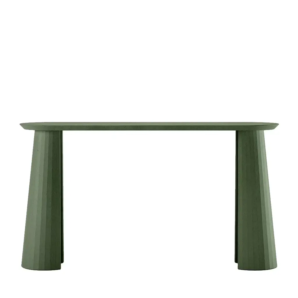 A sublime combination of classic and contemporary styles, this stunning dining table is capable of bringing a room to life on its own. Marked by a unique powder, it is entirely made of sandblasted and hand-treated ultra-high-performance concrete, lending it a high-edge and sturdy quality. Inspired by classical architecture, the long and rectangular top rests on four column-shaped concave legs marked by a grooved texture. Available in eight different shades upon request to the Concierge.