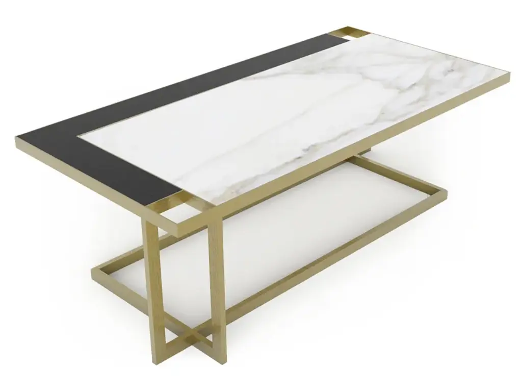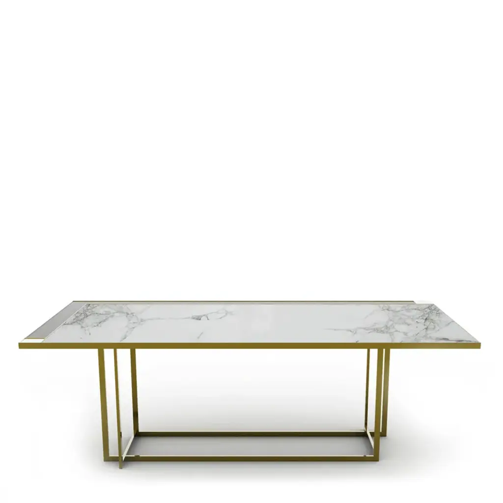 Elegant rectangular dining table with brass structure and marble/painted glass elements recessed top. Available in different combination of materialsGary is a complete collection of dining, coffee, side, consoles table and mirrors. Solid brass structures with marble and painted glass tops that fit perfectly any interiors.