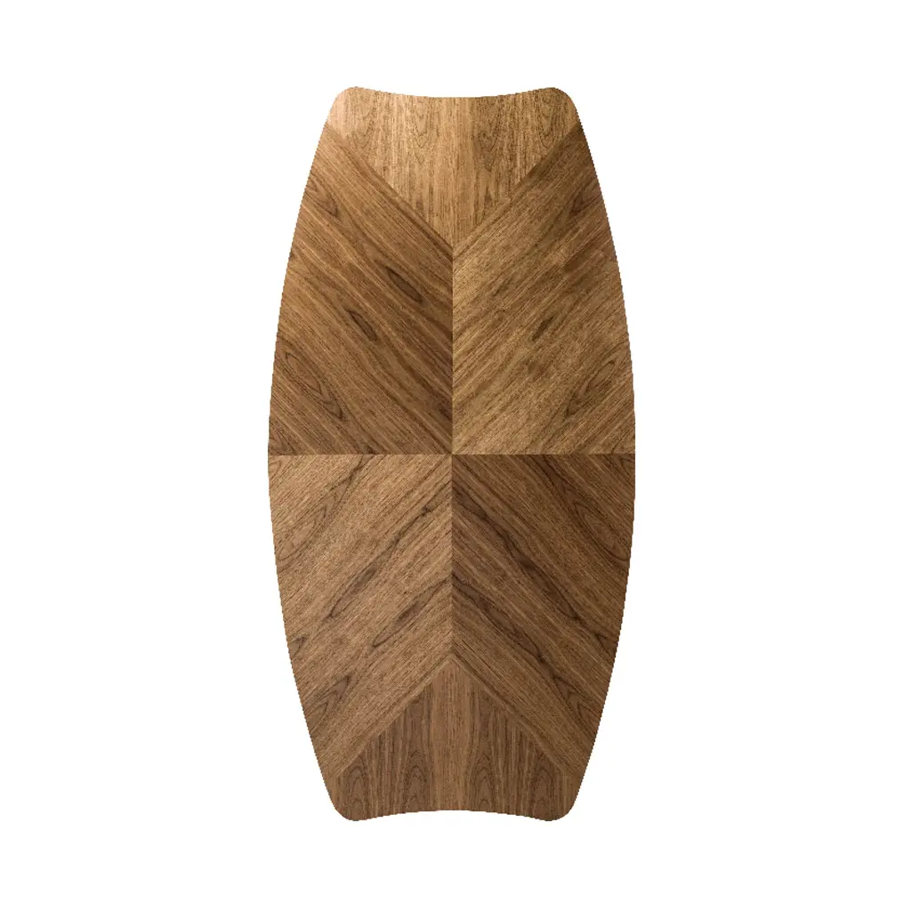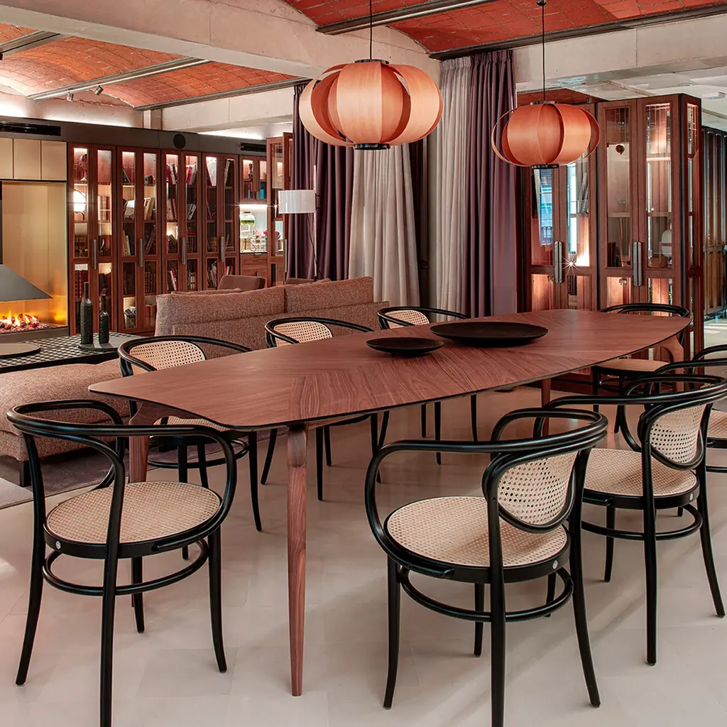 Oscar Tusquets' standout series started with a sinuous wooden chair that embodies influences from past designers Antoni Gaudí and Carlo Mollino and now brings forth a characteristic dining table. Gaulino features a top in a veneer pattern with the underside and edges lacquered to match and solid ash legs, all in a finish of natural varnished ash, stained black or stained walnut.