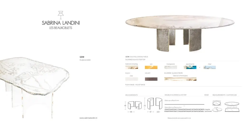 GEM contemporary dining - cocktail tableCombining contemporary modern style with details inspired by our glass tradition, Sabrina Landini GEM tables reinterpret our legendary links into head-turning design accentsThe table, reminiscent of a gem hugged by its staples, with its velvet or clear pvc free-positionable legs and precious double silvered top, will decor the interior space with timeless elegance and full functionality. Now, the classic design serves as the foundation for one of our most iconic dining/coffee table in collection, where to reflect and shine. Each unique—perfect or imperfect—and always beautiful. Here, we explore the beauty each item, sculpted by our artisan hands, in our Atelier in Tuscany, entirely made in Italy.Glass surfaces :15mm under top, irregular/hammered edge, Sabrina's silvered6mm transparent top glass, silvered at the edge, for current use, cleaning and maintenance, not interfering with the elegant silver finish that lies beneath Plexiglass legs, upholstered with velvet or left clear with silvered glass strips Available versions : dining, cocktail, side tableCustom size are available on request.
