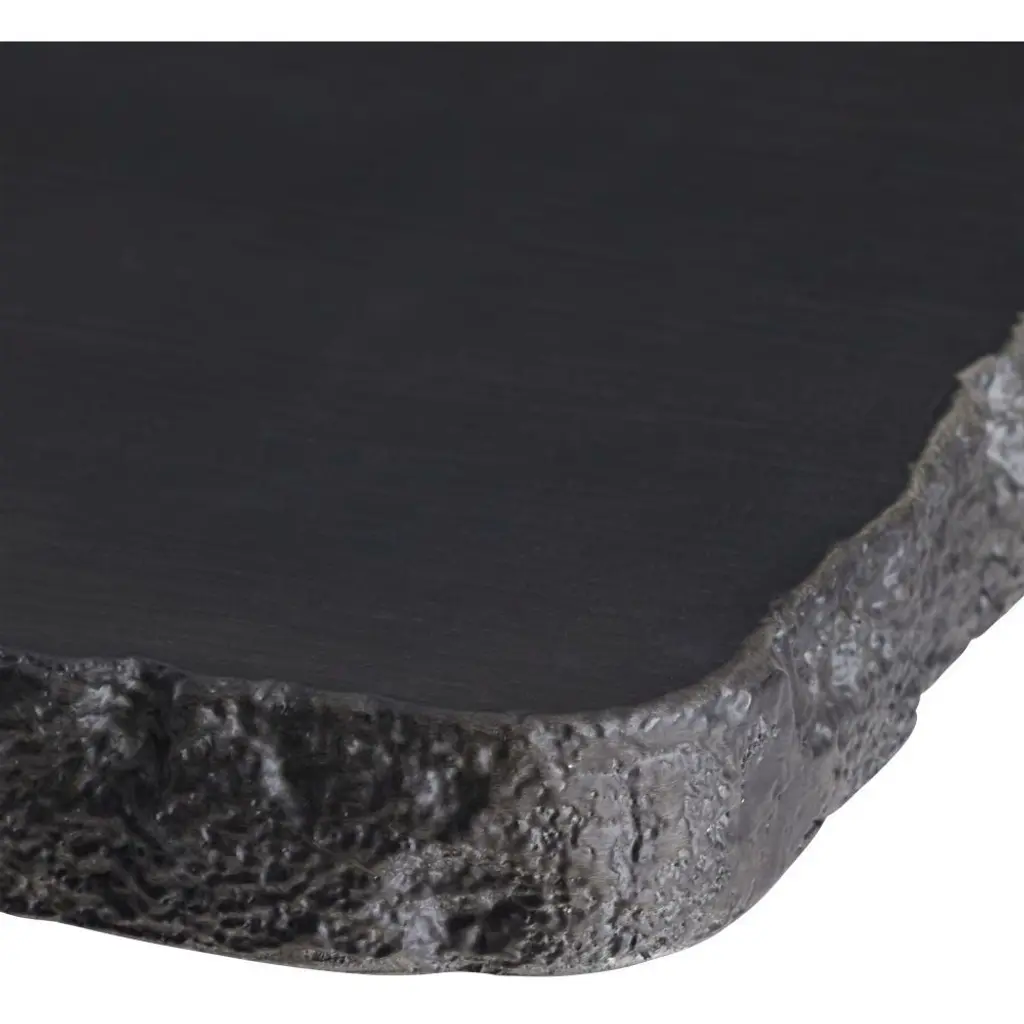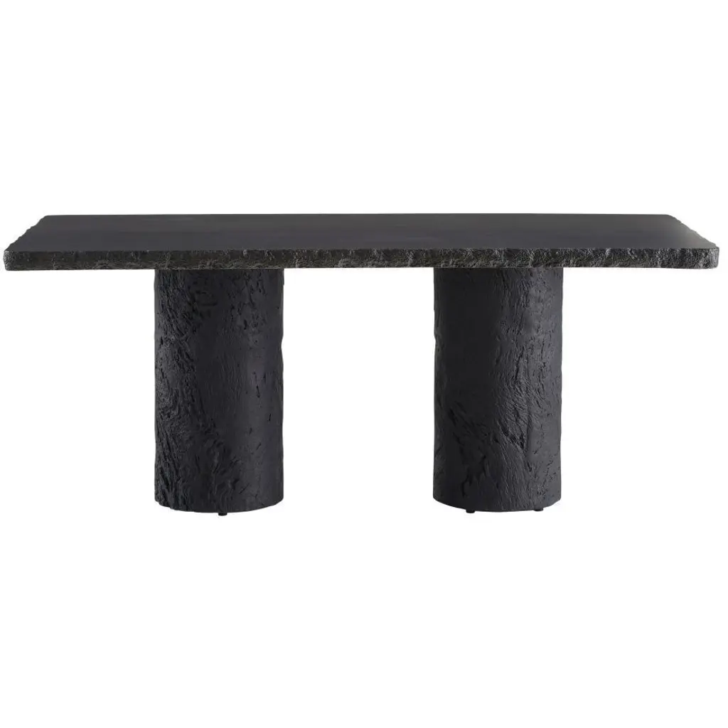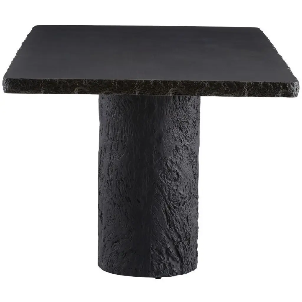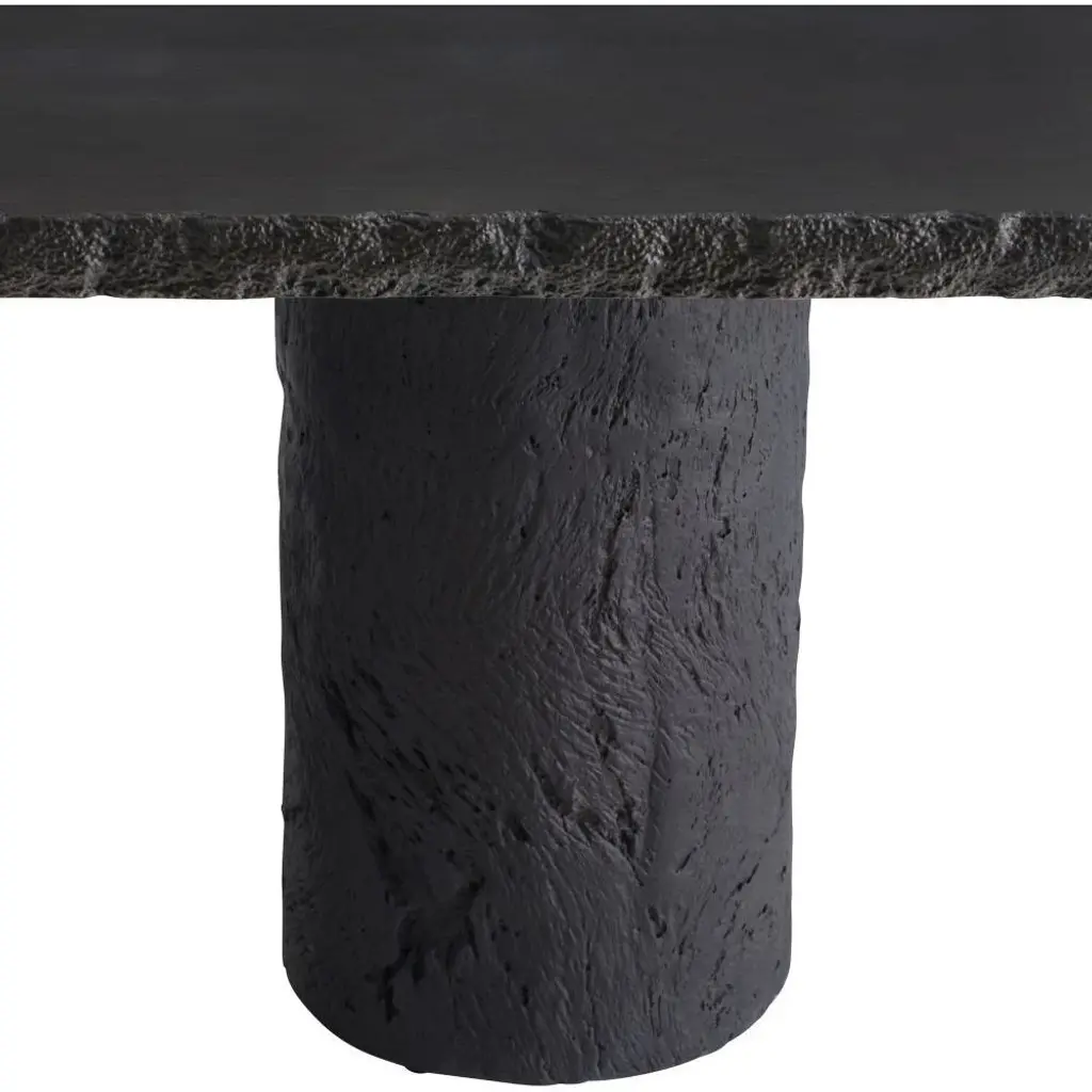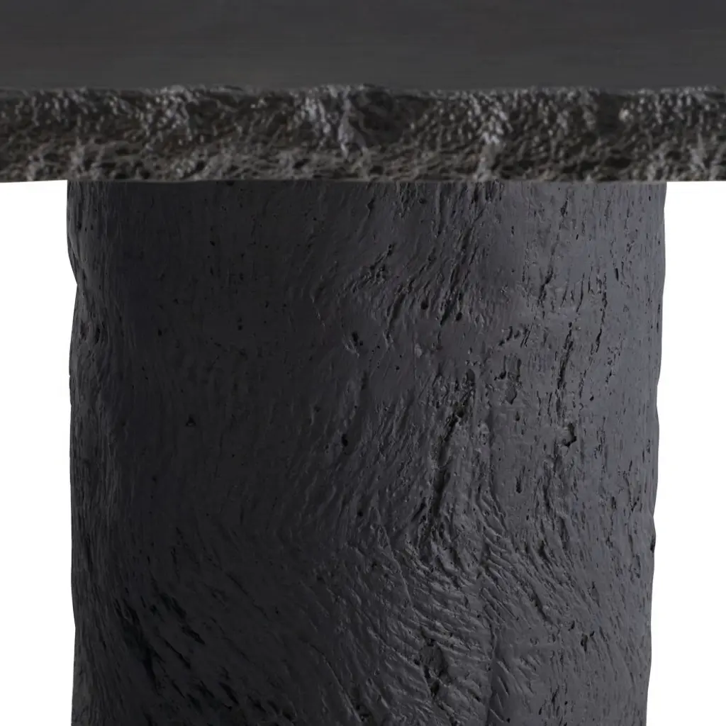 The edges and legs of this dining table were made with a faux bois texture, allowing it to blend effortlessly in harmony within any natural setting. Cast from matte carbon concrete composite, it has a hollow base for easier movement within your outdoor space. Each piece is hand-finished and unique. Finish will vary.
