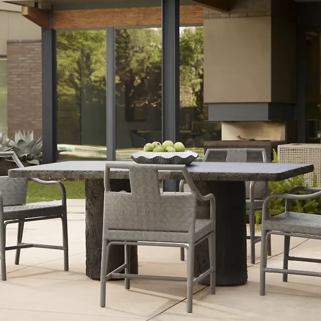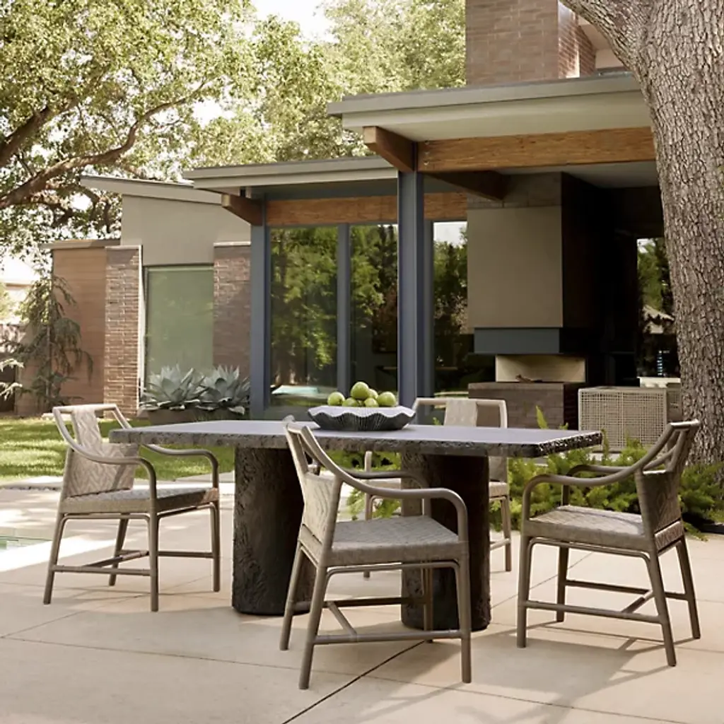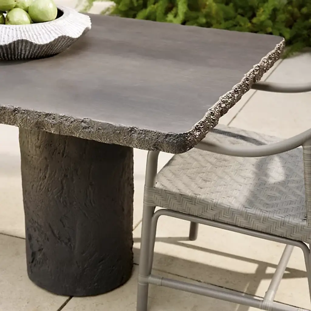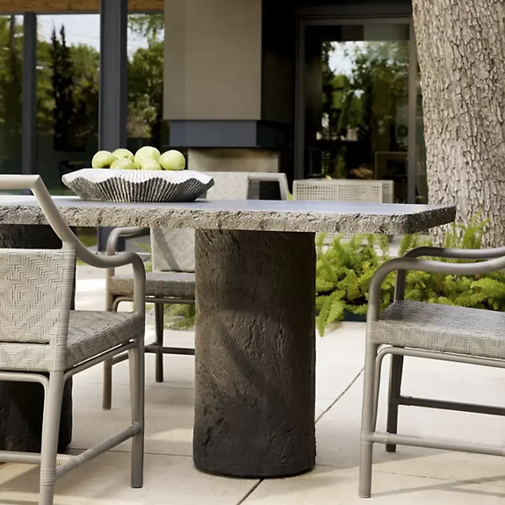 The Gemini Outdoor Dining Table from Arteriors is cast from matte carbon concrete composite with a faux bois texture applied to the edges and legs. This realistic wood texture allows the concrete table to integrate naturally within outdoor environments while offering the durability advantages of composite construction. The hollow base design reduces overall weight, making it easier to relocate within your outdoor space. Each piece receives individual hand-finishing, ensuring no two tables are exactly alike in their surface characteristics.