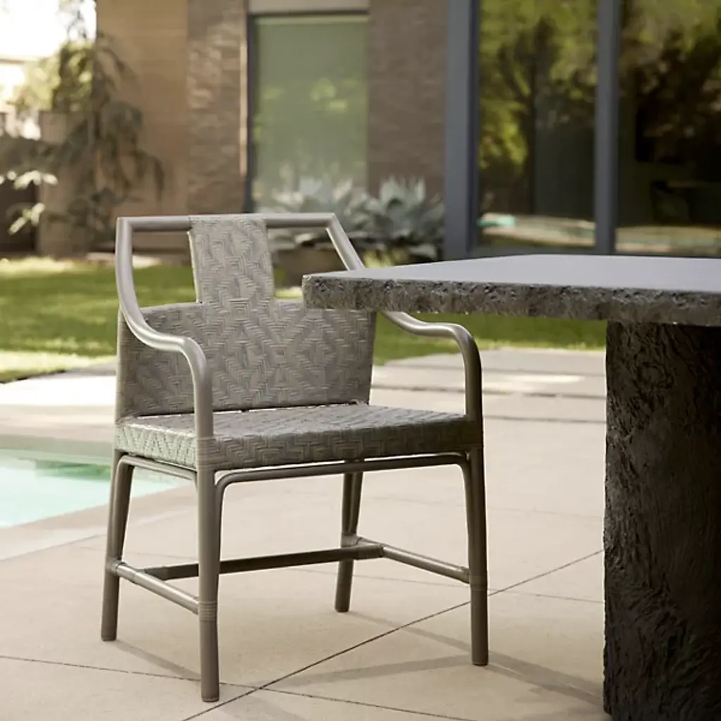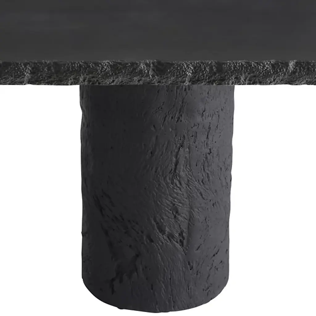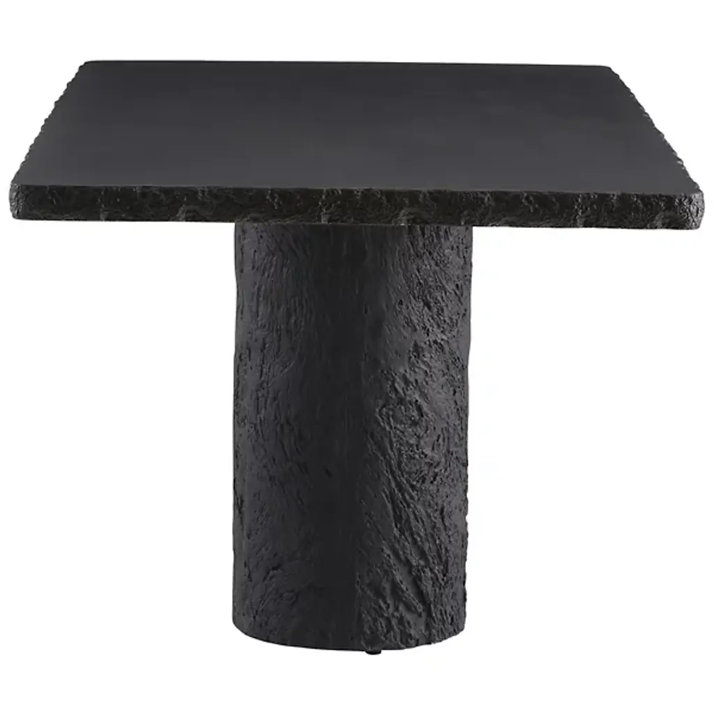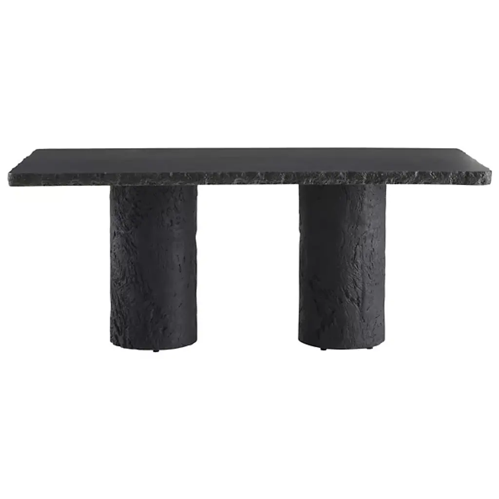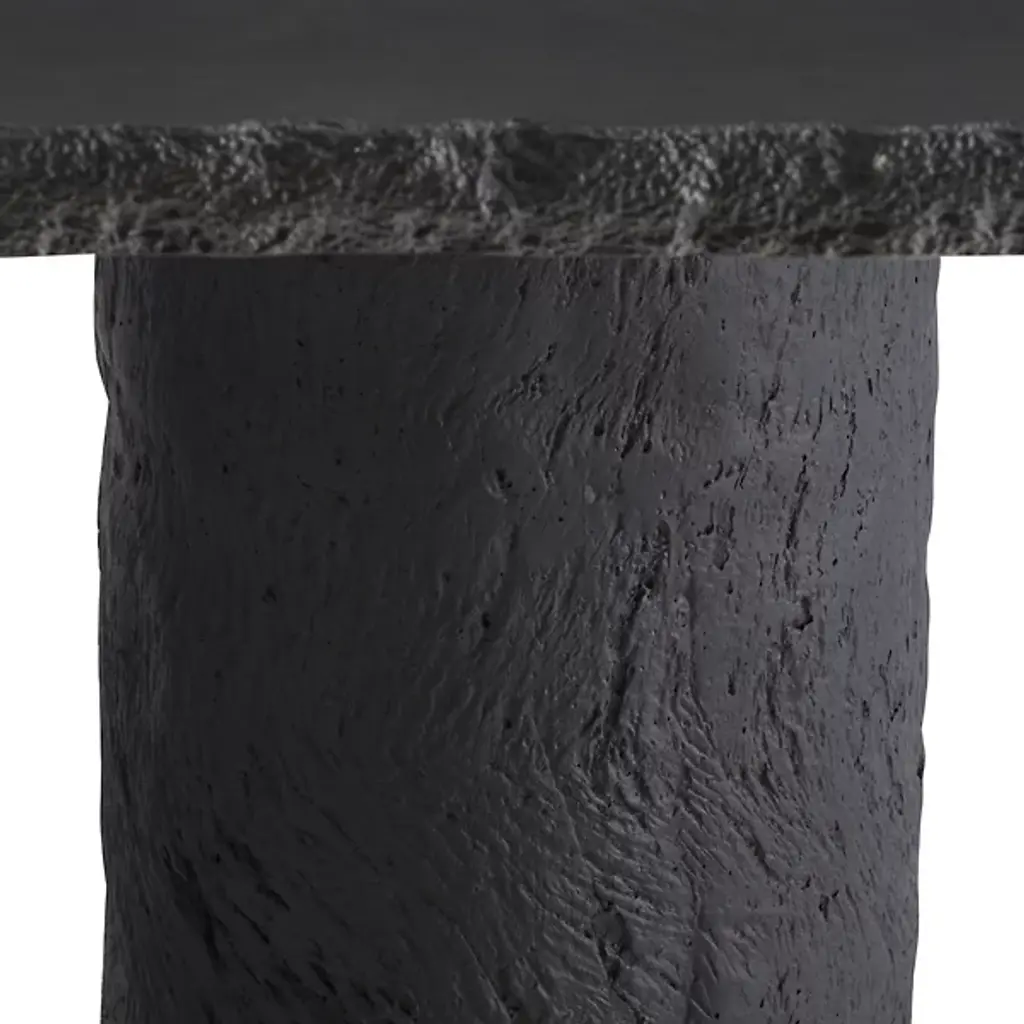 The Gemini Outdoor Dining Table from Arteriors is cast from matte carbon concrete composite with a faux bois texture applied to the edges and legs. This realistic wood texture allows the concrete table to integrate naturally within outdoor environments while offering the durability advantages of composite construction. The hollow base design reduces overall weight, making it easier to relocate within your outdoor space. Each piece receives individual hand-finishing, ensuring no two tables are exactly alike in their surface characteristics.