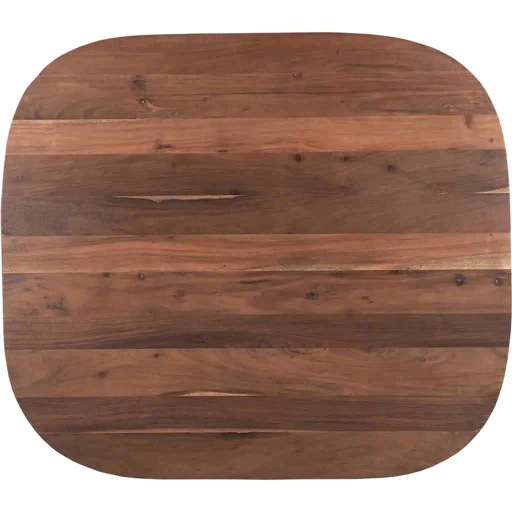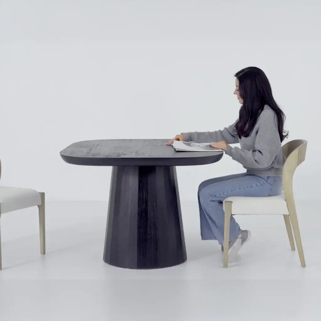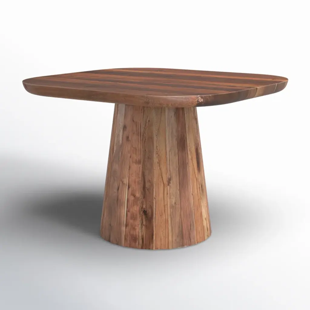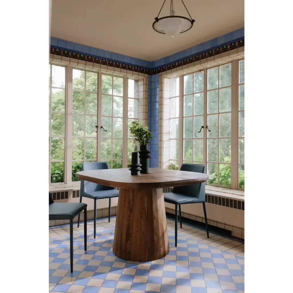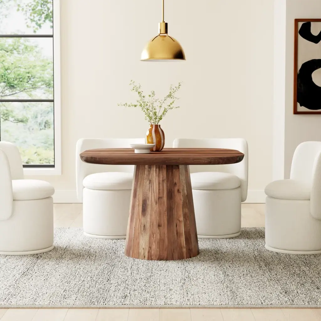 This dining table is all about natural elegance and rustic flair. Crafted from solid acacia wood, it boasts a bold silhouette with an oversized drum-shaped pedestal base that commands attention. The slightly tapering tabletop edge adds a dynamic touch, making it a standout piece in your dining area. Perfect for intimate gatherings or cozy coffee chats, this table comfortably seats four. The natural wood grain and knots bring a unique character to each piece, ensuring your dining space feels warm and inviting. Pair it with your favorite chairs for a complete look.