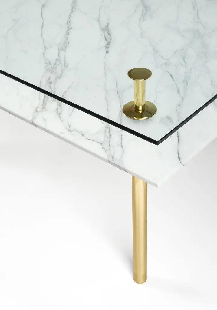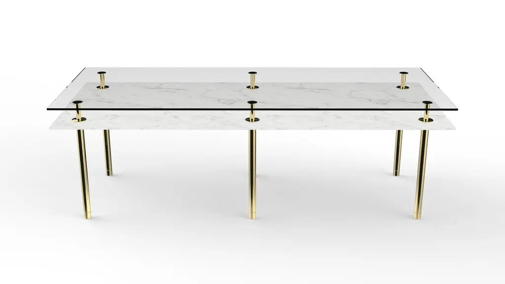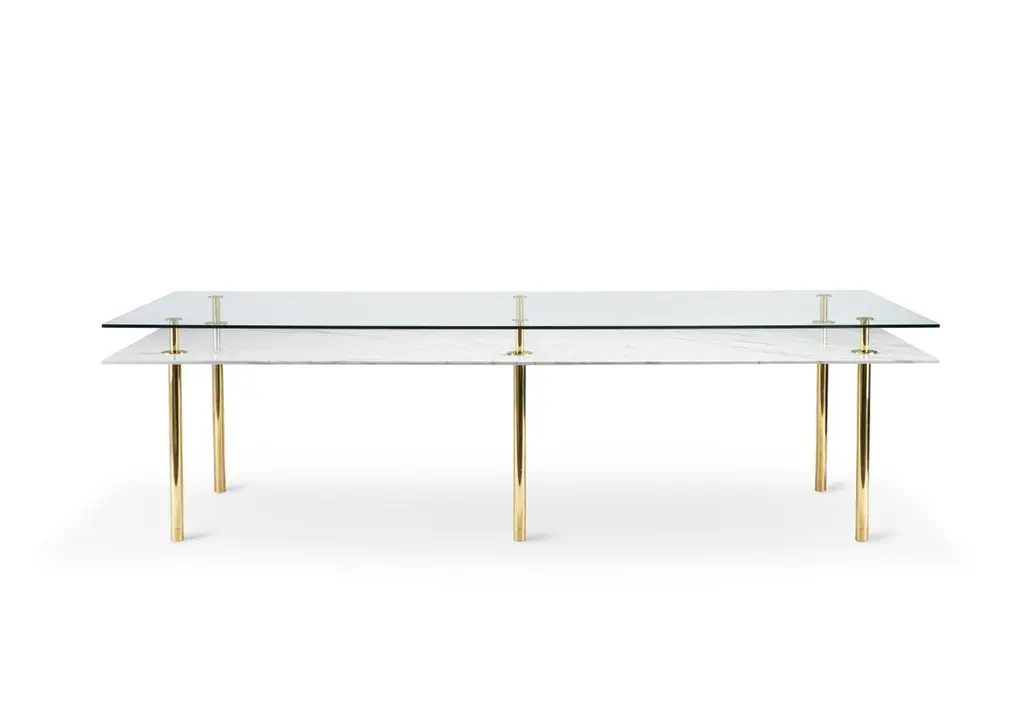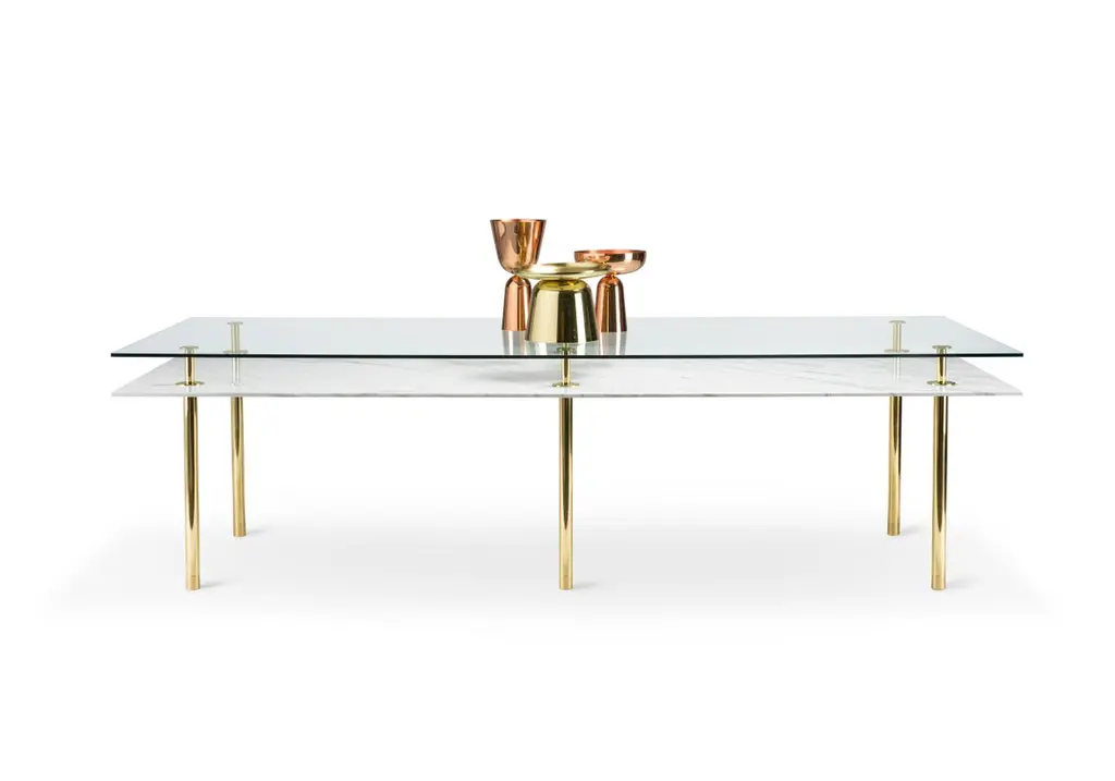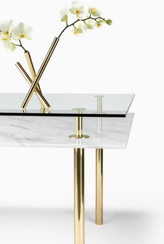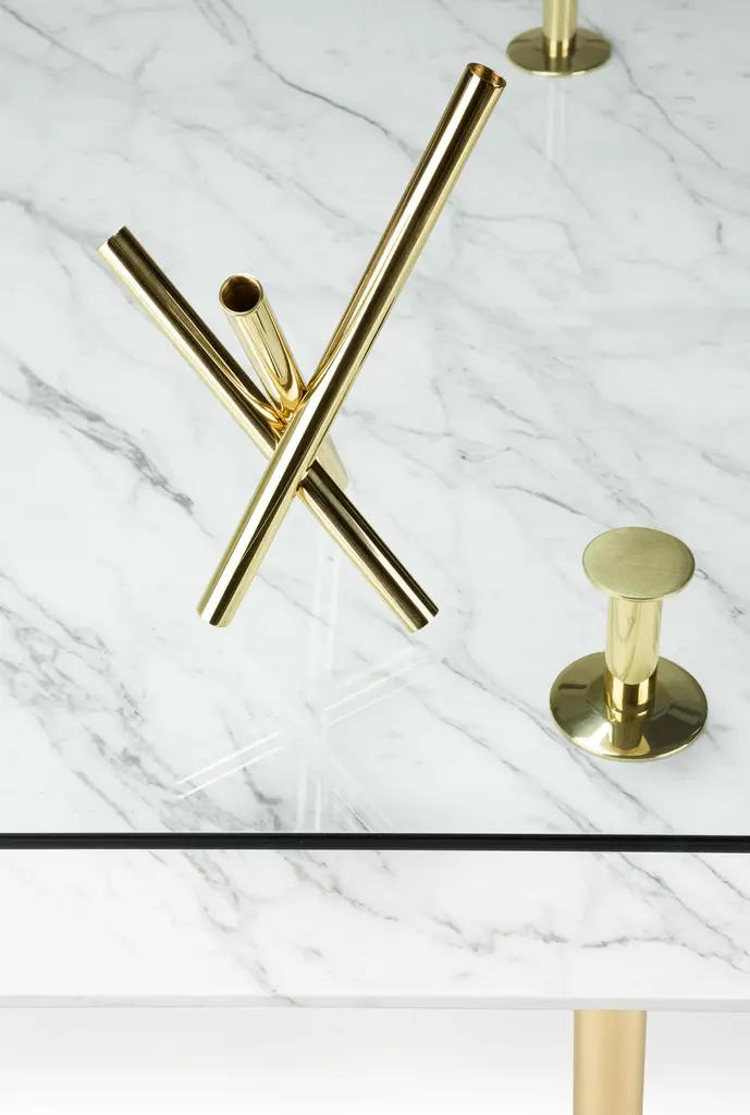 Rectangular table in crystal and brass. The designer imagines a turning point in the use of such a precious finishes such as polished brass: from the idea of almost a unique object in its perfect craftsmanship, to the system to be built starting from the base. A column made of brass whose different diameters define base and capital, just as the columns of Classic architecture. The column multiplies to infinity, is interrupted and then resumed to hold glass tops, wood or marble and configure even angular shelves, tables, small tables, displays and consoles. A landscape of almost infinite possibilities that designers and end users can chose from to organize the space both in domestic and contract situations, maintaining aesthetic uniformity in the name of a more refined elegance.Materials:Carrara white, brass and crystal.