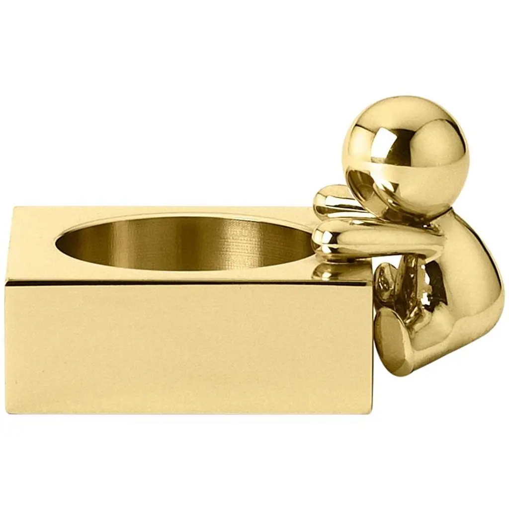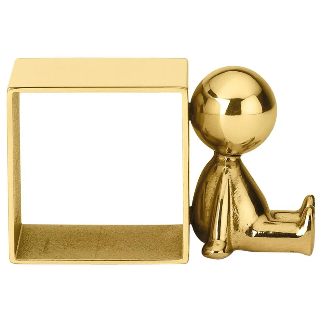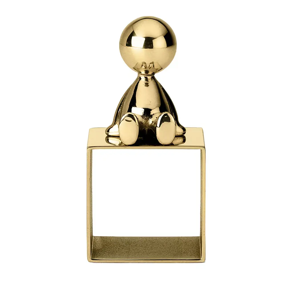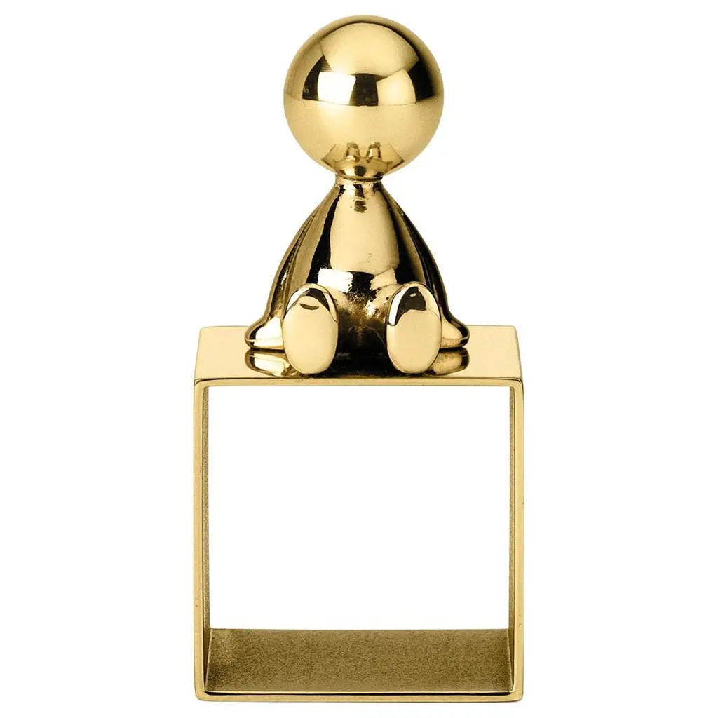 This playful napkin holder ring in brass combines a rigorous square body with the charming decoration of a small man climbing on the side. Part of the Omini collection (which means "small men" in Italian), this piece combines opaque and glossy finishes for a modern look that will bring a warm glow to a dining table.