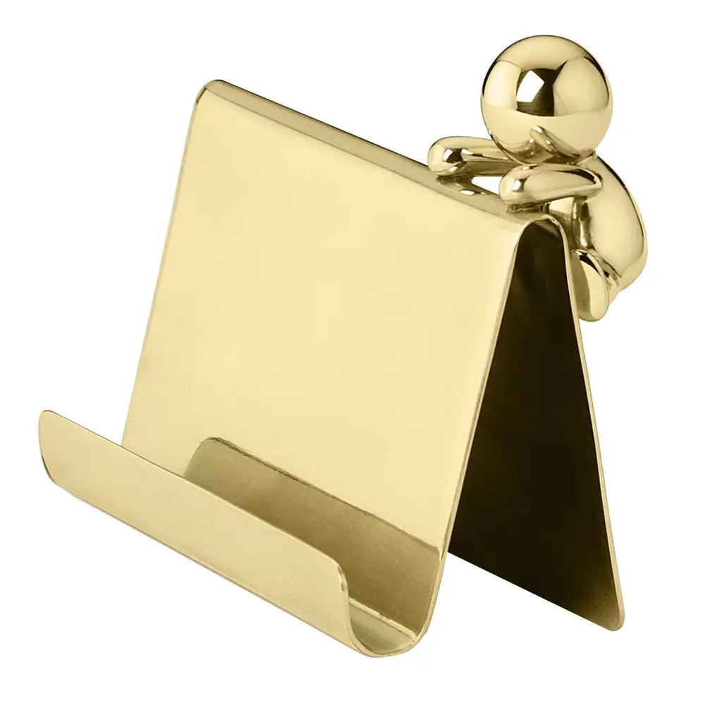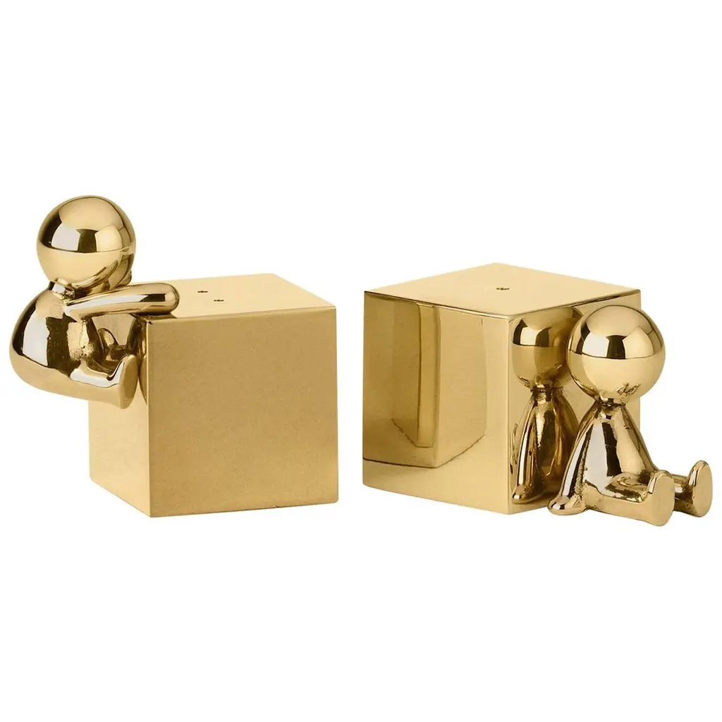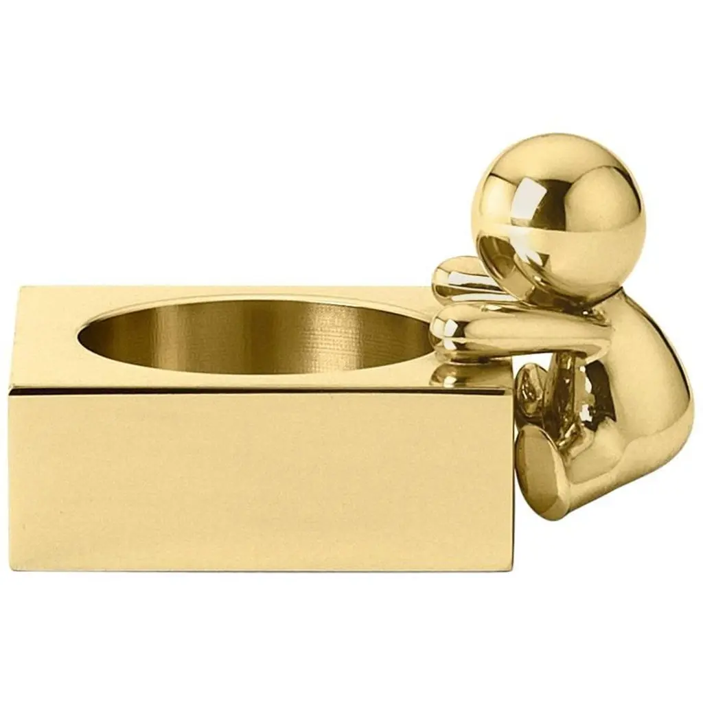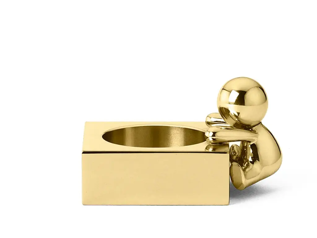 This playful napkin holder ring in brass combines a rigorous square body with the charming decoration of a small man climbing on the side. Part of the Omini collection (which means "small men" in Italian), this piece combines opaque and glossy finishes for a modern look that will bring a warm glow to a dining table.