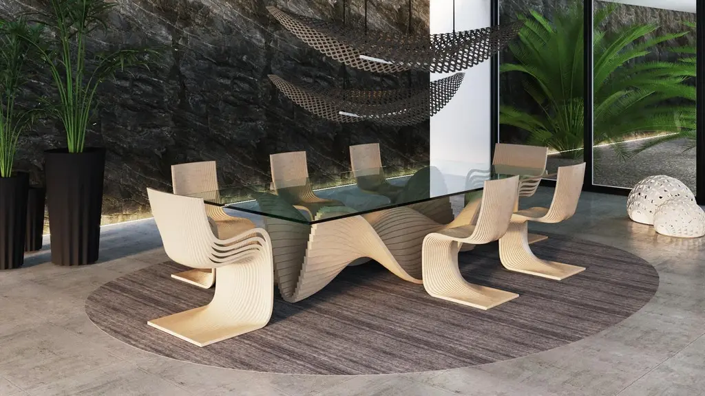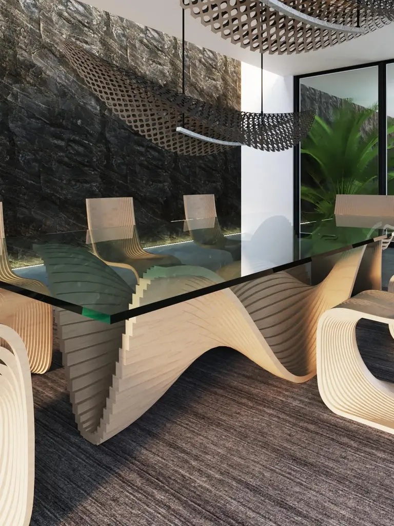 An extraordinary piece of furniture that combines the ethereal inspiration of a ghost with the natural beauty of wood craftsmanship. This dining table is crafted with 36 vertical sections of laminated birch and spruce wood, each 18.5 mm thick, resulting in a stunning and unique design that adds a touch of mystery and sophistication to any dining space.Features a captivating design that mimics the fluid and elusive nature of a ghost. The 36 vertical sections of laminated birch and spruce wood create a dynamic and flowing silhouette, giving the impression of movement and lightness. The interplay of vertical lines and shadows adds depth and intrigue, making this table a true work of art.Crafted from high-quality laminated birch and spruce wood, the "Ghost¨ Table showcases the natural beauty and strength of these materials. The combination of birch and spruce provides durability and a visually appealing contrast, enhancing the table's overall aesthetic.Glass is not included