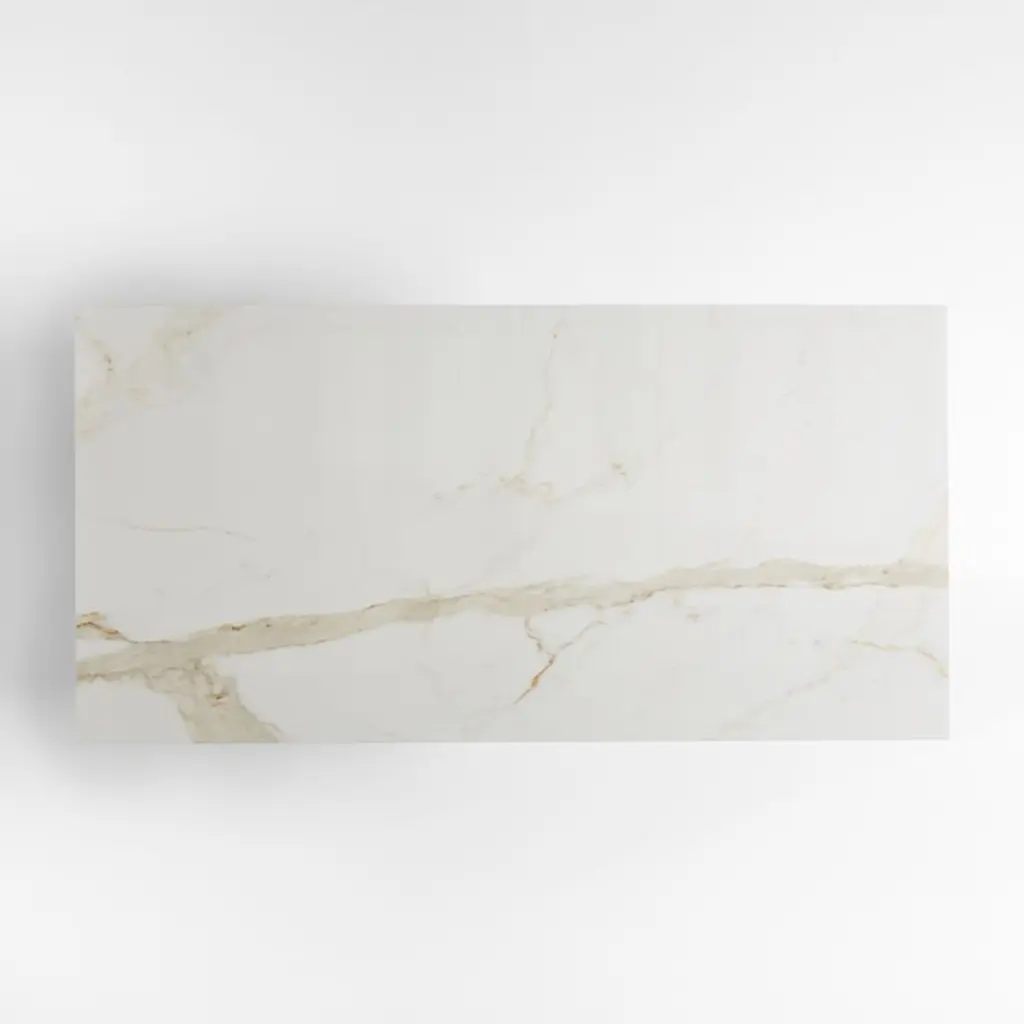 Nature and engineering team up in our sleek, hardworking Giada table. Made of state-of-the-art porcelain with faux veining, the white marble-like top is stain-proof, heat-resistant, hygienic, non-porous and colorfast. Hardwood legs angle an architectural base with a contemporary U-shape and a dark brown finish. Perfect for family dinners or fancy feasts, the Giada table seats up to 10. Our Giada dining table is a Crate & Barrel exclusive.