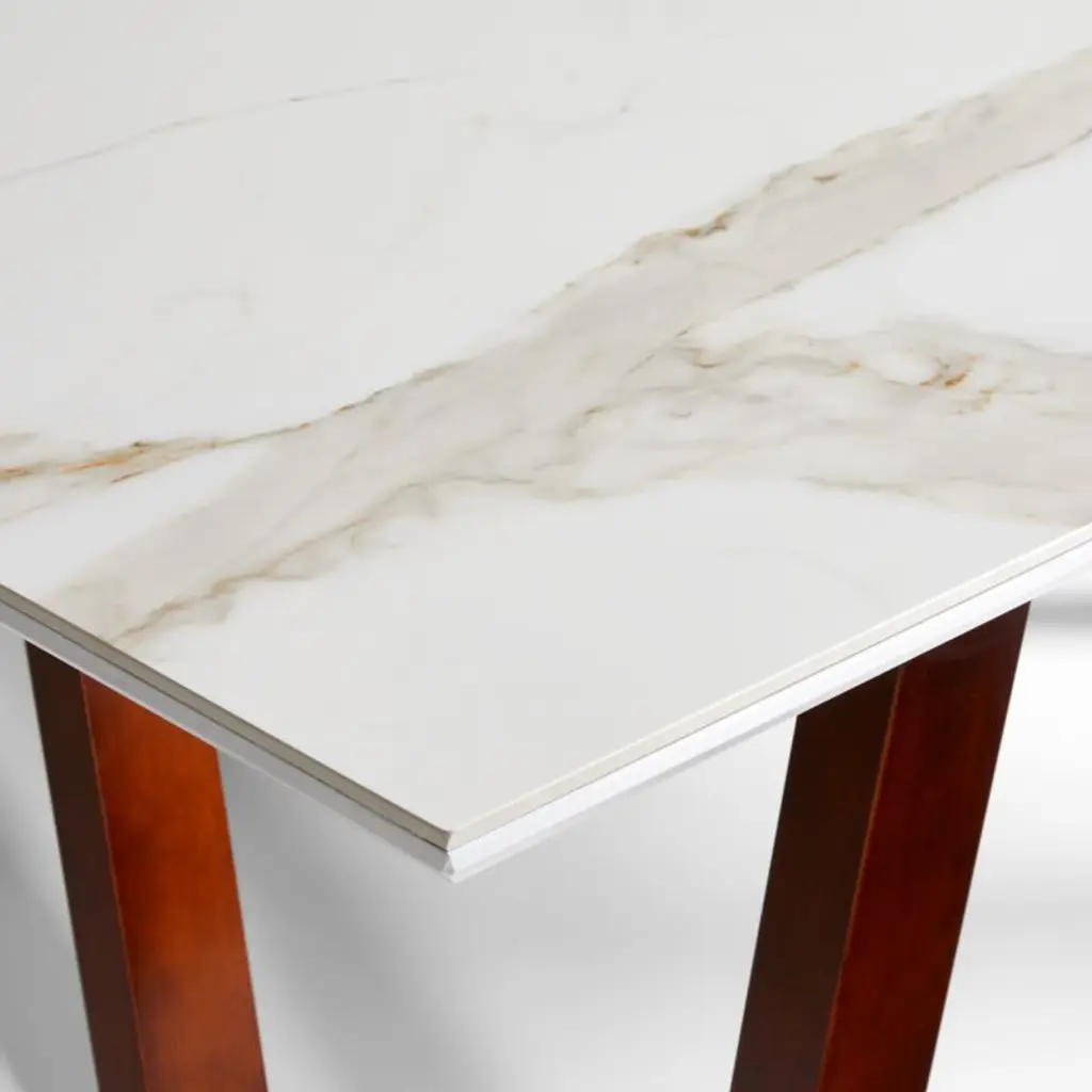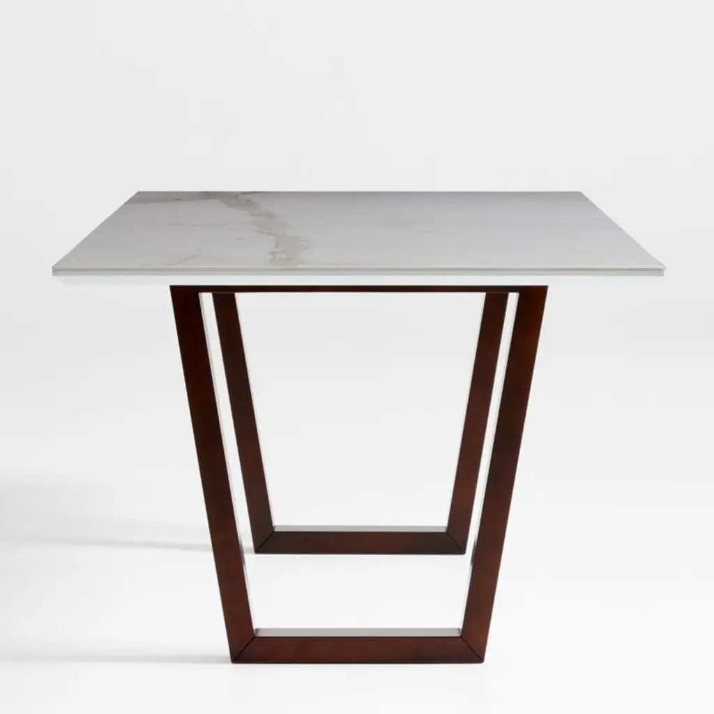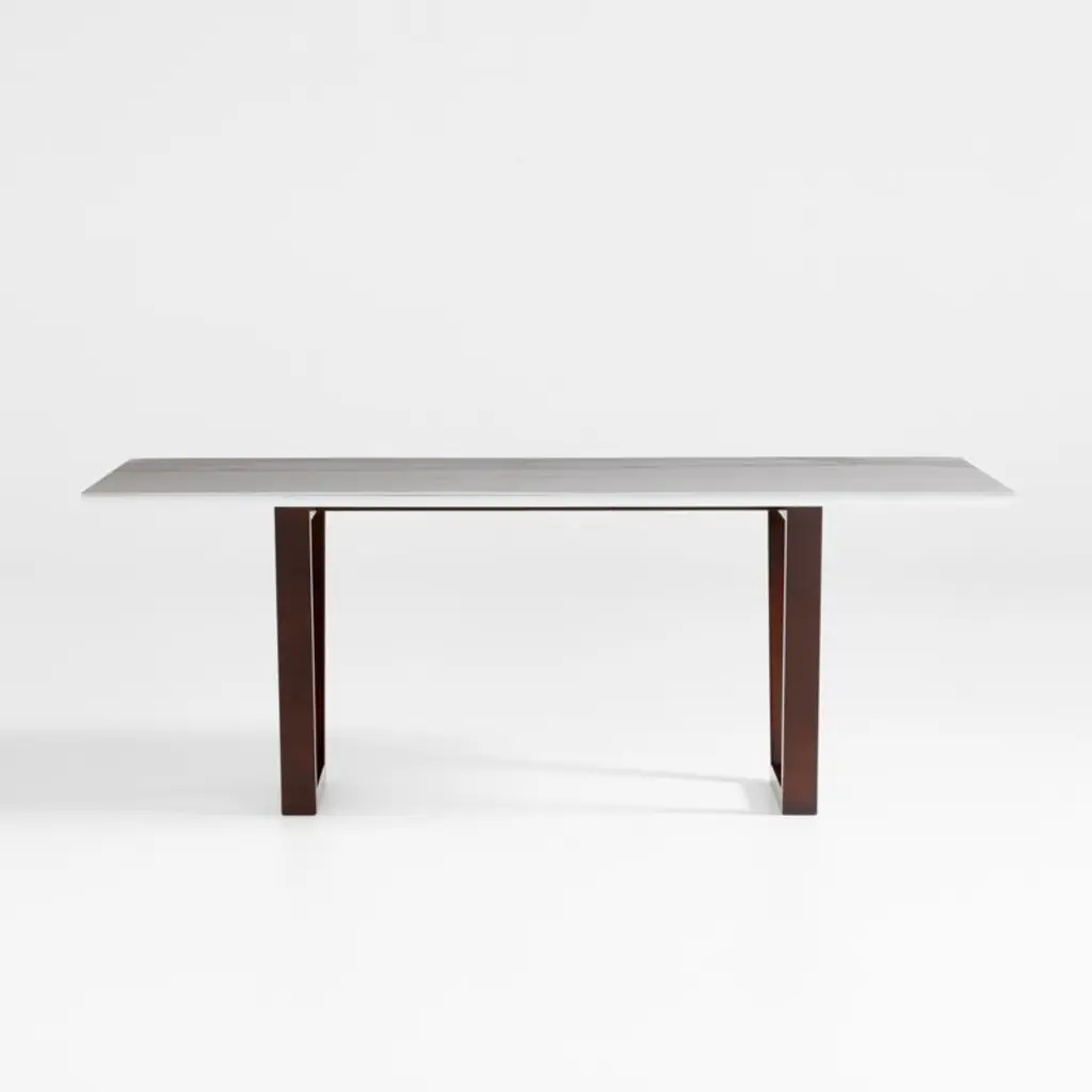 Nature and engineering team up in our sleek, hardworking Giada table. Made of state-of-the-art porcelain with faux veining, the white marble-like top is stain-proof, heat-resistant, hygienic, non-porous and colorfast. Hardwood legs angle an architectural base with a contemporary U-shape and a dark brown finish. Perfect for family dinners or fancy feasts, the Giada table seats up to 10. Our Giada dining table is a Crate & Barrel exclusive.