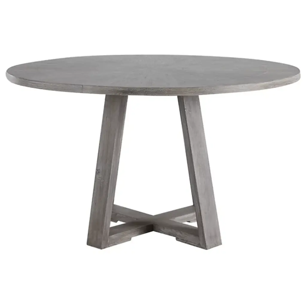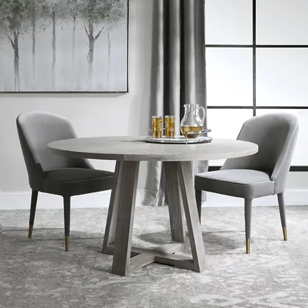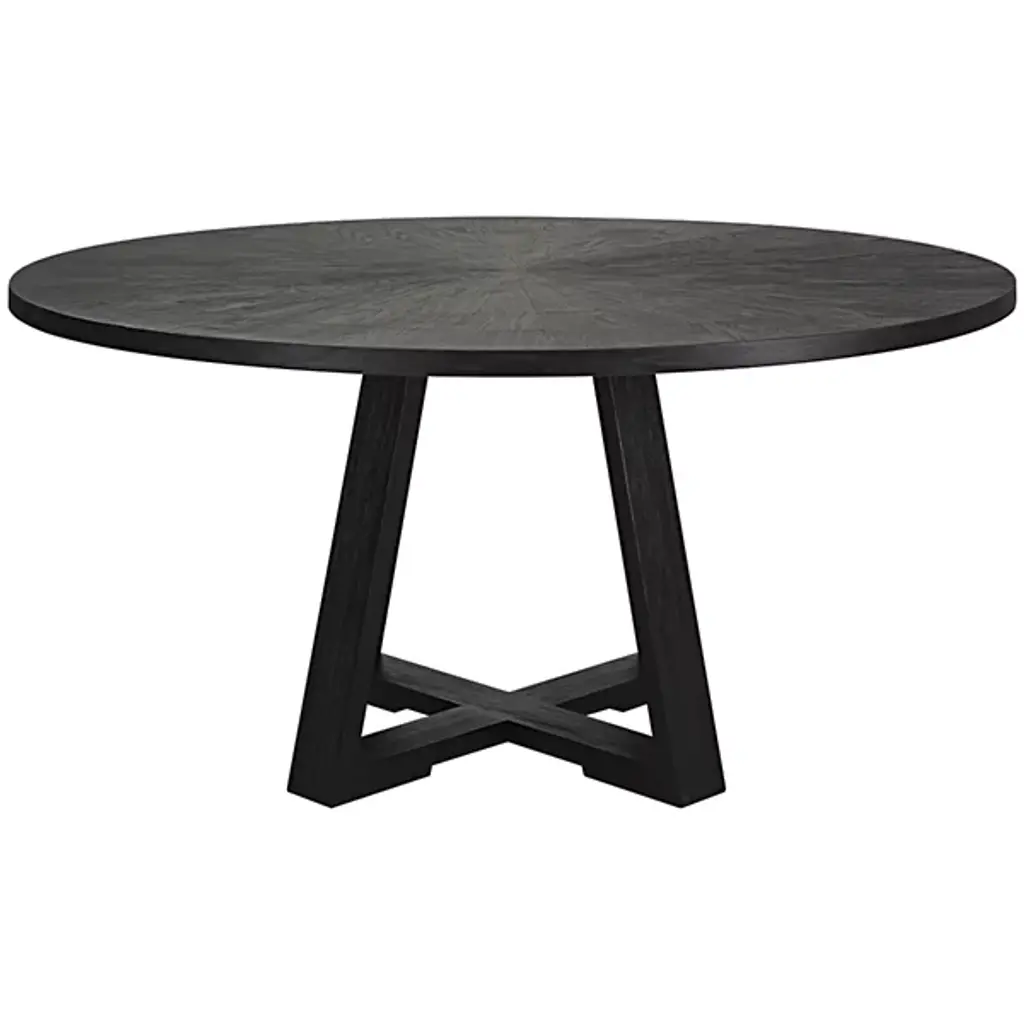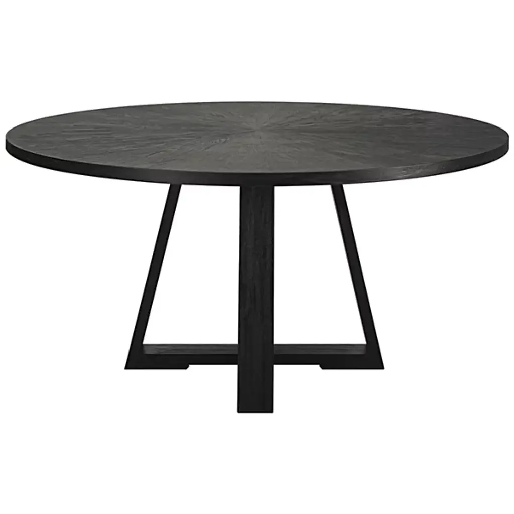 The Gidran Dining Table from Uttermost is designed by Jim Parsons. This dining table seamlessly combines the charm of rustic modern aesthetics with farmhouse flair, creating a versatile centerpiece for your dining space. Crafted with intention, Gidran features a circular top, providing an inviting surface for your gatherings. The table is composed of high-quality materials, including elm, oak veneer, plywood, and iron. Your dining table is defined by its open framework that forms elegant points of intersection.