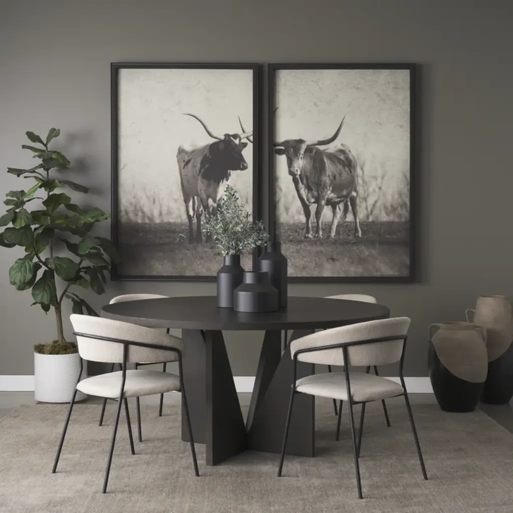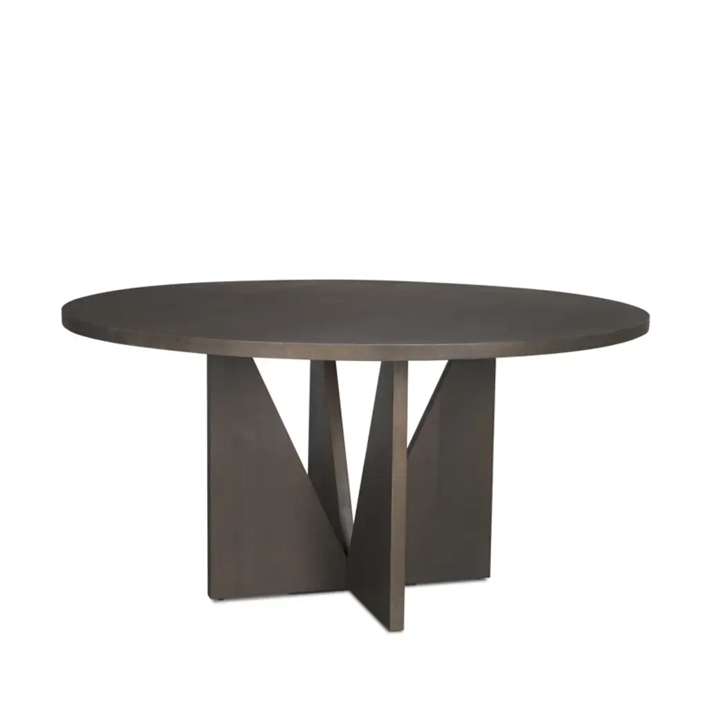 This dining table is a sleek fusion of contemporary design and timeless elegance. Constructed from solid wood, its round tabletop is supported by four angled legs forming a striking sculptural silhouette, exuding architectural allure. Finished in deep espresso, it's a captivating centerpiece for any dining space.