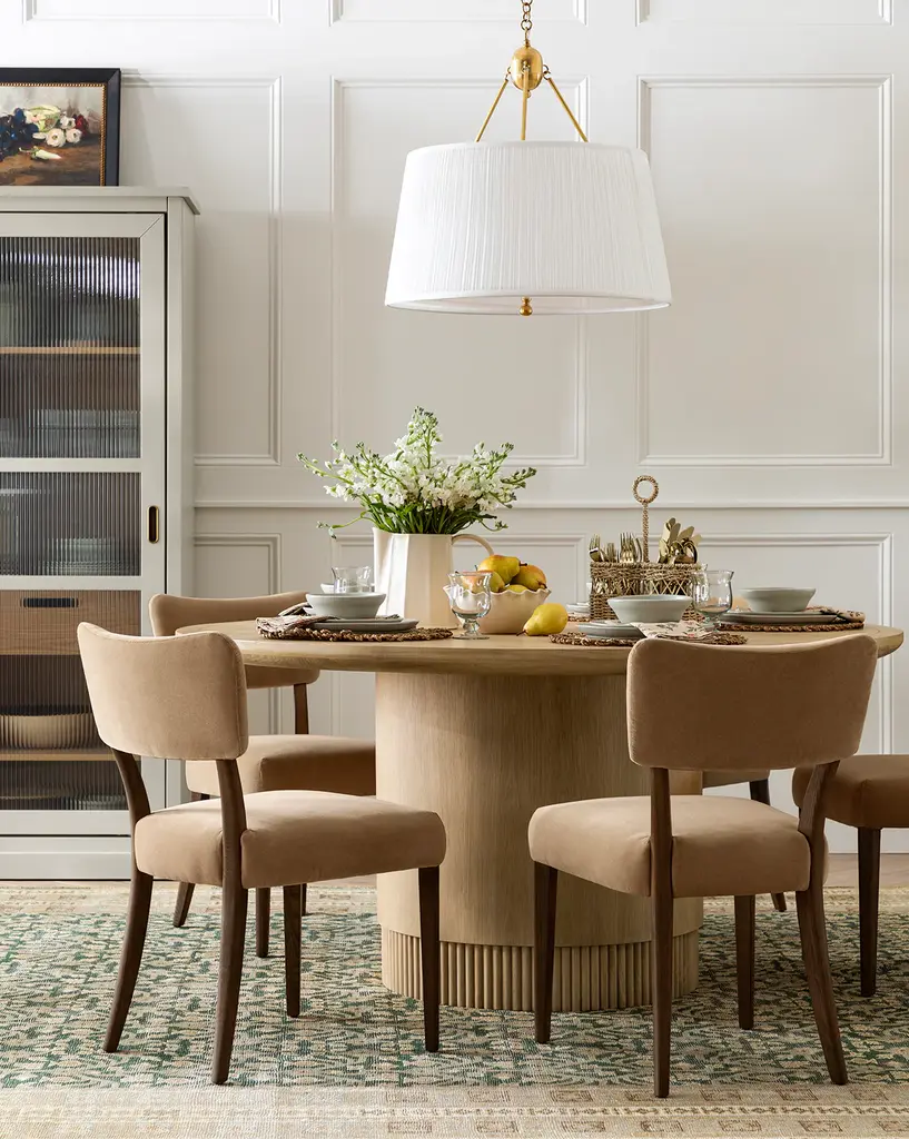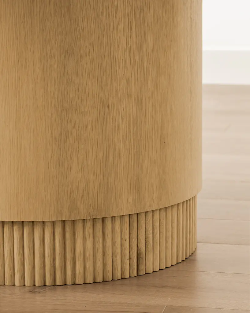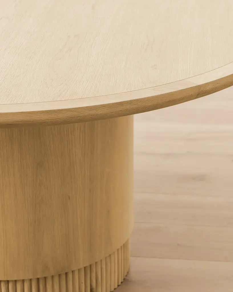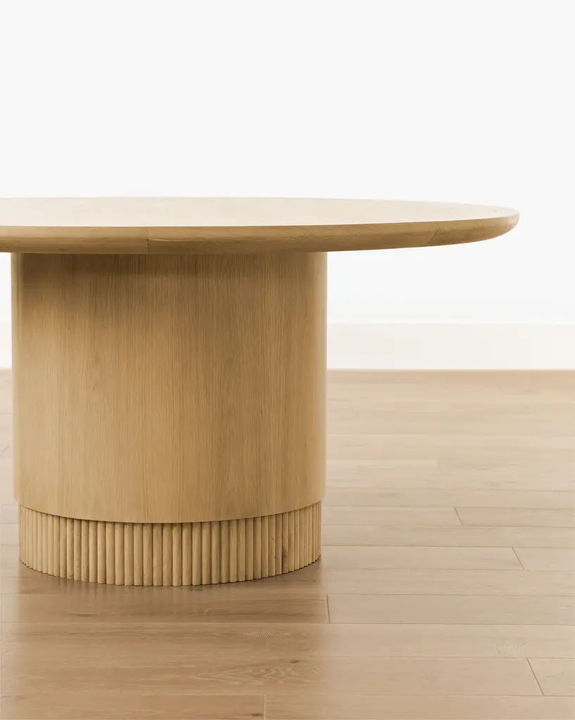Traditional in form and finished with our Heritage Oak Finish, our Gilroy Round Oak Dining Table is refined yet organic. Practical and inviting, the round table comfortably seats four to six people. Its reeded base provides subtle texture to your dining room or kitchen nook styling.