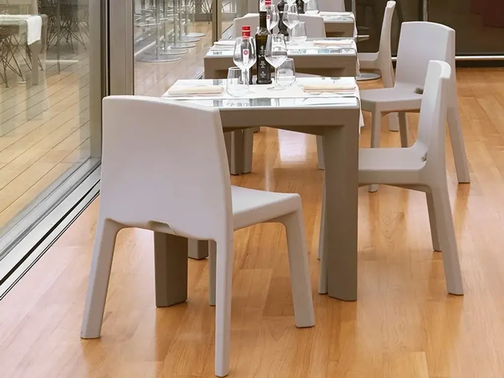 Strong, resistant and with a square shape, Gino is the perfect table for outdoor lunch and dinner together. Its linear design and its small size adapt in every kind of settings, both in private houses or contract. Gino is a functional table but it doesn’t give up a touch of class, thanks to the matt glass top applied to the polyethylene structure.Tempered glass top included.