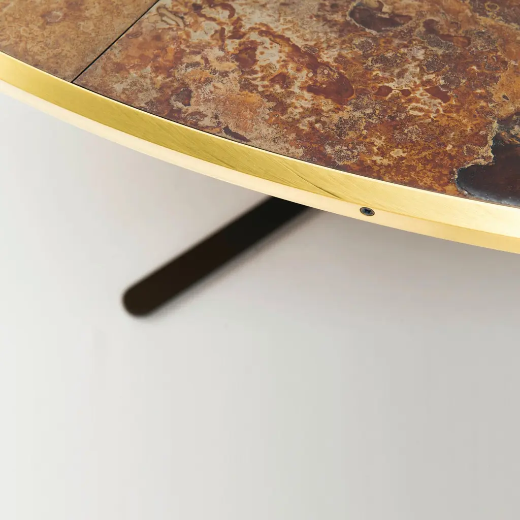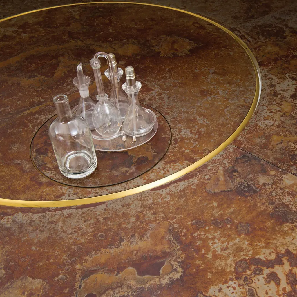 Giro is a rotating disk system dining table for the convivial experience to serve and share food. The plane is divided in three different circular elements that rotate independently on their axis. The central one is for serving the food while the smaller circle is for condiments and drinks. The external ring can rotate as well to simplify the setting of the table allowing the user to do so while standing in one place.The planes are in hand treated iron with matte finish embellished by brass details. All the pieces of the collection are handmade by artisans in the Milan area of Italy in respect of the local craftsmanship tradition.