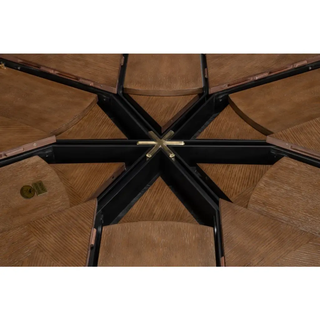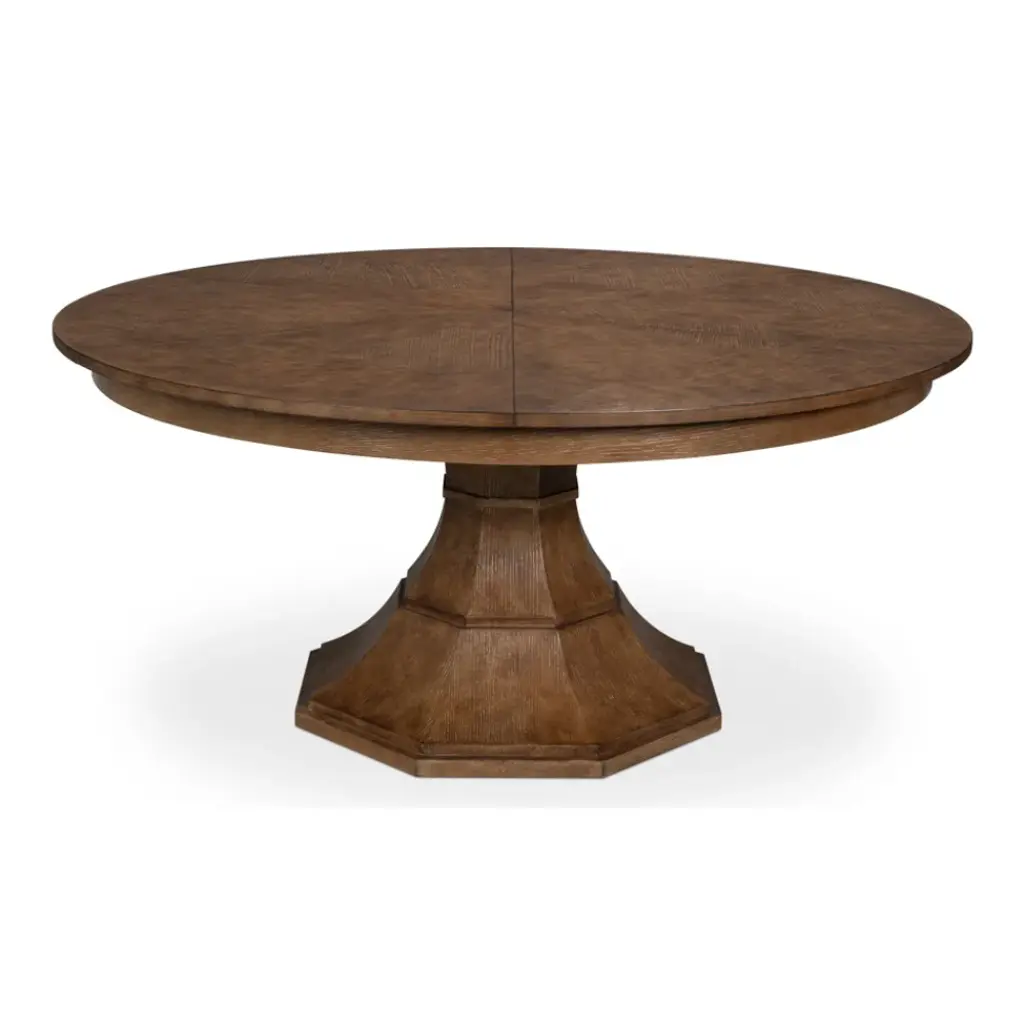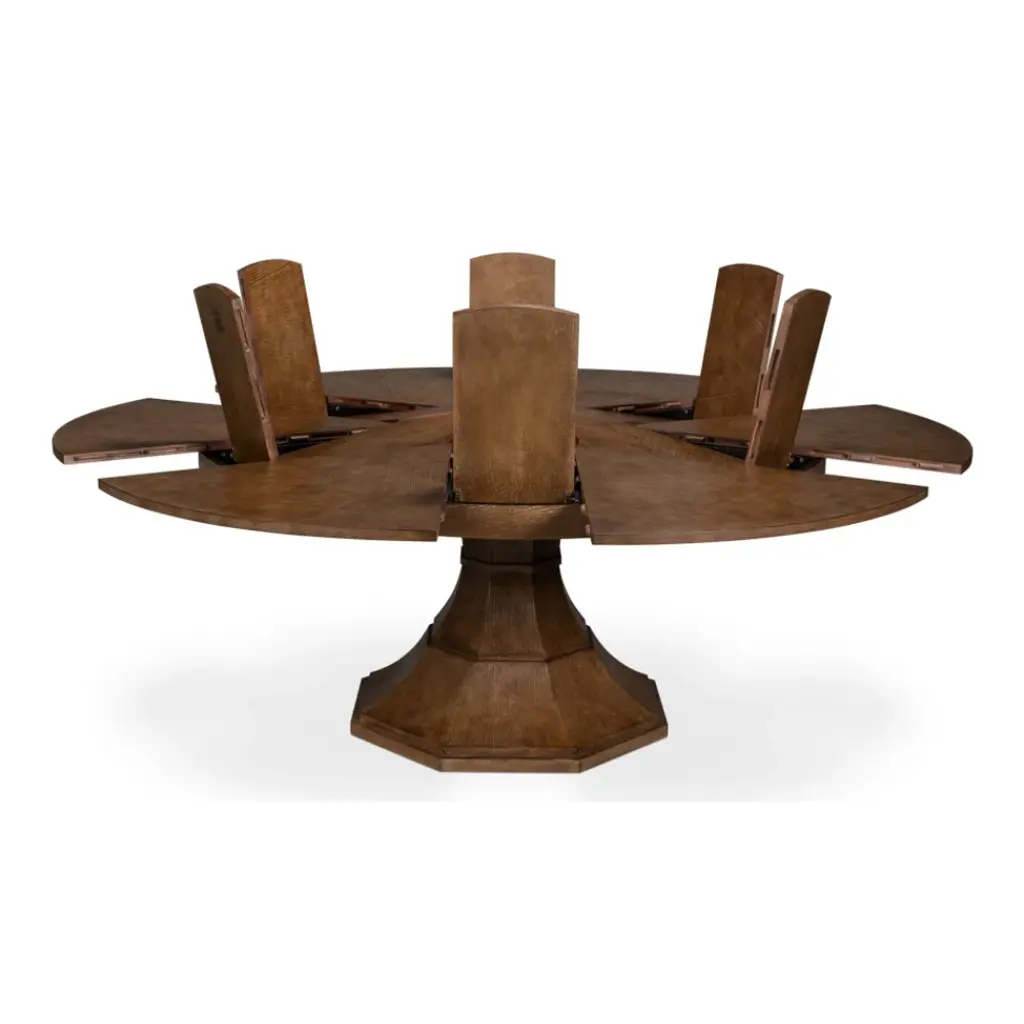 Our new and improved Jupe table is made with updated materials that add strength + durability, yet offer ease of expansion. As your guest list grows, so can your table. Masterful engineering allows this round Jupe dining table to adjust the size while concealing the leaves within. Transitional styling coupled with a rich old world walnut finish provides everlasting versatility. Everything about this table is head-turning, even its undulated shape when in an open position. Simply stunning!