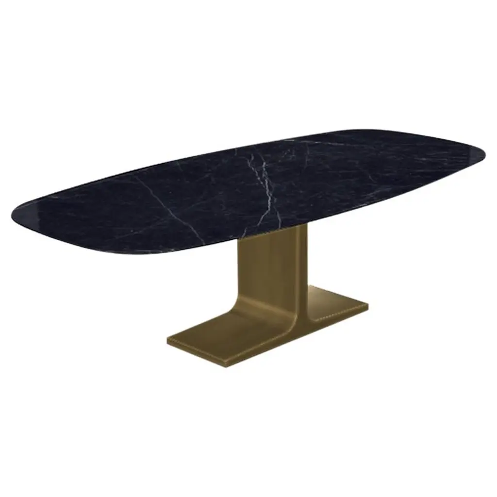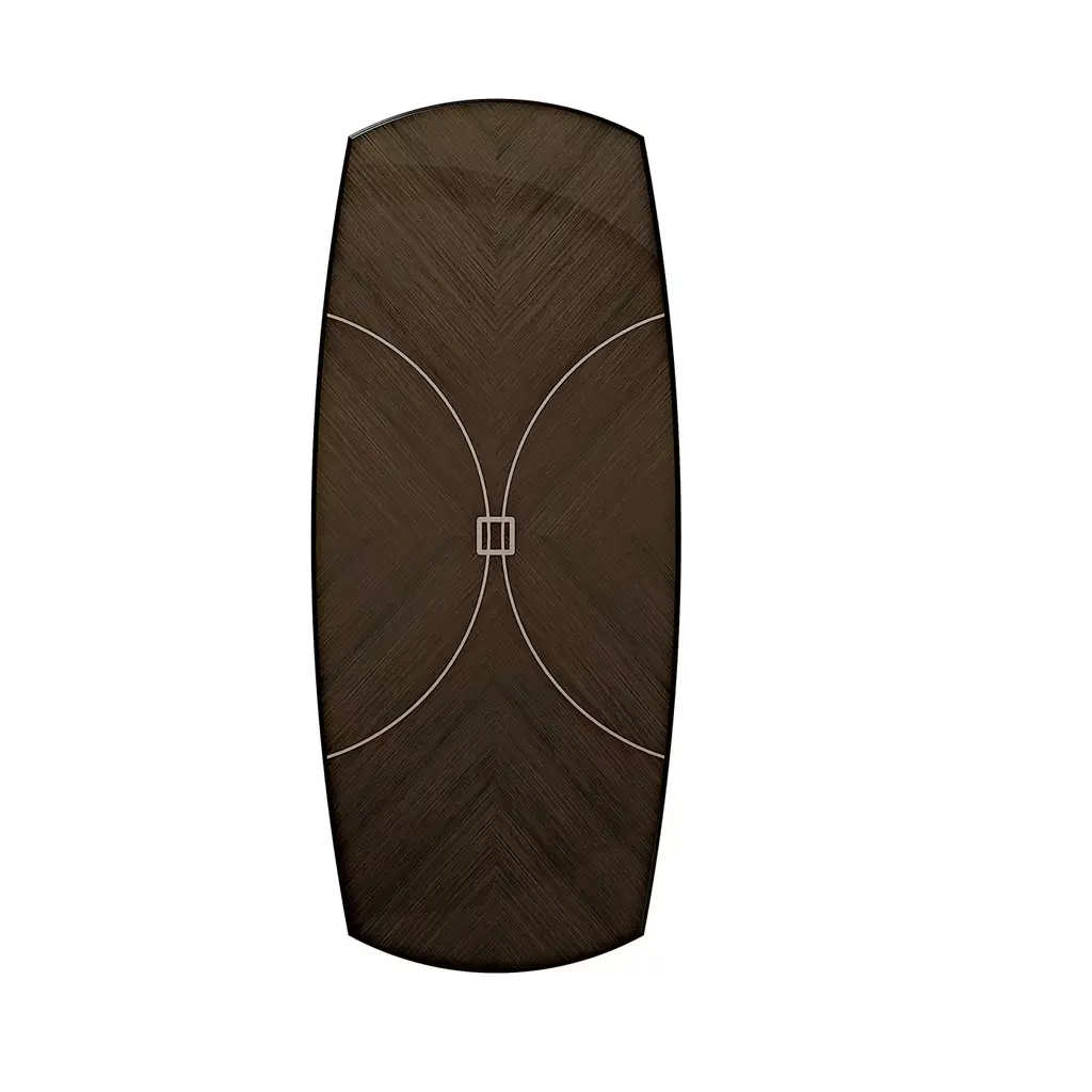 Part of the Glamour collection, this walnut dining table is made of a complex base created by bending wood, making it a piece of art. The top features a unique decor created by the application of a square and two arches for a luxurious experience. The barrel shape of the top makes the table more elegant thanks also to the base that resembles the wave shape typical of the collection. Different dimensions are available. Please ask Concierge for customization details.
