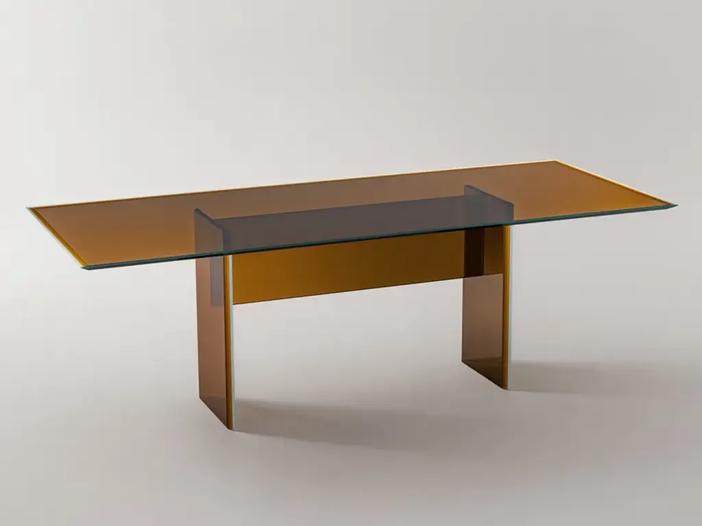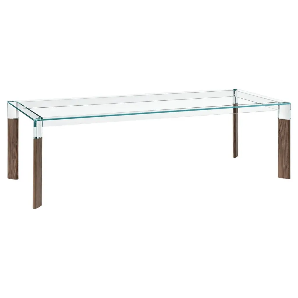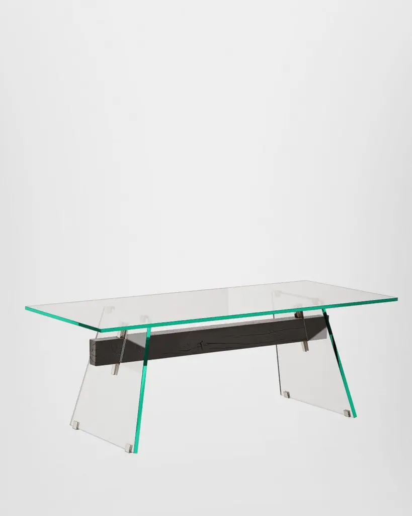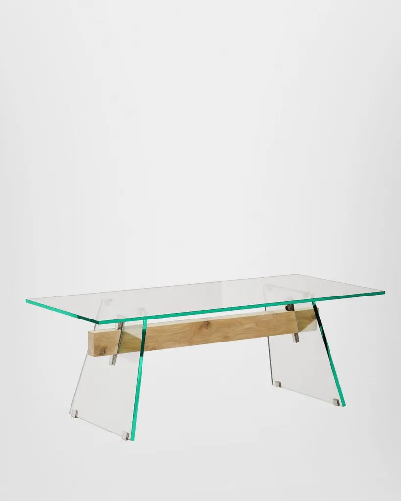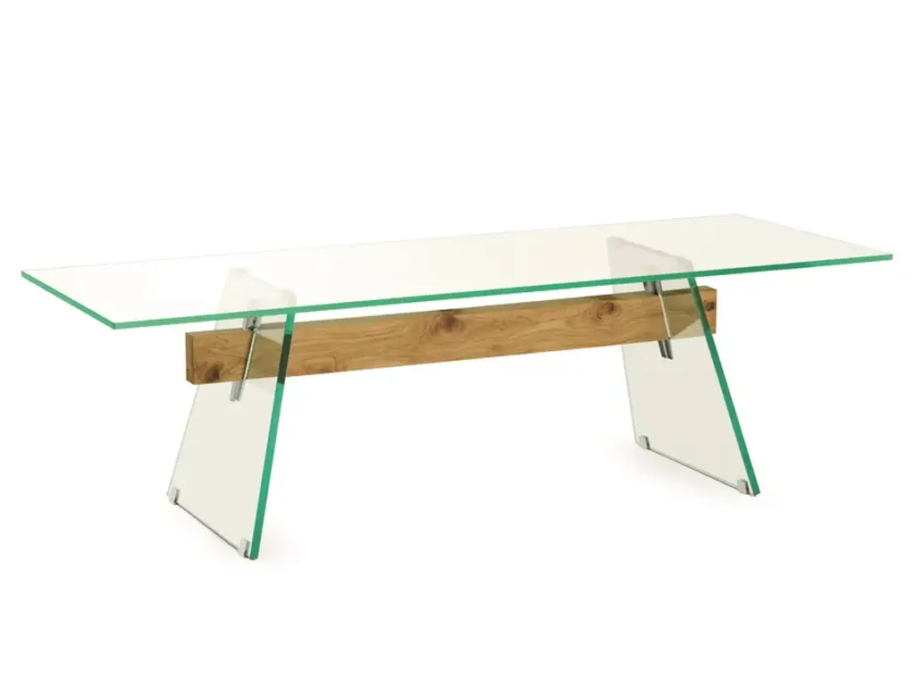 Series of rectangular dining tables with 19 mm transparent glass top and 24 mm tempered transparent glass base. A beam, made of a single thick wooden piece, passes through the inclined edged of the glass base sheets, uniting and supporting them. Polished chromed metal wedges are inserted into the tapered holes on the wooden beam, firmly holding the glass sheets of the base and giving it maximum stability and solidity. The beam, in solid oak, is available in two natural finishes: deeply brushed and wax finished or charred through a heat treatment. The feet and top supports are in polished chromed metal.Finish: wax, coalAvailable in different options, please inquire with us.DIMENSIONS:COMP01 L 220 - P 90 - H 74 cmCOMP02 L 240 - P 90 - H 74 cmCOMP03 L 250 - P 90 - H 74 cmCOMP04 L 220 - P 100 - H 74 cm COMP05 L 240 - P 100 - H 74 cmCOMP06 L 250 - P 100 - H 74 cmPrice refers to the COMP04 L 220 - P 100 - H 74 cm version