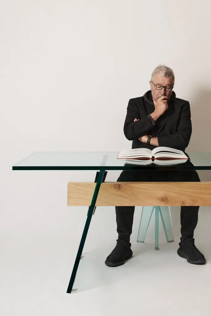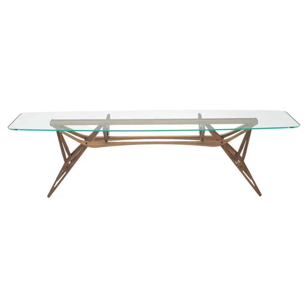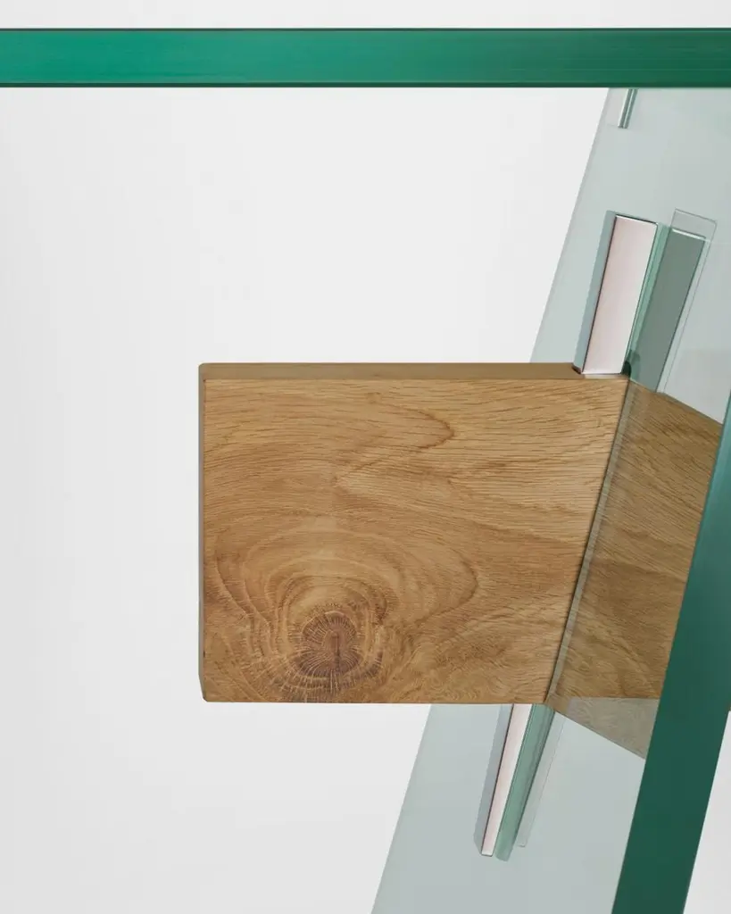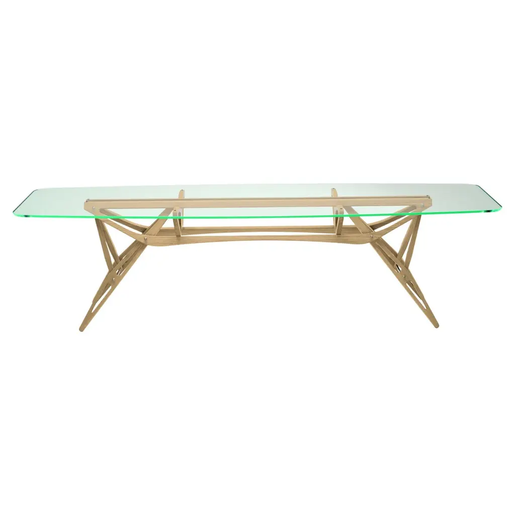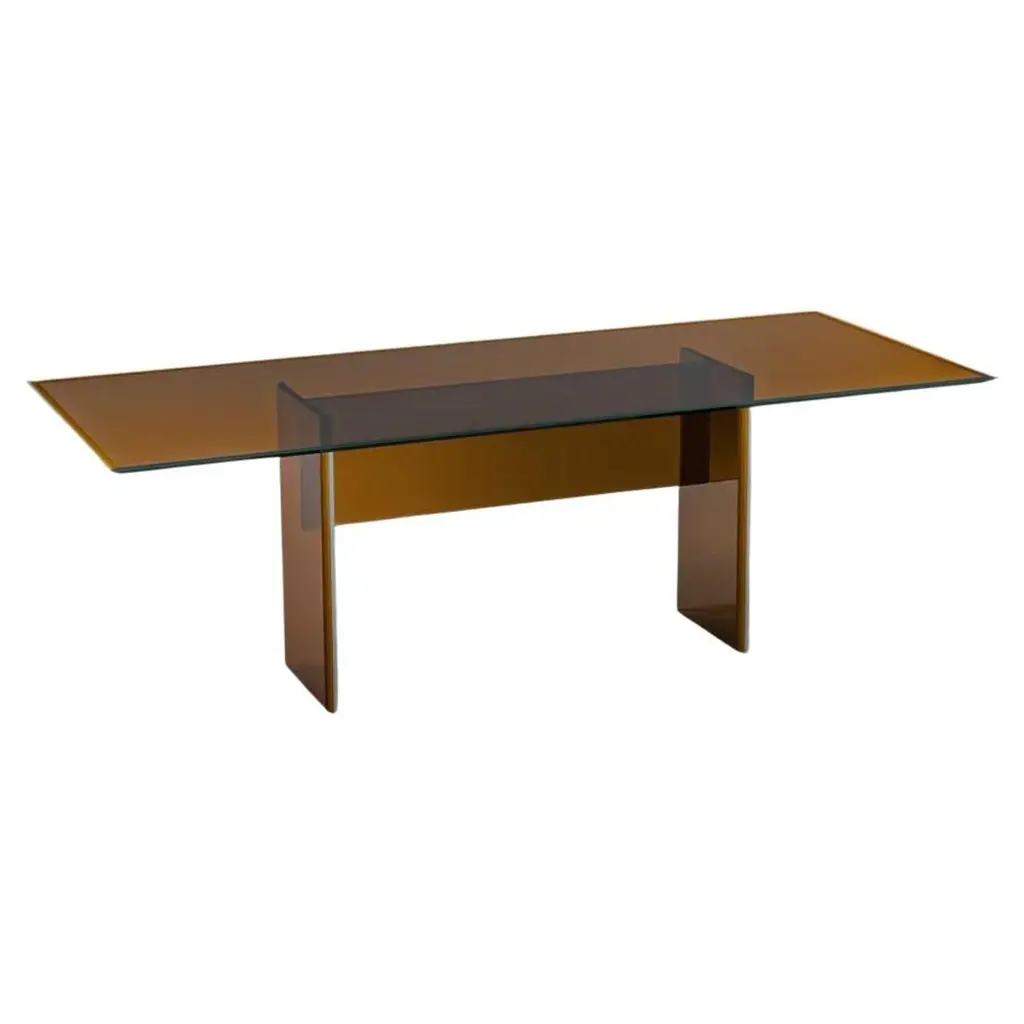 Series of rectangular dining tables with 19 mm transparent glass top and 24 mm tempered transparent glass base. A beam, made of a single thick wooden piece, passes through the inclined edged of the glass base sheets, uniting and supporting them. Polished chromed metal wedges are inserted into the tapered holes on the wooden beam, firmly holding the glass sheets of the base and giving it maximum stability and solidity. The beam, in solid oak, is available in two natural finishes: deeply brushed and wax finished or charred through a heat treatment. The feet and top supports are in polished chromed metal.Finish: wax, coalAvailable in different options, please inquire with us.DIMENSIONS:COMP01 L 220 - P 90 - H 74 cmCOMP02 L 240 - P 90 - H 74 cmCOMP03 L 250 - P 90 - H 74 cmCOMP04 L 220 - P 100 - H 74 cm COMP05 L 240 - P 100 - H 74 cmCOMP06 L 250 - P 100 - H 74 cmPrice refers to the COMP04 L 220 - P 100 - H 74 cm version