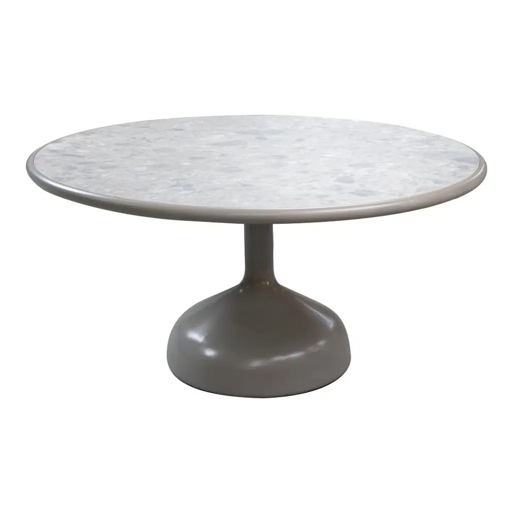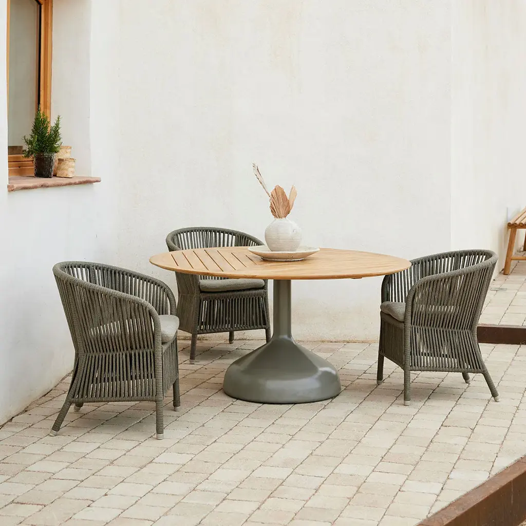 Glaze is a round outdoor dining table that is the epitome of modern elegance for your outdoor space. Designed by Cane-line Design, this beautiful dining table offers a choice between a multicoloured ceramic tabletop with texture, a glazed lava stone tabletop with captivating circular patterns or a warm teak tabletop. The table base features a beautiful silhouette of aluminium with a steel core, to ensure stability. Elevate your outdoor dining experience with Glaze and its artful design of a dining table.
