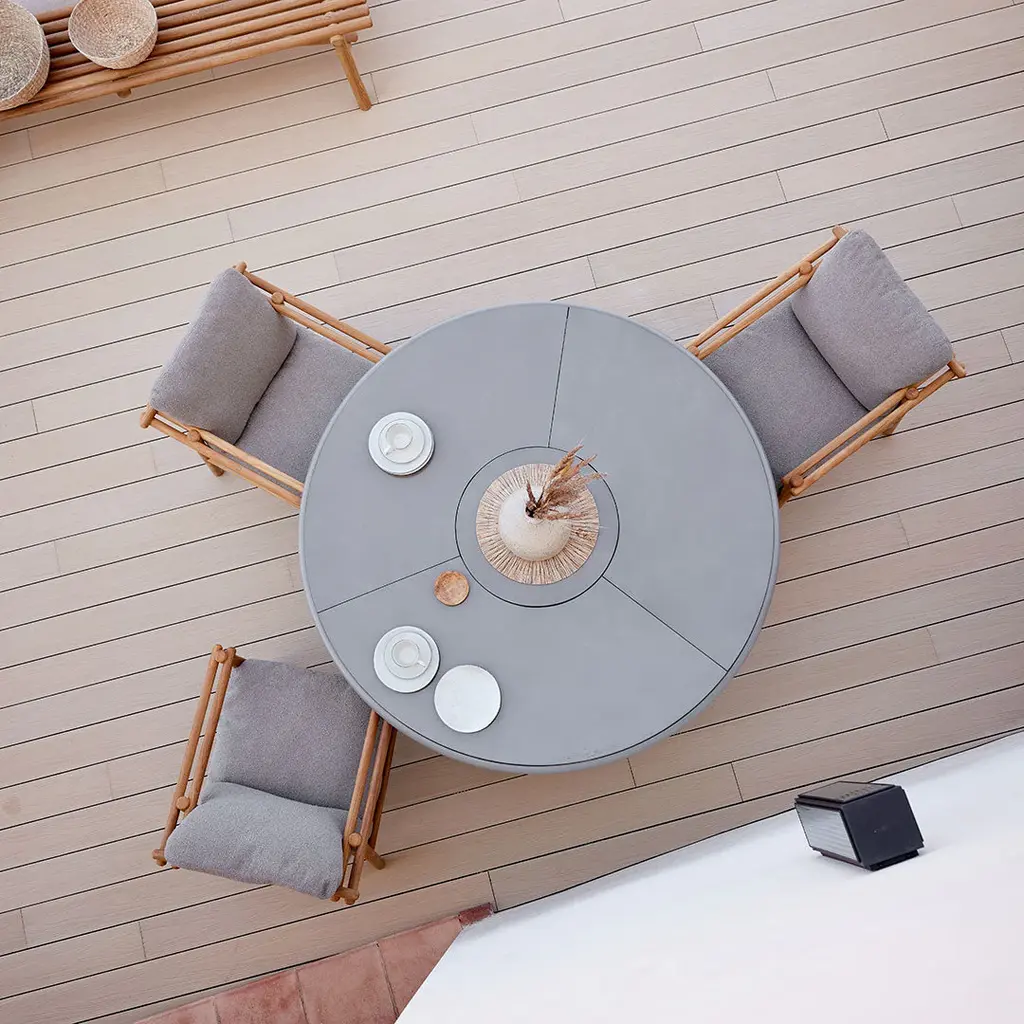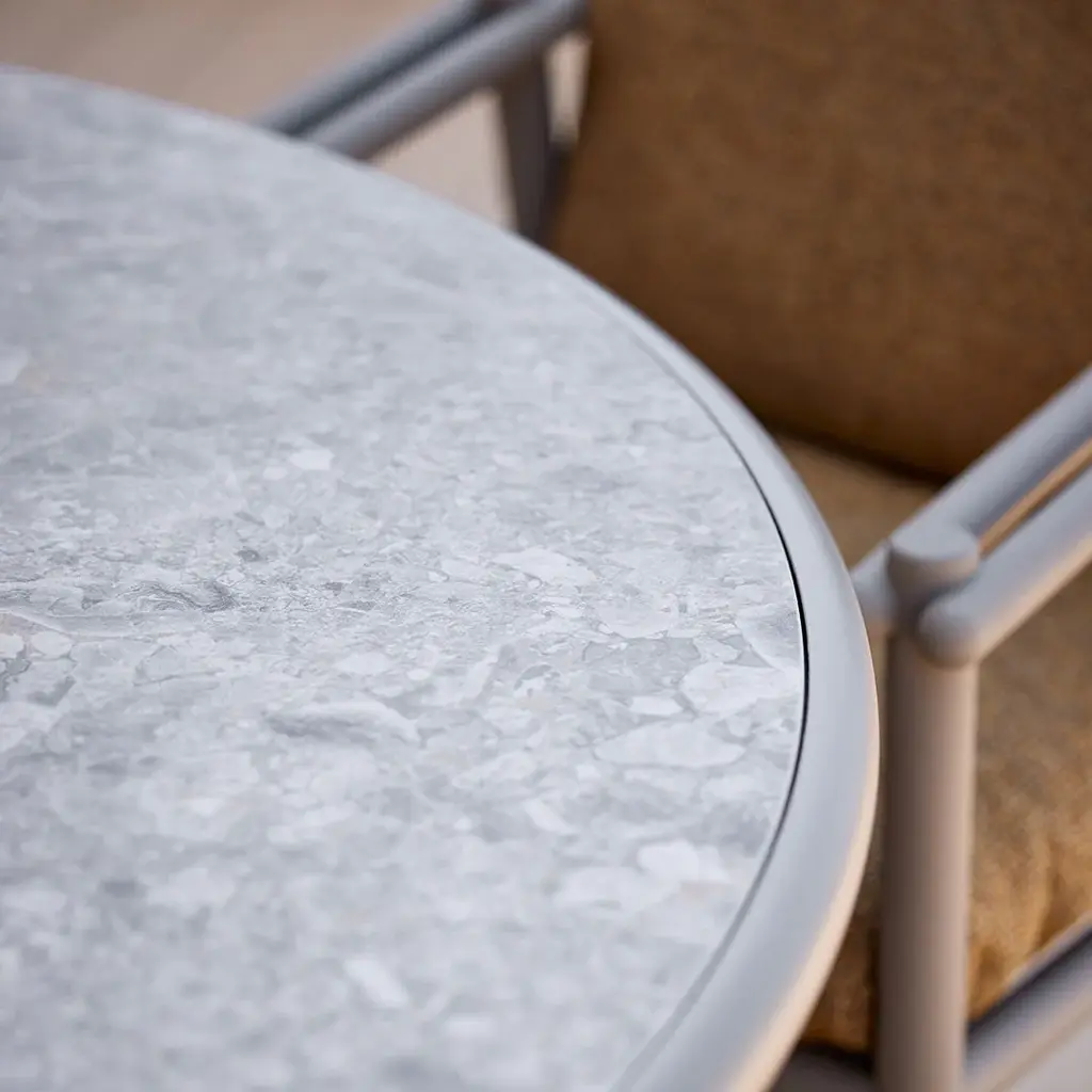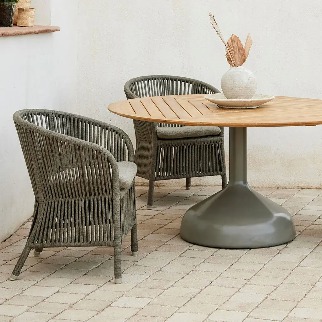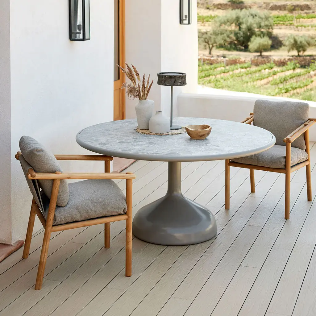 Glaze is a round outdoor dining table that is the epitome of modern elegance for your outdoor space. Designed by Cane-line Design, this beautiful dining table offers a choice between a multicoloured ceramic tabletop with texture, a glazed lava stone tabletop with captivating circular patterns or a warm teak tabletop. The table base features a beautiful silhouette of aluminium with a steel core, to ensure stability. Elevate your outdoor dining experience with Glaze and its artful design of a dining table.
