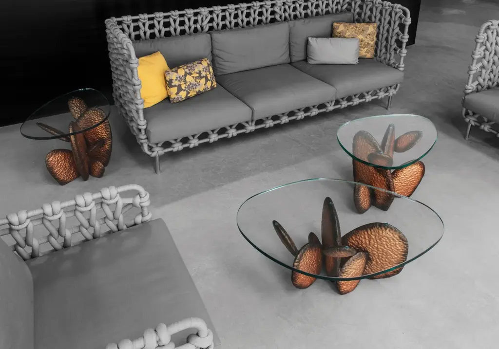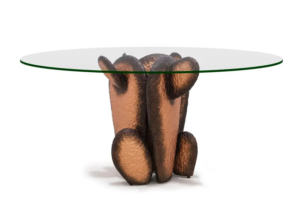 Gobi dining table by Kenneth CobonpueMaterials: Steel, Glass. Dimensions: Glass diameter 150 cm x height 19mm Base 60 cm x 58.5 cm x height 75 cmInspired by the characteristic form of the cactus, Gobi is a striking set of tables with its copper tones and hammered finish. Each piece is handmade and unique creating rich visual textures, made not only to be decorative but also functional.Designer's BiographyKenneth Cobonpue is a multi-awarded furniture designer and manufacturer from Cebu, Philippines. His passage to design began in 1987, studying Industrial Design at the Pratt Institute in New York. While completing his studies, he apprenticed for a leather and wood workshop near Florence, Italy. He went on to study Furniture Marketing and Production at the Export-Akademie Baden-Württemberg in Reutlingen, Germany, under a private and state scholarship program, and subsequently worked in Bielefeld and Munich.Kenneth returned home to Cebu in 1996 to manage Interior Crafts of the Islands, Inc., a furniture design and manufacturing company founded by his mother Betty Cobonpue in 1972. Discovering that modern design could have a new face using natural fibers and materials, Kenneth created pieces of functional art, offering an alternative to the Western definition of modern design. Today, the Kennethcobonpue brand has become known globally for its unique designs and extensive roster of clientele, including Hollywood celebrities and members of royalty.With his masterful way of integrating nature, traditional craft and innovative technologies, designer and creative director Kenneth Cobonpue has earned international awards and recognition for his creative, organic, and expressive pieces. Working closely with some of the world’s leading designers, from household names to emerging talents, Kenneth has been pushing the envelope for design in the Philippines and sharing his vision to a global audience. Awards to his credit include five Japan Good Design Awards, the grand prize at Singapore International Design Competition, the Design for Asia Award of Hong Kong, the American Society of Interior Design Top Pick selection and the French Coup de Coeur award. Several of his designs were selected for several editions of the International Design Yearbook published in London and New York. Phaidon’s book entitled “& FORK” underscores Kenneth’s position as a leader of a new movement incorporating new technologies with crafts. In 2007, TIME magazine called him “rattan’s first virtuoso”. Kenneth was named the Designer of the Year in the first edition of Maison et Objet Asia held in March 2014 in Singapore.Kenneth reveals new work each year in the design shows from Milan to New York, and he speaks regularly about Southeast Asian design all over the world. He has also appeared in European television and in countless international magazines and newspapers around the world. Various Cobonpue designs have also appeared in full-length feature films and television, such as Oceans 13 and CSI.