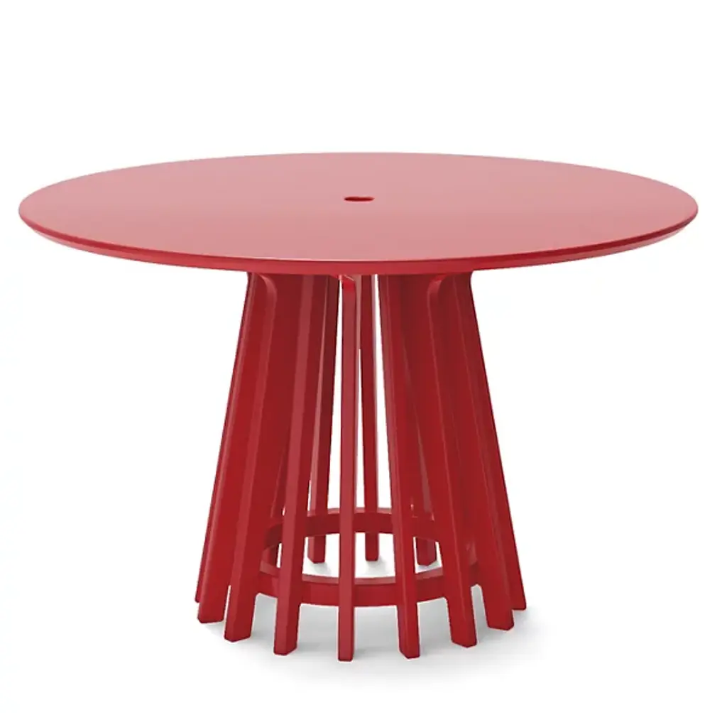 Reaching beyond pure functionality, the Good Company Outdoor Dining Table by Loll Designs is a sculptural focus for outdoor living and gathering spaces. Its elegantly shaped conical slat base and beveled disc top are constructed from a recycled milk jug base, showcasing sustainable materials. The open design draws you into convivial conversations with contemporary eco-charm. The plastic jugs are then enhanced with vibrant colors and versatile designs, adding airy, slat-style construction ideal for standing up to the rigors of outdoor spaces, inviting you to linger longer over meals outdoors.