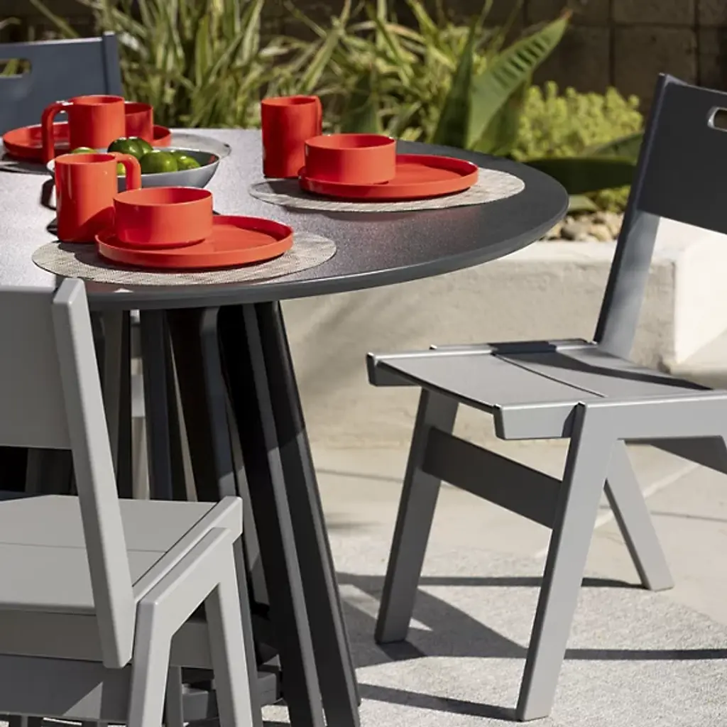 Reaching beyond pure functionality, the Good Company Outdoor Dining Table by Loll Designs is a sculptural focus for outdoor living and gathering spaces. Its elegantly shaped conical slat base and beveled disc top are constructed from a recycled milk jug base, showcasing sustainable materials. The open design draws you into convivial conversations with contemporary eco-charm. The plastic jugs are then enhanced with vibrant colors and versatile designs, adding airy, slat-style construction ideal for standing up to the rigors of outdoor spaces, inviting you to linger longer over meals outdoors.