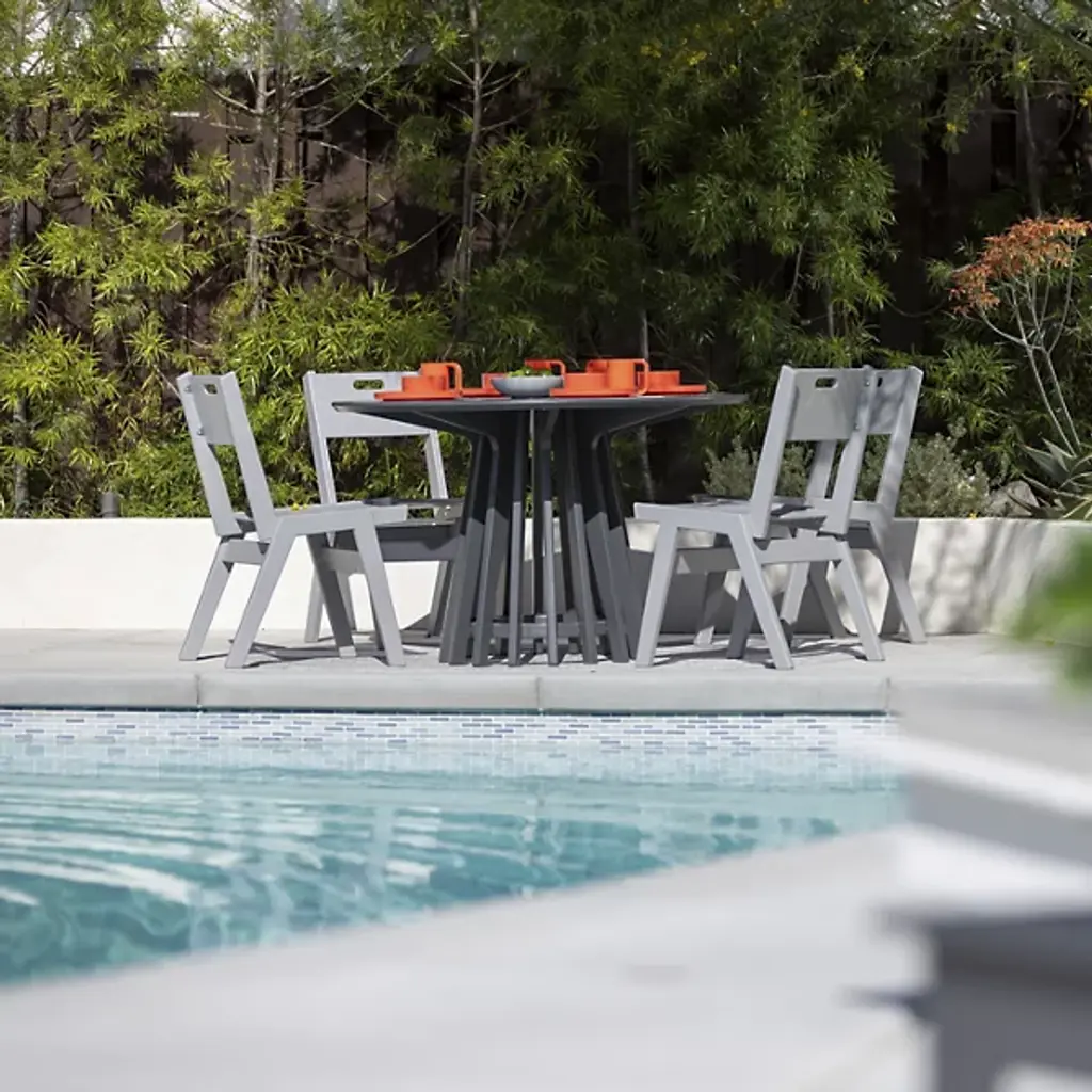 Reaching beyond pure functionality, the Good Company Outdoor Dining Table by Loll Designs is a sculptural focus for outdoor living and gathering spaces. Its elegantly shaped conical slat base and beveled disc top are constructed from a recycled milk jug base, showcasing sustainable materials. The open design draws you into convivial conversations with contemporary eco-charm. The plastic jugs are then enhanced with vibrant colors and versatile designs, adding airy, slat-style construction ideal for standing up to the rigors of outdoor spaces, inviting you to linger longer over meals outdoors.
