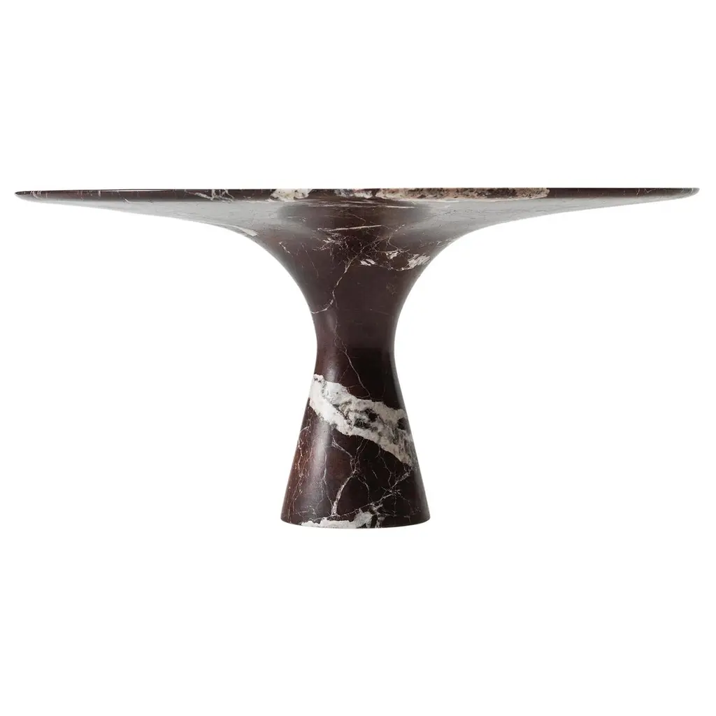 Grafite refined contemporary marble dining table 160/75Dimensions: 160 x 75 cmMaterials: GrafiteAngelo is the essence of a round table in natural stone, a sculptural shape in robust material with elegant lines and refined finishes.The collection consists of a round/oval dining or conference table, side tables and lower tables.Suitable for both indoor and outdoor use!All tables are made by order and finished by hand to be sure that the tabletop and base become one pieceThe basic collection consists of 9 different marbles and different standard dimensions, however on request we make to measure.Almost any size or marble is possible!All tables are signed and numbered (the low and side tables are only signed).All tables are impregnated with Lithofin Nanotop. This protection is not visible and the marble keeps its natural look and feel. With the delivery of every table, a maintenance set of Lithofin is included.The production time is standard 12 weeks.The design Angelo is the essence of a round or oval table in natural stone, it features a sculptural form, sturdy material, an elegant line and a refined finish. Two elements, table base and top, form one whole together. The bottom is one running curve from table foot to edge. The conical connection creates a stabile whole.To show the marble in it’s most expressive character, different finishes are possible (polished, honed, brushed, striped, sandblasted & brushed). The basic collection consists of nine different types of marble and different sizes. On request this design can be executed in almost any type of marble and on measure. This table is perfectly suitable in a housing, retail or office environment. As the table is supported by one central foot it creates a lot of flexibility in seating. Executed in hard variations of natural stone suited for external use, this design can be a perfect garden table or sculpture.Angelo M/R 130 : ø 130 x 75 cmAngelo M/R 160 : ø 160 x 75 cmAngelo M/R 180 : ø 180 x 75 cmAngelo M/O 210 : 210 x 135 x 75 cmAngelo M/O 250 : 250 x 160 x 75 cmAngelo M/O 290 : 290 x 160 x 75 cm. The basic collection is available in the following marbles: Kyknos, Grafite, Travertino Rosso, grey saint Laurent, Picasso green, port saint Laurent, Travertino silver, Rosso Lepanto and Bianco Statuarietto in a honed finish. On request different sizes, finishes and marbles are possible. AwardsGood Design Award – Chicago, USA (2018)People’s Choice, AZ Award – Toronto, Canada (2019)German Design Award – Frankfurt, Germany (2020).