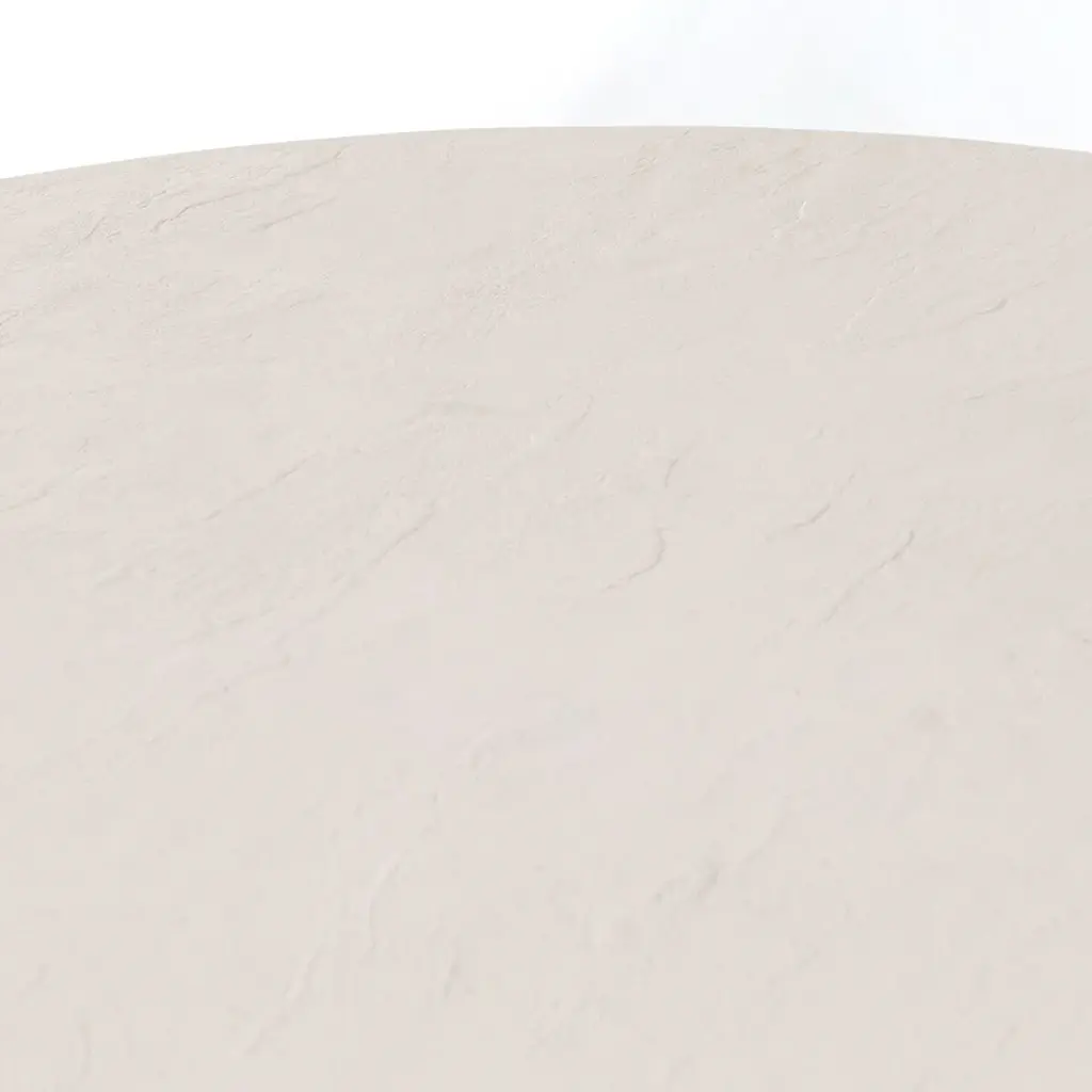 Adobe vibes. Made from white-finished concrete, a voluminous clover-shaped base supports a thick-rounded tabletop for dramatic scale. Soft yet textured look pairs with a wide range of seating, from natural woods to leather, and more. Ships In 10-14 Business Days Clover-shaped matching concrete base Round white finish concrete top This image is for illustrative purposes only. The colors shown are accurate within the constraints of lighting, photography, and the color accuracy of your screen.