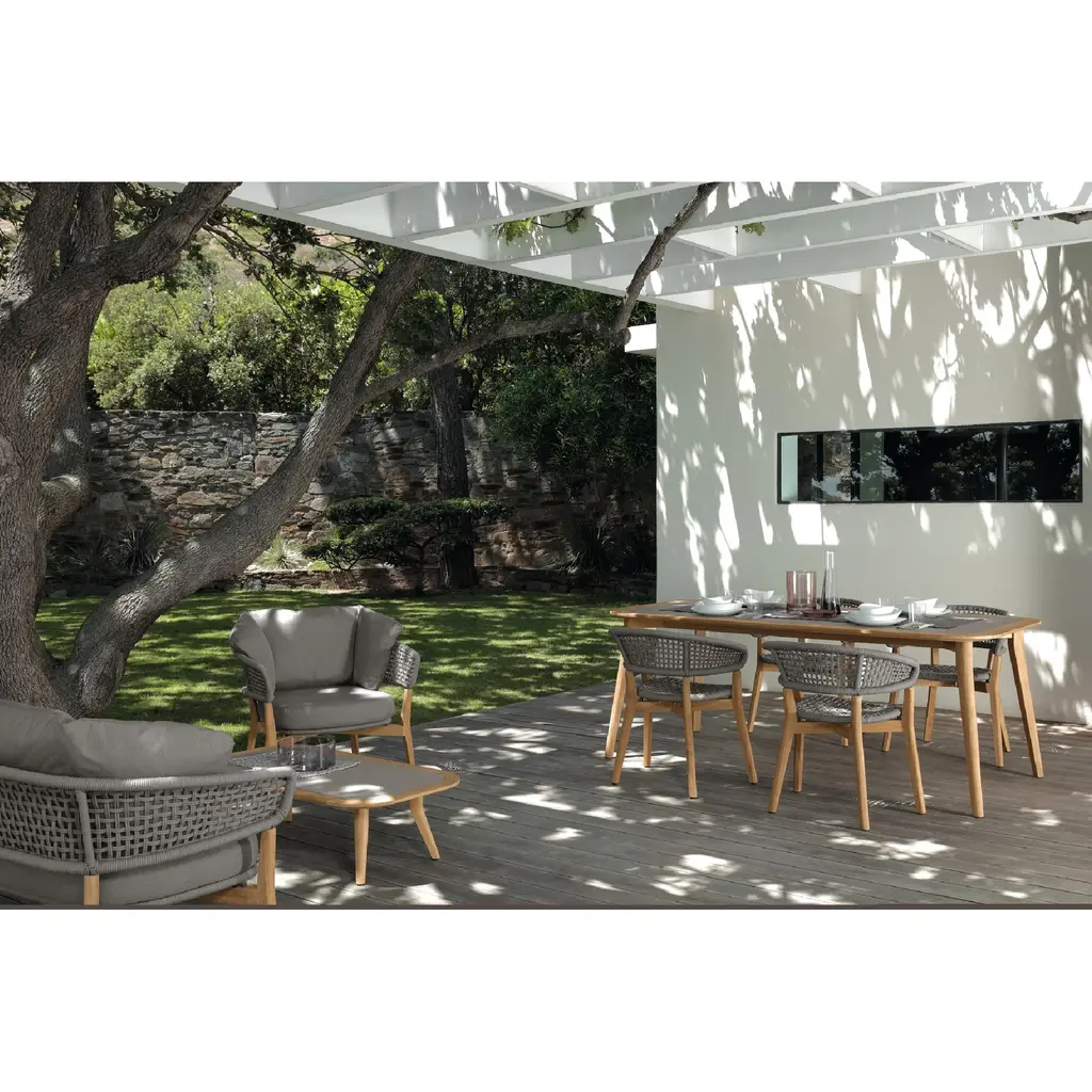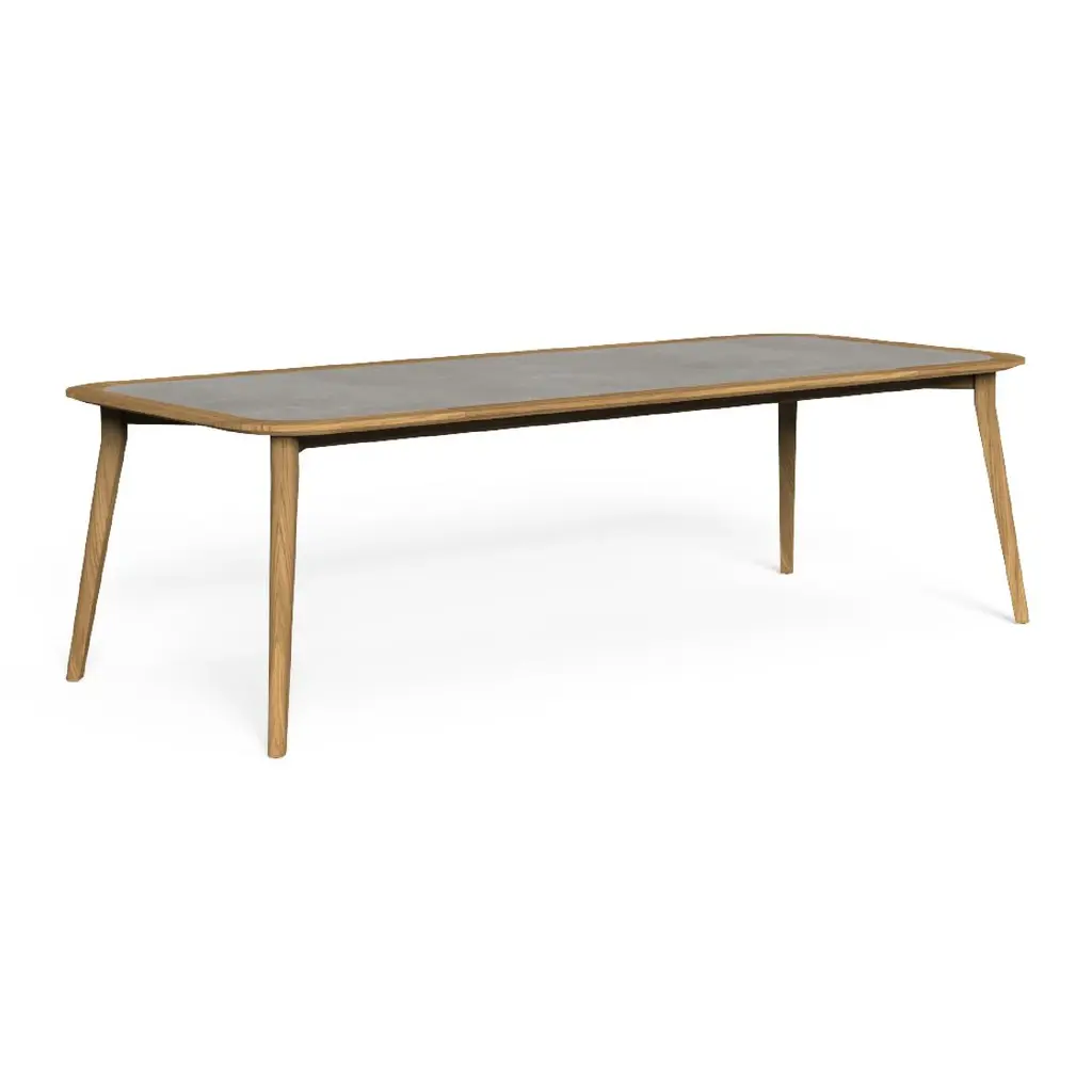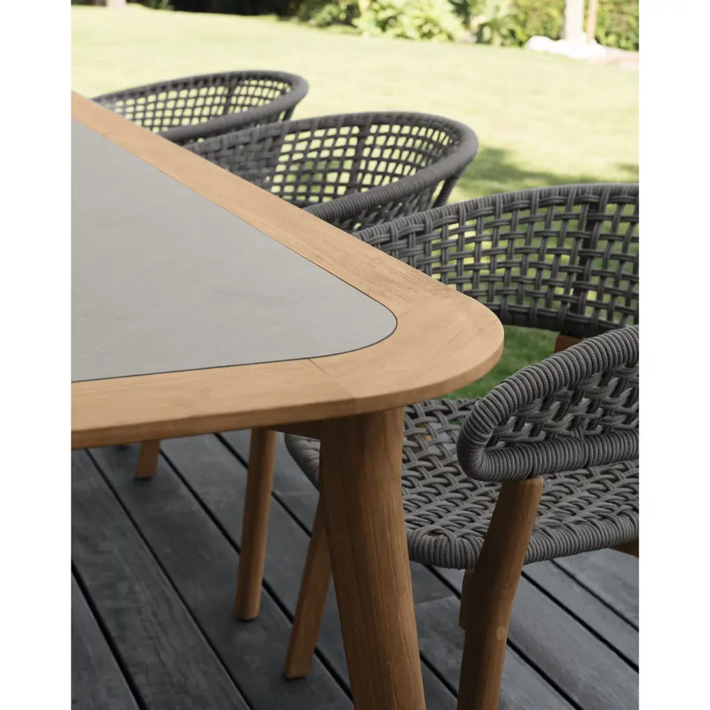 Indulge in outdoor dining with style and sophistication. The Moon dining table features a natural teak structure and perimeter, perfectly complemented by a sleek gray HPL top. Designed to bring the comforts of indoor living to your outdoor space, this table exudes luxury and refinement.