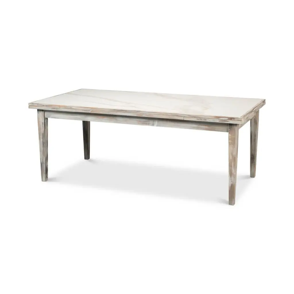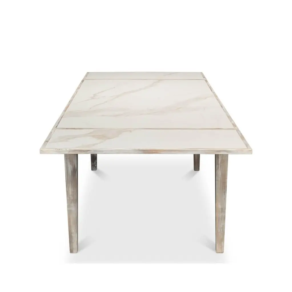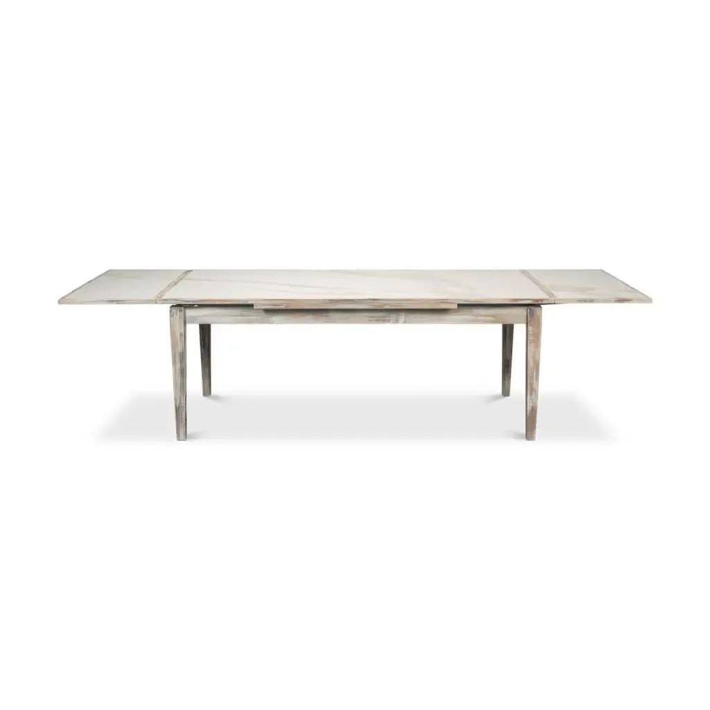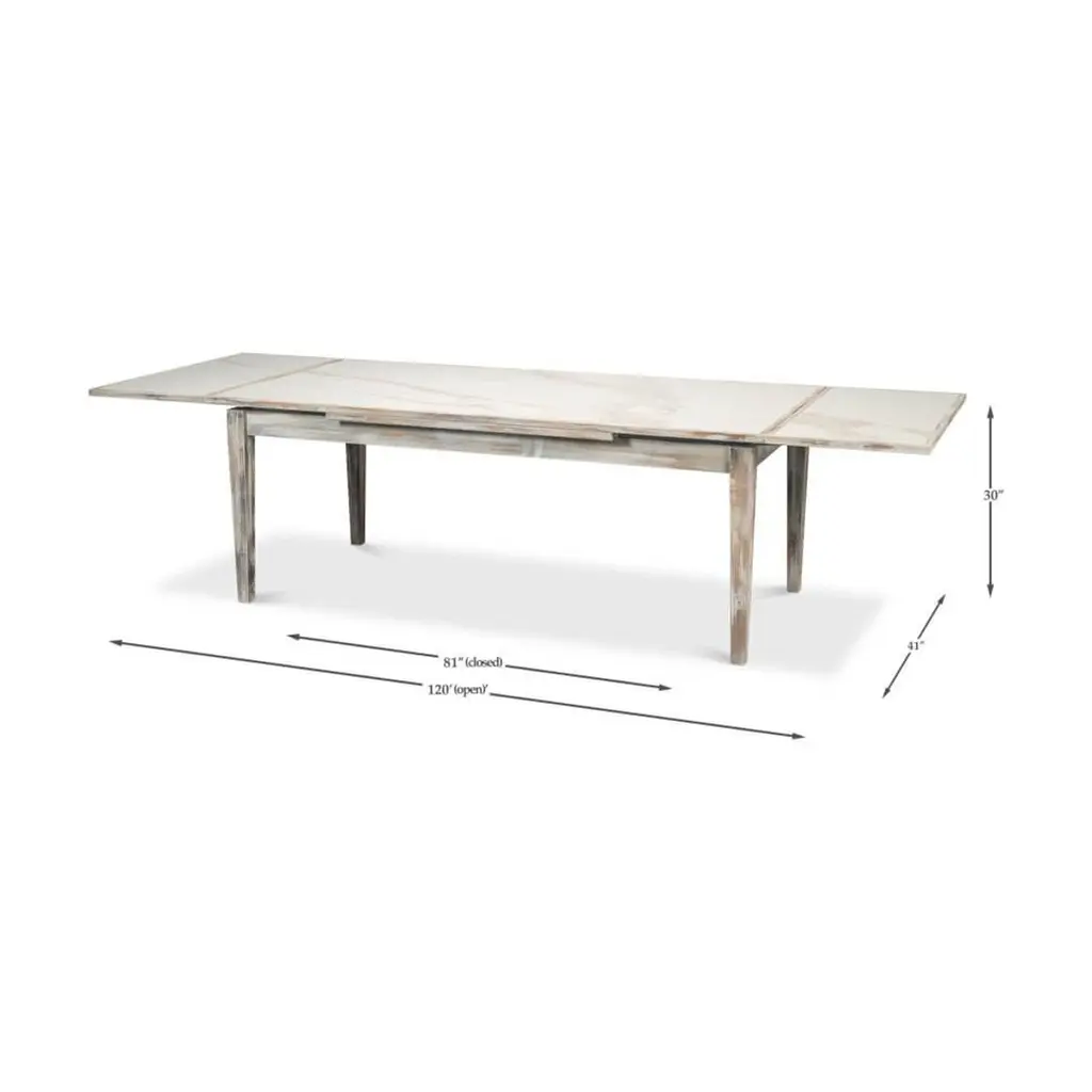 The table is a versatile piece that transforms from an 81-inch table to a 120-inch long dining table. This unique extendable design makes it a perfect choice for various occasions and space requirements.Featuring a marbleized porcelain inset in each top section, the table offers a luxurious and durable surface that combines classic aesthetics with modern functionality. This exquisite detail comfortably seats 6 to 8 people, making it ideal for gatherings and family dinners.Open dimensions: 120" W x 41" D x 30.5" HClosed dimensions: 81" W x 41" D x 30.5" H