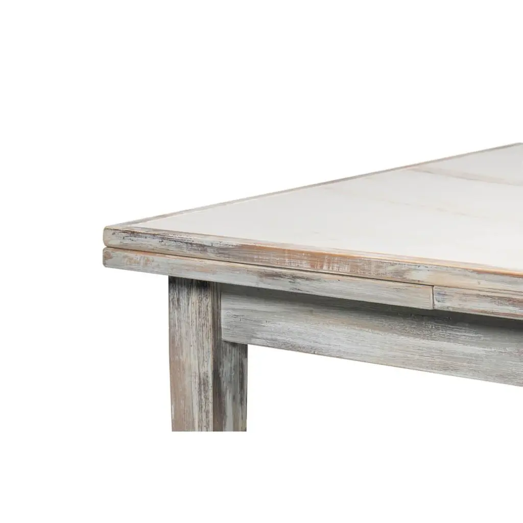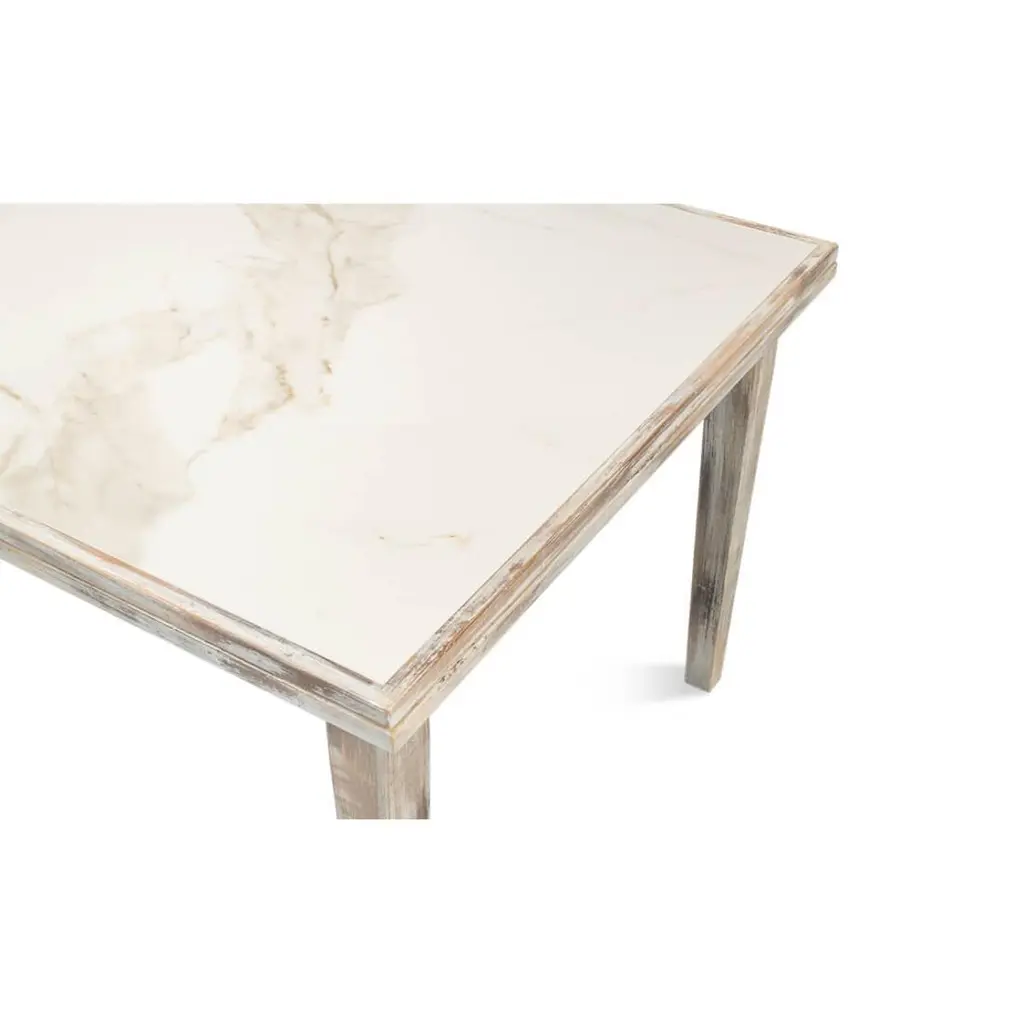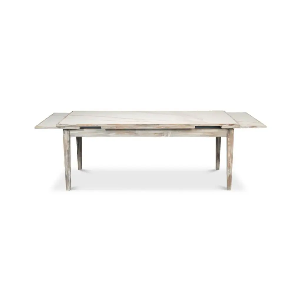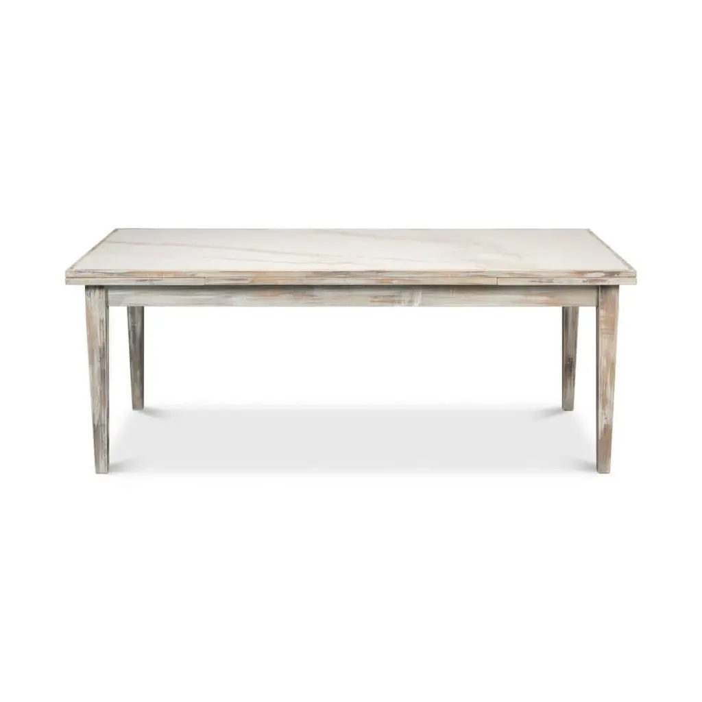 The table is a versatile piece that transforms from an 81-inch table to a 120-inch long dining table. This unique extendable design makes it a perfect choice for various occasions and space requirements.Featuring a marbleized porcelain inset in each top section, the table offers a luxurious and durable surface that combines classic aesthetics with modern functionality. This exquisite detail comfortably seats 6 to 8 people, making it ideal for gatherings and family dinners.Open dimensions: 120" W x 41" D x 30.5" HClosed dimensions: 81" W x 41" D x 30.5" H