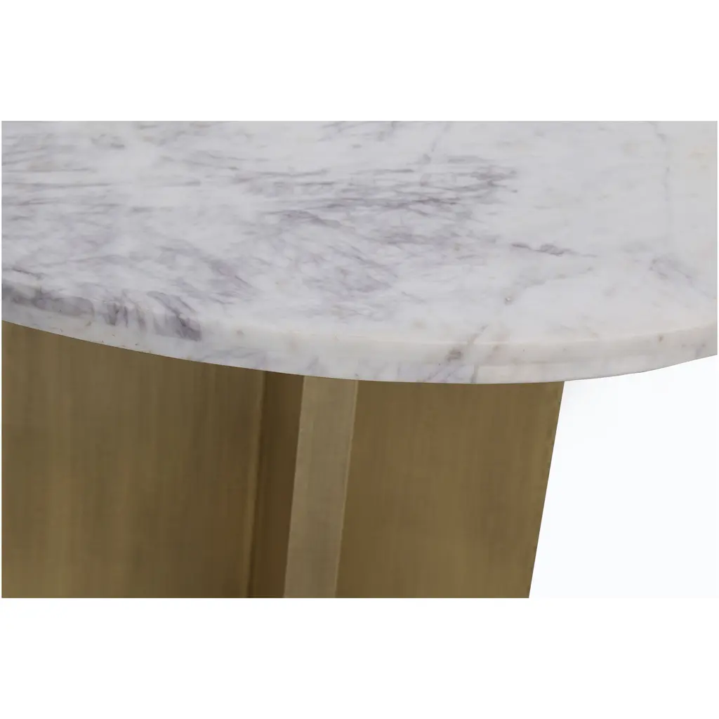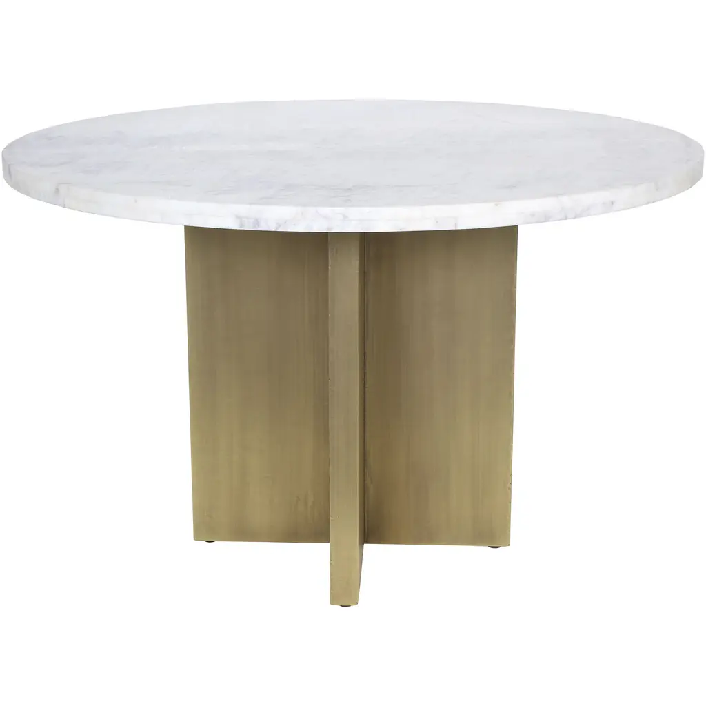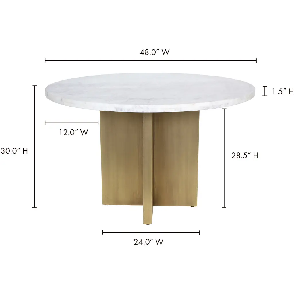 Grace your dining room with the remarkable and contemporary style of the Graze dining table. The sleek white marble top and sectioned iron base are complemented with a bold brass finish. The circular design offers seating for six people, making the Graze dining table a great option for sociable condo living.