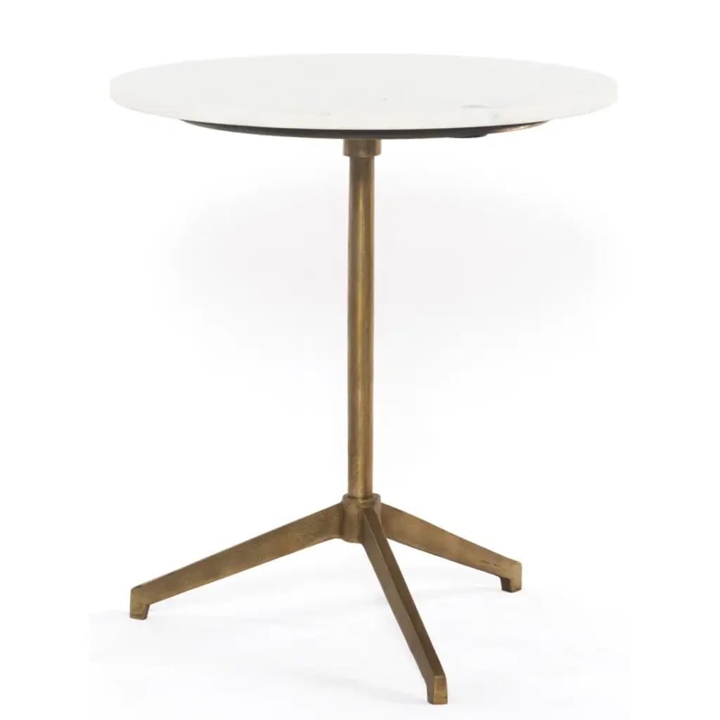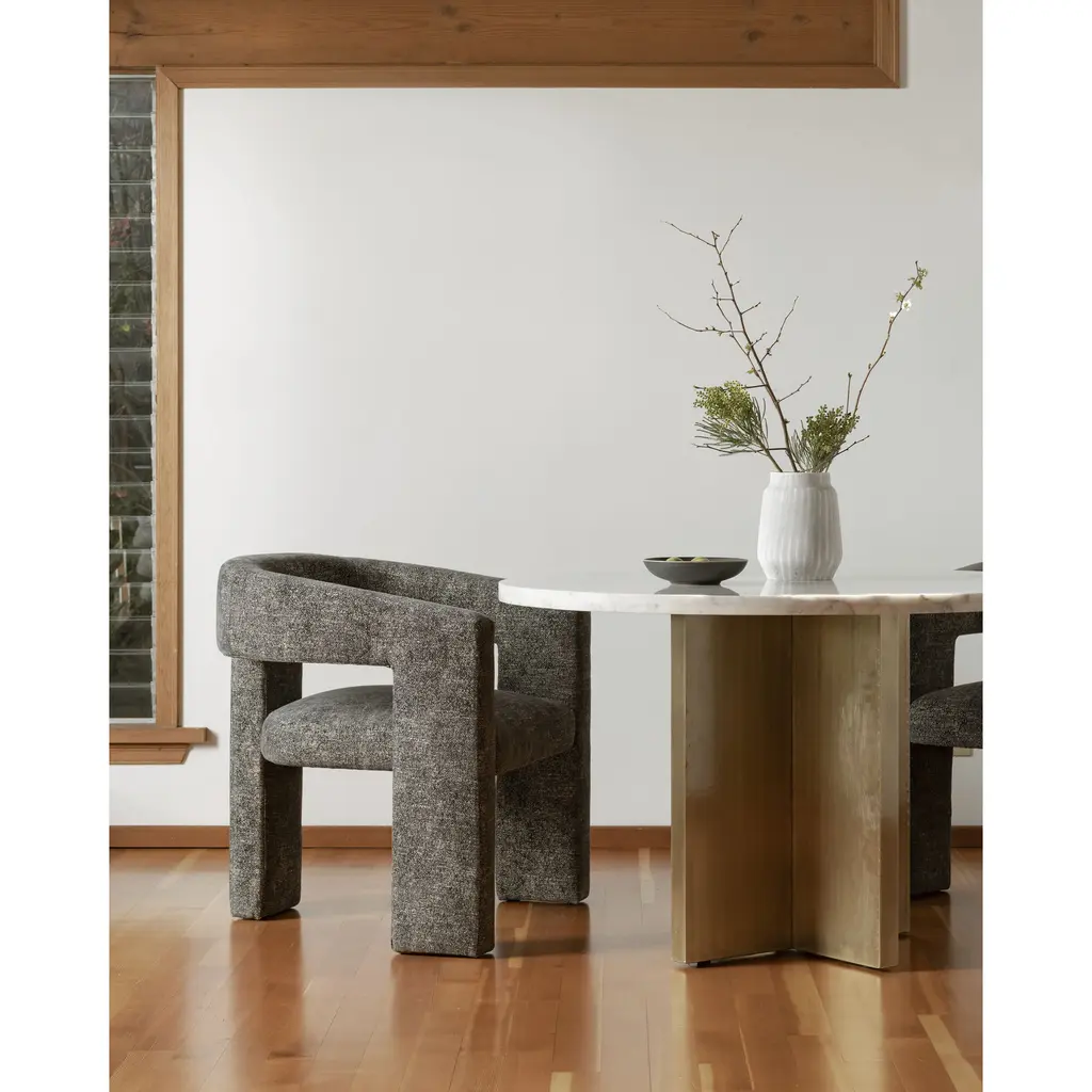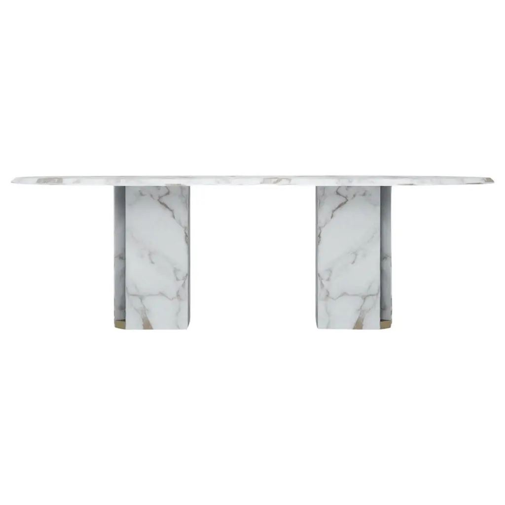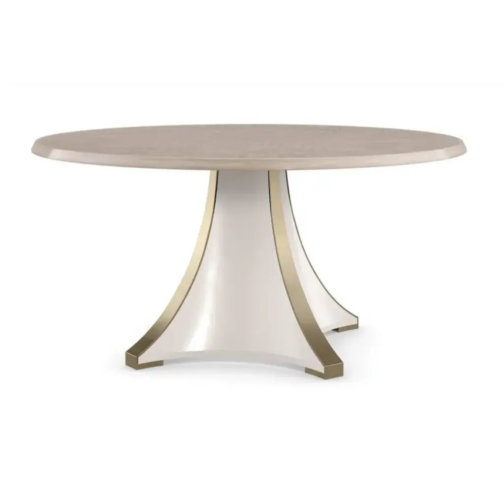 Grace your dining room with the remarkable and contemporary style of the Graze dining table. The sleek white marble top and sectioned iron base are complemented with a bold brass finish. The circular design offers seating for six people, making the Graze dining table a great option for sociable condo living.
