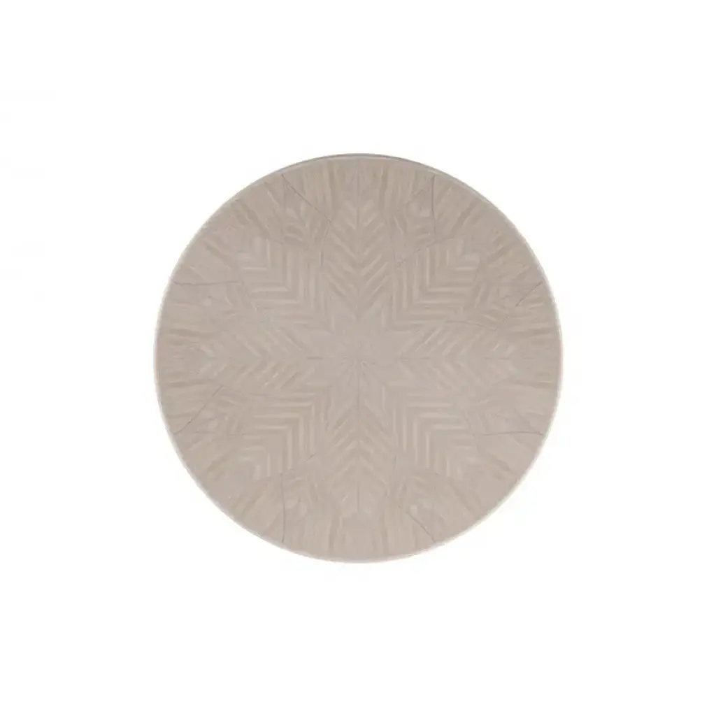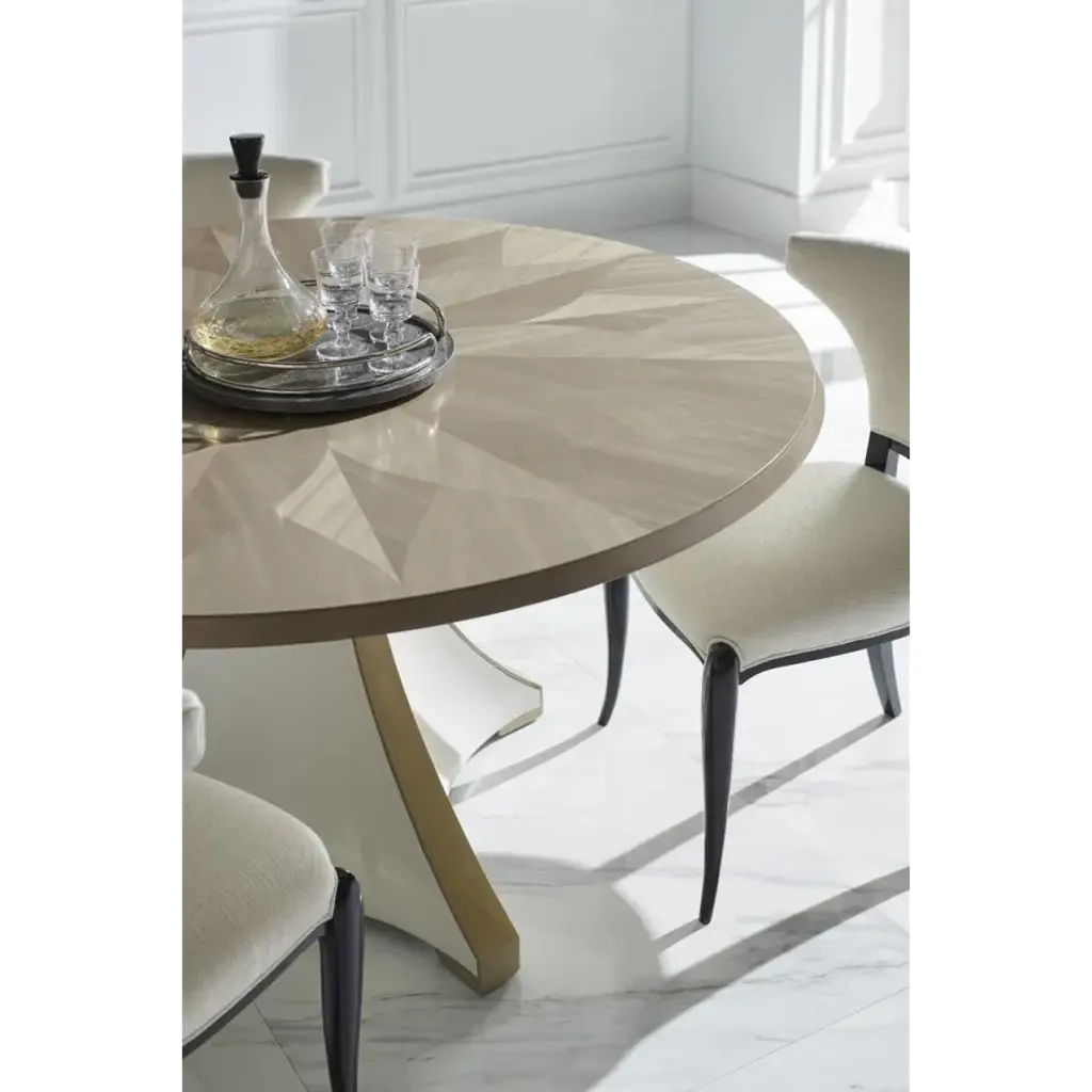 Inspired by the trending use of bold florals in fashion design, this casually elegant dining table features a radiating rosette motif, skillfully crafted from Koto veneers. A pearlescent Moonstone finish illuminates the natural beauty of its linear wood grain and adds a hint of luster, complemented by a sculptural Pearly White base with ribbon-like accents in Majestic Gold paint. A dazzling addition to any dining interior, this table can accommodate up to eight chairs.