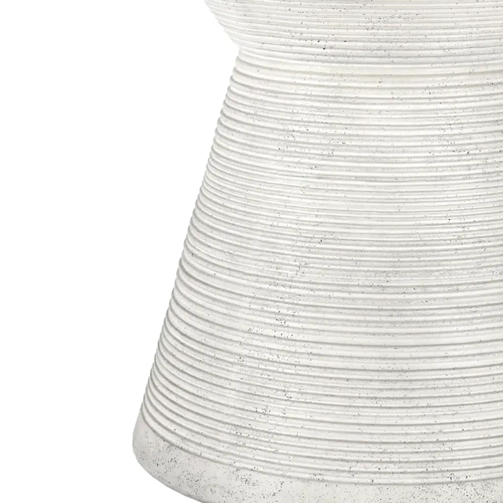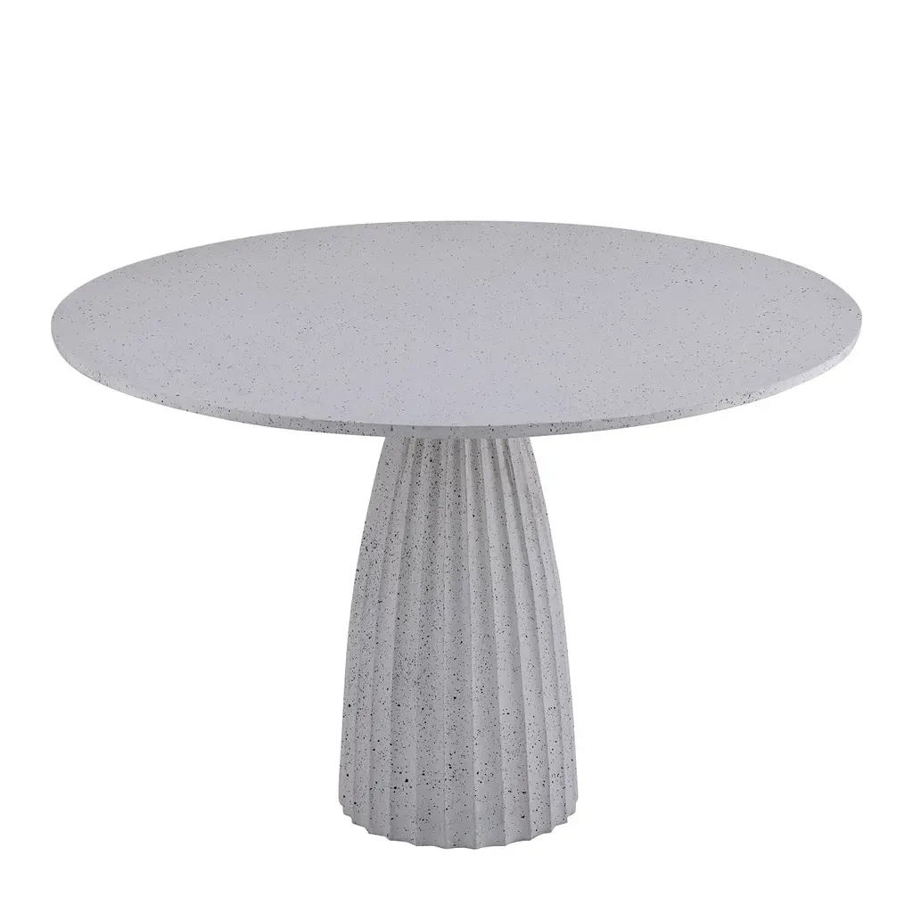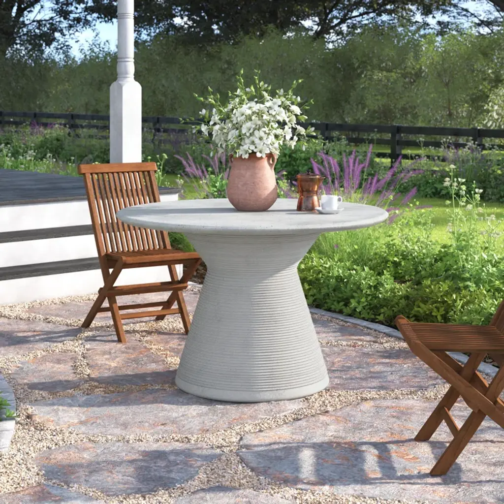 Ridges encircle the pedestal base of this outdoor dining table, adding dimension and texture to an otherwise simple design. Solid concrete construction ensures years of use while a white finish creates a bright, polished effect.